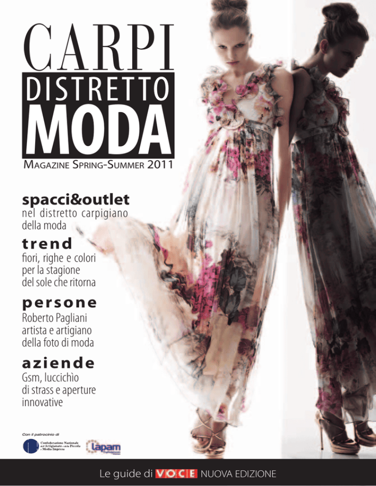 CARPI DISTrETTO MODA MAGAZINE SPRING-SUMMER 2011 spacci&outlet nel distretto carpigiano della moda tren d fiori, righe e colori per la stagione del sole che ritorna p erson e Roberto Pagliani artista e artigiano della foto di moda azien de Gsm, luccichìo di strass e aperture innovative Con il patrocinio di Le guide di NUOVA EDIZIONE www.ean13.it MA DE IN ITA LY Boutique EAN 13 Collection Via Farini, 23 (MO) [email protected] Tel. 059211296 CArpI CArpI DISTrETTO Editoriale DISTrETTO MODA di Florio Magnanini CArpI DISTrETTO www.essent-ial.com [email protected] Nella filosofia del Made in Italy e nell’utilizzo e riutilizzo dei materiali ecocompatibili, l’innovativa ed elegante linea di accessori per la casa ed il tempo libero è Prodotto e distribuito da A.G.C. srl Via G. Pintor 15 - Carpi (MO) - Italia Tel. +39 059 664269 CArpI DISTrETTO MODA MODA e dell’abbigliamento di Carpi incontrano ogni volta che si tenta un’azione collettiva in ambiti come la ricerca, la produzione, la formazione, la promozione sui mercati, si spiegano con questa ridotta consapevolezza di rappresentare davvero un sistema distrettuale e un pilastro imprescindibile dell’intero sistema moda nazionale. Nel suo piccolo, Carpi Distretto Moda intende colmare questa lacuna, con l’ambizione di crescere ino a diventare l’house organ del distretto. Il suo nucleo centrale è dato da quella grande offerta commerciale – mai tradottasi in uno spazio isico – che è la Guida degli spacci e degli outlet, con tutte le informazioni per accedervi. Intorno a questo nucleo, ereditato dalle vecchie edizioni, si è voluto dare spazio anche ad analisi di tendenza, problemi, storie aziendali, igure professionali, specializzazioni, presenze ieristiche. In una parola, a testimonianze su alcuni dei tanti fattori che concorrono alla vita di un territorio dove la moda non è solo il gesto dell’acquisto – in questo caso, conveniente e di qualità – ma anche lavoro, intelligenza, idee, tecnologie, ricerca, fantasia, spirito di iniziativa, immagine. In questa svolta che abbiamo inteso imprimere alla vecchia Guida agli spacci, abbiamo ricevuto il conforto e lo stimolo di due fra le maggiori associazioni datoriali della provincia di Modena, Cna e Confartigianato Lapam, anche nelle rispettive afiliazioni di Federmoda Cna e Lapam Moda. La consueta collaborazione offerta da Globe communication permetterà poi la consultazione e la localizzazione dei vari punti vendita anche sul web. MODA CArpI DISTrETTO A MODA CArpI DISTrETTO ll’origine del distretto carpigiano della moda – del quale questa pubblicazione intende offrire un primo, ampio spaccato – c’è un curioso paradosso. Lo potremmo riassumere così: è un distretto più desiderato e immaginato che consapevolmente realizzato e vissuto. In altri termini, il distretto in questione esiste più nei fatti che nella teoria, più nelle cose che nei pensieri. Poco male, si dirà. Quel che conta, in fondo, è che le aziende e i laboratori esistano per davvero, che aprano spacci e outlet, che le macchine da maglieria funzionino, che le tessiture continuino a smacchinare, che ricamatrici, asolatrici, cucitrici, campioniste, modelliste, magliaie ci siano ancora, che vi siano luoghi dove il loro sapere si forma e si trasmette. Conta, insomma, che sopravviva la lunga linea di storia produttiva, peculiare di Carpi, ereditata dall’immediato dopoguerra e con radici addirittura nella cinquecentesca arte dell’intreccio e della produzione dei cappelli in paglia. Qualche cosa, tuttavia, si perde, nel costituire distretto nella sostanza dimenticandosi un po’ della forma. Si perde in spendibilità verso l’esterno, in prestigio, in autorappresentazione, in forza contrattuale, in peso anche politico. Soprattutto se pensiamo che qui si parla di un settore produttivo nel quale Carpi – con Novi, Concordia, Cavezzo, San Possidonio e con una “periferia” che si estende tra le province di Modena, Mantova e Reggio Emilia – ancora nel 2009, rappresentava il 3,5 per cento dell’intero fatturato nazionale, il 2,2 per cento delle imprese, l’1,5 per cento del numero totale degli addetti, offrendo al mercato non meno di 95 mila modelli l’anno. Le stesse dificoltà che le aziende tessili MODA Quando il design diventa moda CArpI DISTrETTO MODA APRILE 2011 | CARPI DISTRETTO MODA | 5 SINTESI FASHION GROUP - www.annarachele.it In questo numero CARPI DISTrETTO 1 12. GSM REGNO DEGLI STRASS L’azienda che ha rinnovato il settore partendo da un’invenzione MODA 19. IVANA SICA PIERRE Una protagonista carpigiana nella comunicazione della moda MAGAZINE SPRING-SUMMER 2011 24. UNA SCUOLA IN PASSERELLA Le ragazze del Vallauri impegnate nel concorso “Moda al futuro” spacci&outlet nel distretto carpigiano della moda trend fiori, righe e colori per la stagione del sole che ritorna p er so ne Roberto Pagliani artista e artigiano della foto di moda az i ende 26. IL CONTROLLER STORE Paolo Bertolla, gestore di negozi lontani per conto delle aziende Gsm, luccichìo di strass e aperture innovative Con il patrocinio di Le guide di NUOVA EDIZIONE CARPI DISTRETTO MODA ® Supplemento al n. 14 di Voce del 7 aprile 2011 Reg. Trib. di Modena, n. 1177 del 7.10.1993 28. VICTORIA COLEMAN Lo stile pulito ed essenziale per una donna elegante 34-66. GUIDA AGLI SPACCI Acquistare la moda nei luoghi della qualità e della convenienza Direttore responsabile: 68. LA GRANDE MAGLIERIA Antonello Calabrese e l’obiettivo di un ritorno di Carpi alla produzione Grafica e impaginazione: 73. ROBERTO PAGLIANI FOTOGRAFO Artista e creatore di immagine moda dallo studio Image Testi: 78. QUELLI DI GLADIOTEX I fratelli Carnevali, innovatori nel settore del packaging per la moda Florio Magnanini Adriana Vicidomini Dora Malagoli Rossana Caprari, Florio Magnanini, Claudia Rosini Editore: Società editoriale D&F srl via Peruzzi 2C 41012 Carpi tel. 059694050 fax 059 645457 Finito di stampare il 4 aprile 2011 presso Industrie Grafiche Galeati