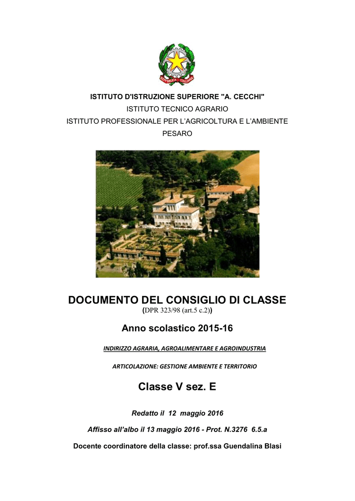 ISTITUTO D'ISTRUZIONE SUPERIORE "A. CECCHI" ISTITUTO TECNICO AGRARIO ISTITUTO PROFESSIONALE PER L’AGRICOLTURA E L’AMBIENTE PESARO DOCUMENTO DEL CONSIGLIO DI CLASSE (DPR 323/98 (art.5 c.2)) Anno scolastico 2015-16 INDIRIZZO AGRARIA, AGROALIMENTARE E AGROINDUSTRIA ARTICOLAZIONE: GESTIONE AMBIENTE E TERRITORIO Classe V sez. E Redatto il 12 maggio 2016 Affisso all’albo il 13 maggio 2016 - Prot. N.3276 6.5.a Docente coordinatore della classe: prof.ssa Guendalina Blasi INDICE GENERALE 1. Composizione del consiglio di Classe p. 3 2. Profilo professionale p. 4 3. Analisi generale della classe p. 4 - Presentazione della classe e suo excursus storico - Prospetto riassuntivo del punteggio crediti della III e IV classe - Attività di recupero 4. Sintesi del percorso formativo p. 7 5. Contenuti disciplinari p. 8 6. Attività curricolari, extracurricolari e integrative p. 8 7. Valutazione p. 13 8. Procedure di svolgimento delle simulazioni delle prove d’esame p. 14 9. Crediti p. 14 10. Attività programmate nel periodo compreso tra la stesura del documento p. 15 finale e l’inizio dell’esame 11. Elenco Allegati dal n°1 al n°19 p. 16 2 1. Composizione del Consiglio di Classe Materia insegnata Docente Religione SCARPETTI GIUSEPPE Letteratura Italiana e Storia BLASI GUENDALINA Lingua Inglese TAGLIALATELA PAOLA Matematica GOSTOLI LUCIANA Produzioni Vegetali LANZA ALFIO Produzioni Animali BARULLI ROBERTA Trasformazione dei Prodotti PERUZZINI IVANA Genio rurale CAMBONI LORENZO Firma dei docenti Economia, Estimo Marketing e CAMPAGNOLI PAOLO Legislazione Gestione dell’ Ambiente e del RAFFAELLI LUCA Territorio Scienze motorie e sportive MONTACCINI SABRINA Esercitazioni Economia, Estimo, Marketing e Legislazione Esercitazioni Gestione Ambiente e Territorio Esercitazioni Genio Rurale – Produzioni vegetali Esercitazioni Trasformazione dei prodotti MORRI ANDREA AVANZOLINI PIETRO TANFULLI STEFANO MASTINI ANNA MARINA 3 2. PROFILO PROFESSIONALE Settore tecnologico: Indirizzo Agraria, agroalimentare e agroindustria; Articolazione: Gestione ambiente e territorio PREMESSA In merito al profilo professionale, all’articolazione del corso di studi ed agli obiettivi educativi formativi, il documento del 15 maggio recepisce quanto esplicitato dal POF con delibera del Collegio Docenti del 11/09/2015 adottato dal Consiglio d’Istituto con delibera del 21/09/2015 e pubblicato sul sito della scuola. 3. ANALISI GENERALE DELLA CLASSE - Presentazione della classe e suo excursus storico All’inizio del secondo biennio la classe era composta da 29 elementi, provenienti in piccola quantità dal biennio del corso E (7 alunni) e il resto da altre sezioni (bienni B,D, i piccola parte F). In seguito a 3 ritiri avvenuti in corso d’anno, al termine della classe terza sono stati scrutinati 26 alunni con una bocciatura; da questo momento il numero si è assestato e non ha subito altre variazioni. La classe attuale dunque conta 25 alunni, di cui 19 maschi e 6 femmine. Due alunni presentano certificazione per Disturbi Specifici dell’Apprendimento. Diciassette sono gli studenti che presentano linearità di curriculum nell’intero corso di studi. La frequenza scolastica è risultata regolare per tutti gli alunni. Un alunno ha presentato frequenza irregolare poiché straniero e soggetto a ricongiungimento familiare in determinati periodi dell’anno. All’inizio del secondo biennio la classe ha avuto bisogno di qualche mese di assestamento dovuto a due fattori determinanti: l’eterogeneità della classe per la provenienza da quattro bienni diversi e la presenza di alcuni studenti non decisi già da subito a frequentare in modo fattivo e necessitanti un serio riorientamento che è avvenuto entro l’interruzione per le vacanze natalizie. Dopo tale avvio la classe ha progressivamente e rapidamente acquisito e consolidato un profilo collaborativo, mostrando interesse e partecipazione molto attive; la condotta si è sempre dimostrata consona, la socializzazione spiccata e produttiva, garantendo una serena convivenza scolastica. Il clima è risultato pertanto collaborativo, aperto al confronto e favorevole ad uno svolgimento regolare delle lezioni. Va rilevato che gli alunni hanno contribuito in maniera propositiva al dialogo educativo e complessivamente a una partecipazione sistematica e fattiva, dimostrando spiccato interesse sia durante le lezioni che nel corso delle attività pratiche, delle uscite didattiche di profilo storico culturale e delle visite aziendali a cui hanno sempre partecipato con vivo interesse. Dal punto di vista del profitto il profilo della classe risulta complessivamente regolare e va sottolineato che alcuni allievi hanno dimostrato di possedere ottime attitudini che hanno messo a frutto affrontando lo studio delle varie discipline con interesse ed impegno attivi e costanti e ciò ha permesso loro il raggiungimento di una preparazione organica e adeguatamente approfondita, a livelli di eccellenza. 4 Per quel che riguarda la composizione del Consiglio di Classe, va rilevato che essa non è rimasta stabile nel corso degli anni, e l’avvicendamento ha interessato i docenti di quattro discipline, come evidenziato nel seguente prospetto: Materie Classe III Classe IV Classe V Inglese Ferri Carganico Taglialatela Matematica Del Bene (titolare in Pierucci Gostoli Diotallevi Pierini Lanza Franca Cirulli Peruzzini maternità). Sani (supplente per quasi tutto l’A.S.) Produzioni vegetali Trasformazione dei prodotti Si è avuto anche un avvicendamento dei docenti delle discipline tecnico-pratiche, come riportato nel seguente prospetto: ESERCITAZIONI DI: Classe III Classe IV Classe V Genio rurale Angelo P. Staffolani Michele Pierelli Stefano Tanfulli Produzioni vegetali Giovanni Licari Stefano Tanfulli (Continuità: Stefano Tanfulli) Trasformazione dei Angelo P. Staffolani Mastini Anna Marina prodotti Economia Estimo (Continuità: Mastini Anna Marina) Angelo P. Staffolani Mastini Anna Marina Andrea Morri Marketi