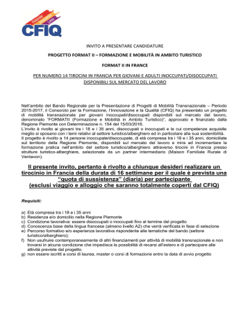 INVITO A PRESENTARE CANDIDATURE PROGETTO FORMAT II – FORMAZIONE E MOBILITÀ IN AMBITO TURISTICO FORMAT II IN FRANCE PER NUMERO 14 TIROCINI IN FRANCIA PER GIOVANI E ADULTI INOCCUPATI/DISOCCUPATI DISPONIBILI SUL MERCATO DEL LAVORO Nell’ambito del Bando Regionale per la Presentazione di Progetti di Mobilità Transnazionale – Periodo 2015-2017, il Consorzio per la Formazione, l’Innovazione e la Qualità (CFIQ) ha presentato un progetto di mobilità transnazionale per giovani inoccupati/disoccupati disponibili sul mercato del lavoro, denominato “FORMATII (Formazione e Mobilità in Ambito Turistico)”, approvato e finanziato dalla Regione Piemonte con Determinazione n. 154 del 15/03/2016. L’invito è rivolto ai giovani tra i 18 e i 35 anni, disoccupati o inoccupati e le cui competenze acquisite meglio si sposano con i temi relativi al settore turistico/alberghiero ed in particolare alla sua sostenibilità. Il progetto è rivolto a 14 persone inoccupate/disoccupate, di età compresa tra i 18 e i 35 anni, domiciliate sul territorio della Regione Piemonte, disponibili sul mercato del lavoro e mira ad incrementare la formazione pratica nell’ambito del settore turistico/alberghiero attraverso tirocini in Francia presso strutture turistico-alberghiere, selezionate da un partner intermediario (Maison Familiale Rurale di Ventavon). Il presente invito, pertanto è rivolto a chiunque desideri realizzare un tirocinio in Francia della durata di 16 settimane per il quale è prevista una “quota di sussistenza” (diaria) per partecipante (esclusi viaggio e alloggio che saranno totalmente coperti dal CFIQ) Requisiti: a) b) c) d) e) Età compresa tra i 18 e i 35 anni Residenza e/o domicilio nella Regione Piemonte Condizione lavorativa: essere disoccupati o inoccupati fino al termine del progetto Conoscenza base della lingua francese (almeno livello A2) che verrà verificata in fase di selezione Percorso formativo e/o esperienza lavorativa rispondente alle tematiche del bando (settore turistico/alberghiero); f) Non usufruire contemporaneamente di altri finanziamenti per attività di mobilità transnazionale e non trovarsi in alcuna condizione che impedisca la possibilità di recarsi all’estero e di partecipare alle attività previste dal progetto. g) non essere iscritti a corsi di laurea, master o corsi di formazione entro la data di avvio progetto Modalità di presentazione delle candidature: I candidati dovranno presentare un plico contenente: • • • • • • l’allegato A debitamente compilato e firmato (è possibile compilarlo a mano); l’allegato B debitamente firmato per presa visione; curriculum vitae in formato europeo sia in lingua italiana che in lingua francese, specificando, secondo il metodo di autovalutazione del Quadro Comune Europeo di Riferimento delle Lingue, la conoscenza della lingua francese. fotocopia di un documento di identità in corso di validità fotocopia del codice fiscale lettera motivazionale in italiano mettendo in evidenza le ragioni che spingono a candidarsi. La mancanza di uno dei suddetti documenti o la carenza dei requisiti richiesti comporterà l'inammissibilità della candidatura. E’ possibile scaricare qui i format per il curriculum vitae europeo: http://europass.cedefop.europa.eu/it/documents/curriculum-vitae/templates-instructions Per procedere all’autovalutazione della propria conoscenza della lingua francese secondo quanto previsto dal Quadro Comune Europeo di Riferimento delle Lingue, si consiglia di visitare questo link: http://europass.cedefop.europa.eu/it/resources/european-language-levels-cefr Si fa inoltre notare che per quanto riguarda la conoscenza della lingua francese, il possesso del requisito minimo verrà valutato sia tramite un questionario scritto che in fase di colloquio e, nel caso in cui si riscontri che l’autovalutazione del candidato non è coerente con la reale conoscenza dichiarata, decadrà immediatamente il diritto ad accedere al progetto. Il plico chiuso dovrà essere consegnato dal giorno 12 aprile 2016 al giorno 12 maggio 2016 al: Consorzio per la Formazione, l’Innovazione e la Qualità, via Trieste 42, 10064 Pinerolo (TO) Nei seguenti orari: dal lunedì al venerdì dalle ore 10.00 alle ore 12.00 e dalle ore 15.30 alle ore 16.30 Sul plico dovrà essere riportata la dicitura “Candidatura progetto FORMAT II IN FRANCE - Mobilità transnazionale Regione Piemonte 2015/2017”, specificando, sempre sul plico, le proprie generalità. Non farà fede il timbro postale. Commissione di selezione La Commissione sarà nominata dal CFIQ e sarà composta da almeno 3 membri con competenze relative al settore turistico/alberghiero, alla conoscenza della lingua francese e all’ambito comunicativo/relazionale. Selezione Per la selezione la Commissione valuterà: • Curriculum vitae • Percorso formativo e sua attinenza al settore specifico • Precedenti esperienze lavorative nel settore specifico • Precedenti esperienze lavorative e/o formative all’estero • Conoscenza linguistica • Aspetti motivazionali e caratteriali La selezione avverrà in tre fasi successive: 1) Valutazione della documentazione contenuta nei plichi pervenuti e giudicati ammissibili. 2) Test scritto di lingua francese. Sommando i punteggi ottenuti dalla valutazione delle due precedenti fasi, verrà stilata la graduatoria dei primi 30 (trenta) candidati che accederanno alla terza fase di selezione, ovvero ai colloqui individuali. 3) Colloqui individuali. Al termine delle tre fasi di selezione verrà redatta la lista definitiva dei partecipanti (ammessi) e una lista di riserva (idonei). Nel caso si dovessero verificare revoche e/o rinunce, si potrà procedere allo scorrimento della graduatoria fino alla copertura dei 14 posti disponibili. La selezione avverrà attraverso i seguenti criteri: VALUTAZIONE DOCUMENTALE (punteggio massimo 30 punti): Criteri Lettera motivazionale Attinenza del percorso di studi al settore di tirocinio Precedenti es