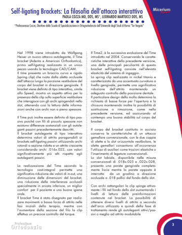 Self-ligating Brackets: La filosofia dell’attacco interattivo PAOLA COZZA MD, DDS, MS*, LEONARDO MARTUCCI DDS, MS *Professoressa Cozza, Direttore della Scuola di Specializzazione in Ortognatodonzia dell’Università degli Studi di Roma "Tor Vergata" Nel 1998 viene introdotto da Wolfgang Heiser un nuovo attacco autolegante, il Time bracket (Adenta e American Orthodontics), primo self-ligating realizzato in un unico pezzo usando la tecnologia CAD/CAM. Il time presenta un braccio curvo e rigido (spring clip) che ruota dalla aletta occlusale dell’attacco lungo la porzione vestibolare del corpo del bracket in direzione gengivale. ll bracket viene definito di tipo interattivo, simile allo Speed, mostra un aspetto attivo per la presenza della clip sulla superficie vestibolare che interagisce con gli archi spingendoli nello slot, ottenendo così la lettura delle informazioni anche con archi non a pieno spessore. Il Time può inoltre essere definito di tipo passivo poiché con fili di piccolo spessore non esistono differenze sostanziali con gli autoleganti passivi precedentemente descritti. ll bracket autolegante di tipo interattivo determina valori di attrito paragonabili ai brackets self-ligating passivi utilizzando archi rotondi a sezione ridotta e un attrito crescente considerando archi .016x.022, con valori significativamente più alti rispetto agli autoleganti passivi. La realizzazione del Time secondo la tecnologia cast-integral permette una significativa riduzione dei valori di in-out, una diminuzione delle dimensioni del bracket, una riduzione delle interferenze occlusali specialmente in arcata inferiore, un miglior comfort per il paziente e una buona igiene orale. Il bracket Time è stato disegnato per realizzare movimenti a bassa forza di attrito nelle fasi iniziali della terapia, mentre con l’aumentare della sezione del filo la clip effettua un precoce controllo del torque. Il Time2, è la successiva evoluzione del Time introdotto nel 2004. Conservando le caratteristiche interattive della precedente versione, una delle principali peculiarità di questo bracket self-ligating consiste nell’elevata elasticità del sistema di ingaggio. La spring clip realizzata in nickel titanio e caratterizzata da una accentuata curvatura a livello gengivale, permette una significativa riduzione dell’attrito mantenendo un adeguato controllo della posizione dentale. Il particolare design della molla determina la richiesta di basse forze per l’apertura e la chiusura mantenendo inoltre la possibilità di sostituzione o rimozione, come nella precedente versione, ed assicurando al contempo una buona stabilità sul corpo del bracket. Il corpo del bracket costituito in acciaio conserva le caratteristiche di un attacco gemellare convenzionale, con le due coppie di alette e lo slot orizzontale vestibolare, le alette gemellari consentono all’occorrenza l’utilizzo di ausiliari come trazioni elastiche o l’inserimento di legature convenzionali. Lo slot labiale, disponibile nelle misure convenzionali di .018x.025 e .022x.028, presenta una parete gengivale completamente liscia mentre la parete opposta è interrotta da un gradino a direzione occlusale a .018 pollici dal fondo dello slot. Con archi rettangolari la clip spinge attivamente i fili nel fondo dello slot aumentando i livelli di lettura delle preinformazioni contenute nel bracket. La possibilità di ottenere diversi livelli di attrito a seconda dell’arco utilizzato e quindi della fase di trattamento rende gli autoleganti attivi/passivi o meglio ad attrito modulabile 3 Self-ligating Brackets: La filosofia dell’attacco interattivo PAOLA COZZA MD, DDS, MS*, LEONARDO MARTUCCI DDS, MS I brackets Time2 contengono tutte le informazioni di primo, secondo e terzo ordine riducendo la necessità di inserire pieghe sugli archi ortodontici. La produzione degli attacchi completamente preinformati secondo varie sistematiche (Roth, New Boston, Bennet McLaughlin) permette al clinico di sfruttare i vantaggi degli autoleganti mantenendo la meccanica della propria filosofia di trattamento. La ritenzione dei brackets Time2 alle strutture dentarie è affidata ad una particolare base cast integral prodotta in un unico pezzo di fusione insieme al resto del corpo del bracket. La tecnologia cast integral permette inoltre una riduzione dei valori di in-out con una diminuzione dell’ingombro vestibolo-palatale, se paragonato ad altre tipologie di brackets self-ligating, e pari a quello di brackets convenzionali. IL CASO CLINICO L’uso dei brackets autoleganti di tipo interattivo come i Time2 ci induce a consigliare una sequenza terapeutica semplice e che rispetti le esigenze biologiche di ogni singola malocclusione, pertanto 4 Fig. 1 la risoluzione di problematiche scheletriche trasversali, verticali e/o sagittali dovrà essere effettuata secondo i classici schemi ortopedici, senza dimenticare i principi fondamentali e le basi di una corretta diagnosi. Nell’adulto dove non è possibile risolvere la malocclusione scheletrica, la terapia ortodontica dovrà essere comunque guidata da una diagnosi corretta e potrà avvalersi di terapie che utilizzano meccaniche a basso attrito. Per tale motivo, tenendo conto del tipo di malocclusione utilizziamo sequenze terapeutiche differenti che permettono di sfruttare le potenzialità delle apparecchiature autoleganti di tipo interattivo; un’adeguata selezione degli archi sembra essere indispensabile e subordinata sia alla fase del trattamento ortodontico che alla gravità e alla tipologia Fig. 2 Fig. 3 Fig. 4 Fig. 5 di malocclusione da trattare. Presentiamo un caso clinico di un paziente adulto con malocclusione di classe I, iperdivergente con affollamento medio-grave in entrambe le arcate (Fig. 1,2,3,4,5). Self-ligating Brackets: La filosofia dell’attacco interattivo PAOLA COZZA MD, DDS, MS*, LEONARDO MARTUCCI DDS, MS Fig. 6 Nelle fasi di allineamento e livellamento abbiamo utilizzato archi a sezione rotonda .012, .014 e .