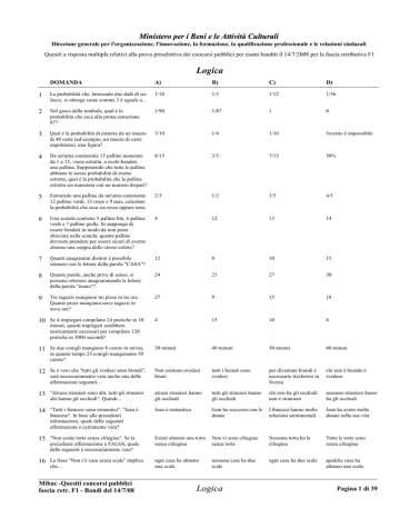 Ministero per i Beni e le Attività Culturali Direzione generale per l'organizzazione, l'innovazione, la formazione, la qualificazione professionale e le relazioni sindacali Quesiti a risposta multipla relativi alla prova preselettiva dei concorsi pubblici per esami banditi il 14/7/2008 per la fascia retributiva F1 Logica DOMANDA A) B) C) D) 1 La probabilità che, lanciando due dadi di sei facce, si ottenga come somma 3 è uguale a... 1/18 1/3 1/12 1/36 2 Nel gioco della tombola, qual è la probabilità che esca alla prima estrazione 87? 1/90 1/87 1 0 3 Qual è la probabilità di estrarre da un mazzo di 40 carte (ad esempio, un mazzo di carte napoletane), una figura? 3/10 1/4 1/10 l'evento è impossibile 4 Da un'urna contenente 15 palline numerate da 1 a 15, viene estratta, a occhi bendati, una pallina. Supponendo che tutte le palline abbiano le stesse probabilità di essere estratte, qual è la probabilità che la pallina estratta sia numerata con un numero dispari? 8/15 3/5 7/15 50% 5 Estraendo una pallina da un'urna contenente 12 palline verdi, 15 rosse e 9 nere, calcolare la probabilità che essa sia rossa oppure nera. 2/3 1/2 3/5 4/5 6 Una scatola contiene 5 palline blu, 6 palline verdi e 7 palline gialle. Si supponga di essere bendati in modo da non poter sbirciare nella scatola: quante palline dovreste prendere per essere sicuri di averne almeno una coppia dello stesso colore? 4 12 13 14 7 Quanti anagrammi distinti è possibile ottenere con le lettere della parola "CASA"? 12 8 10 15 8 Quante parole, anche prive di senso, si possono ottenere anagrammando le lettere della parola "mano"? 24 21 27 30 9 Tre ragazzi mangiano tre pizze in tre ore. Quante pizze mangiano nove ragazzi in nove ore? 27 9 15 18 10 Se 4 impiegati compilano 24 pratiche in 10 minuti, quanti impiegati sarebbero teoricamente necessari per compilare 120 pratiche in 3000 secondi? 4 15 10 6 11 Se due conigli mangiano 8 carote in un'ora, in quanto tempo 25 conigli mangeranno 50 carote? 30 minuti 40 minuti 50 minuti 60 minuti 12 Se è vero che "tutti gli svedesi sono biondi", sarà necessariamente vera anche una delle affermazioni seguenti... Non esistono svedesi bruni tutti i biondi sono svedesi per diventare biondi è necessario trasferirsi in Svezia chi non è biondo è svedese 13 "Alcuni stranieri sono alti, tutti gli stranieri alti hanno gli occhiali". Quindi... alcuni stranieri hanno gli occhiali tutti gli stranieri hanno gli occhiali chi non ha gli occhiali non è straniero nessuno straniero basso ha gli occhiali 14 "Tutti i francesi sono romantici". "Jean è francese". In base alle precedenti informazioni, quale delle seguenti affermazioni è certamente vera? Jean è romantico Jean ha successo con le donne I francesi hanno molte relazioni sentimentali Jean ha avuto molte donne nella sua vita 15 "Non esiste torta senza ciliegina". Se la precedente affermazione è FALSA, quale delle seguenti è necessariamente vera? Esiste almeno una torta senza ciliegina Non vi sono ciliegine senza torta Nessuna torta ha la ciliegina Tutte le torte sono senza ciliegina 16 La frase "Non c'è casa senza scale" implica che... ogni casa ha almeno una scala nessuna casa ha due scale ogni casa ha due scale qualche casa ha almeno una scala Mibac -Quesiti concorsi pubblici fascia retr. F1 - Bandi del 14/7/08 Logica Pagina 1 di 39 Logica DOMANDA A) B) C) D) 17 "E' sbagliato negare che è falso che lo studente non abbia studiato". Basandosi sulla precedente affermazione individuare quale delle seguenti alternative è esatta. Lo studente ha studiato Lo studente è stato verosimilmente punito dal professore La frase proposta non ha senso Non si sa se lo studente abbia studiato 18 "Se Francesco lavora, allora Anna non fa pulizie". Se l'argomentazione precedente è vera, quale delle seguenti è certamente vera? Se Anna fa pulizie, allora Francesco non lavora Se Francesco non lavora, allora Anna fa pulizie Se Anna fa pulizie, allora Francesco lavora Anna e Francesco fanno pulizie insieme 19 Di un gruppo di persone si sa che non è vero che "tutti i maschi sono originari della Sicilia". Se ne può dedurre che in quel gruppo... c'è almeno un maschio che non è originario della Sicilia c'è almeno una persona originaria della Sicilia che non è maschio tutte le persone originarie della Sicilia sono femmine c'è almeno una femmina che non è originaria della Sicilia 20 Se non è vero che "In ogni città italiana c'è almeno un rione in cui tutti i residenti sono stranieri" allora si può affermare che... "c'è almeno una città italiana che ha almeno un residente italiano in ogni rione" "in ogni città c'è almeno un rione in cui tutti i residenti sono italiani" "in ogni città c'è almeno un residente italiano in tutti i rioni" "c'è almeno una città che ha solo residenti italiani in ogni rione" 21 "Non è possibile dubitare della necessità di impedire che Marco non vada in palestra". Qual è il corretto significato della precedente affermazione? E' necessario che Marco E' necessario che Marco L'affermazione proposta E' necessario che la vada in palestra non vada in palestra è priva di un senso palestra impedisca a logico Marco di andarci 22 "Non esiste una piazza senza fontana". Se la precedente affermazione è falsa, quale delle seguenti è necessariamente vera? Esiste almeno una piazza senza fontana Nessuna piazza ha una fontana Tutte le piazze hanno una fontana Tutte le piazze non avevano una fontana 23 "Non è possibile negare la falsità della tesi secondo la quale il cerchio non è una figura perfetta". Qual è il corretto significato della precedente affermazione? Il cerchio è una figura perfetta Non è possibile sapere con certezza se il cerchio sia una figura perfetta o meno Le altre opzioni riportano affermazioni palesemente errate Il cerchio non è una figura perfetta 24 "Strada scivolosa in caso di versamento di olio". Se la precedente affermazione è vera allora è possibile dedurre che... se c'è un versamento di se non c'è un