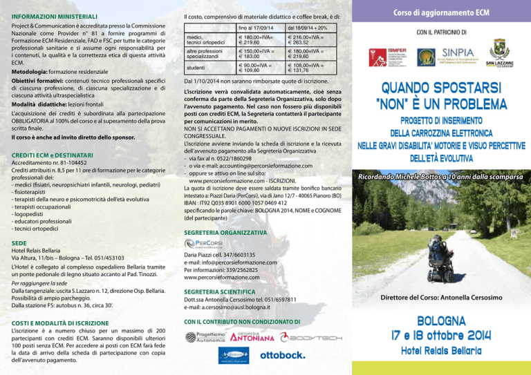 INFORMAZIONI MINISTERIALI Project & Communication è accreditata presso la Commissione Nazionale come Provider n° 81 a fornire programmi di Formazione ECM Residenziale, FAD e FSC per tutte le categorie professionali sanitarie e si assume ogni responsabilità per i contenuti, la qualità e la correttezza etica di questa attività ECM. Metodologia: formazione residenziale Obiettivi formativi: contenuti tecnico professionali specifici di ciascuna professione, di ciascuna specializzazione e di ciascuna attività ultraspecialistica Modalità didattiche: lezioni frontali L’acquisizione dei crediti è subordinata alla partecipazione OBBLIGATORIA al 100% del corso e al superamento della prova scritta finale. Il corso è anche ad invito diretto dello sponsor. Crediti ECM e destinatari Accreditamento nr. 81-104452 Crediti attribuiti n. 8,5 per 11 ore di formazione per le categorie professionali dei: - medici (fisiatri, neuropsichiatri infantili, neurologi, pediatri) - fisioterapisti - terapisti della neuro e psicomotricità dell’età evolutiva - terapisti occupazionali - logopedisti - educatori professionali - tecnici ortopedici sede Hotel Relais Bellaria Via Altura, 11/bis – Bologna – Tel. 051/453103 L’Hotel è collegato al complesso ospedaliero Bellaria tramite un ponte pedonale di legno situato accanto al Pad. Tinozzi. Per raggiungere la sede Dalla tangenziale: uscita S.Lazzaro n. 12, direzione Osp. Bellaria. Possibilità di ampio parcheggio. Dalla stazione FS: autobus n. 36, circa 30’. COSTI E MODALITÀ DI ISCRIZione L’iscrizione è a numero chiuso per un massimo di 200 partecipanti con crediti ECM. Saranno disponibili ulteriori 100 posti senza ECM. Per accedere ai posti con ECM farà fede la data di arrivo della scheda di partecipazione con copia dell’avvenuto pagamento. Il costo, comprensivo di materiale didattico e coffee break, è di: fino al 17/09/14 dal 18/09/14 + 20% medici, tecnici ortopedici € 180,00+IVA= € 219,60 € 216,00+IVA = € 263,52 altre professioni specializzandi € 150,00+IVA = € 183,00 € 180,00+IVA = € 219,60 studenti € 90,00+IVA = € 109,80 € 108,00+IVA = € 131,76 Dal 1/10/2014 non saranno rimborsate quote di iscrizione. L’iscrizione verrà convalidata automaticamente, cioè senza conferma da parte della Segreteria Organizzativa, solo dopo l’avvenuto pagamento. Nel caso non fossero più disponibili posti con crediti ECM, la Segreteria contatterà il partecipante per comunicazioni in merito. NON SI ACCETTANO PAGAMENTI O NUOVE ISCRIZIONI IN SEDE CONGRESSUALE. L’iscrizione avviene inviando la scheda di iscrizione e la ricevuta dell’avvenuto pagamento alla Segreteria Organizzativa - via fax al n. 0522/1860298 - o via e-mail: [email protected] - oppure se attivo on line sul sito: www.percorsieformazione.com - ISCRIZIONI. La quota di iscrizione deve essere saldata tramite bonifico bancario intestato a: Piazzi Daria (PerCorsi), via di Jano 12/7 - 40065 Pianoro (BO) IBAN : IT92 Q035 8901 6000 1057 0469 412 specificando le parole chiave: BOLOGNA 2014, NOME e COGNOME (del partecipante) Corso di aggiornamento ECM con il patricinio di QUANDO SPOSTARSI “NON” è UN PROBLEMA PROGETTO DI INSERIMENTO DELLA CARROZZINA ELETTRONICA nelle gravi DISABILITA’ MOTORIE E VISUO PERCETTIVE dell’età evolutiva Ricordando Michele Bottos a 10 anni dalla scomparsa SEGRETERIA ORGANIZZATIVA percorsi eventi e formazione Daria Piazzi cell. 347/6603135 e-mail: [email protected] Per informazioni: 339/2562825 www.percorsieformazione.com SEGRETERIA SCIENTIFICA Dott.ssa Antonella Cersosimo tel. 051/6597811 e-mail: [email protected] Con il contributo non condizionato di Direttore del Corso: Antonella Cersosimo BOLOGNA 17 e 18 ottobre 2014 Hotel Relais Bellaria venerdì 17 ottobre 8.30 8.50 Registrazione dei partecipanti Apertura dei lavori Antonella Cersosimo Massimo Annicchiarico, Agostino Baruzzi, Francesco Ripa di Meana 9.40 Moderatori: Adriano Ferrari, Anna Poli Presentazione del progetto 9.00 9.15 RELATORI E MODERATORI III Sessione LA CARROZZINA COME STRUMENTO DI INTEGRAZIONE B. Barsanti, N. Battisti, A. Cersosimo, A. Colonna, A. Groppi, M.Pagnoni: UOC Medicina Riabilitativa Infantile, IRCCS Istituto delle Scienze Neurologiche di Bologna A. Baietti: UOC Chirurgia Maxillo Facciale, Osp. Bellaria, AUSL Bologna E. Castelli: Osp. Bambino Gesù, Roma A. Ferrari:Dip. di Scienze biomediche, metaboliche e neuroscienze, Università degli Studi di Modena e Reggio Emilia S. Ferro:Regione Emilia-Romagna A. Goussot: Dip. di Psicologia, Università degli Studi di Bologna M. Malavasi: Centro Regionale Ausili, Az. USL Bologna, AIAS Bologna Onlus P. Maltoni: UORM ASL della Romagna M. Milani: Dip. di Scienze per la Qualità della Vita, Università degli Studi di Bologna M. C. Pesci: Consulente Medico Specialista presso UDGEE, Reggio Emilia A. Pini: UOC Neuropsichiatria Infantile IRCCS Bologna - UILDM Bologna C. Pizzoli: Centro Reg. Disabilità Linguistica Cognitiva, Corte Roncati, Bologna A. Poli: UO Percorsi della Riabilitazione AUSL Bologna S. Signorini: S.C. di Neuropsichiatria Infantile, Centro di Neuroftalmologia dell’età evolutiva, IRCCS Fondazione Ist. C. Mondino, Pavia D. Trioschi: Centro Regionale Ausili, Az. USL Bologna, AIAS Bologna Onlus Conduce Antonella Cersosimo Saluti delle autorità In ricordo di Michele: gli amici I Sessione: IL PROGETTO Antonella Cersosimo Annarosa Colonna Claudia Pizzoli 10.00 La carrozzina elettronica: un percorso verso l’autonomia 10.20 Valutazione del disturbo visivo di origine centrale Sabrina Signorini 10.40 Valutazione del disturbo cognitivo 11.00Discussione 11.20 Coffee break 11.40 Il protocollo di valutazione e addestramento Annarosa Colonna, Benedetta Barsanti 12.00 Dal vissuto della famiglia a quello del bambino SABATO 18 ottobre Maria Cristina Pesci 12.20Discussione 13.00 Pausa pranzo II Sessione L’IMPORTANZA DELLE TECNOLOGIE INNOVATIVE Moderatori: Enrico Castelli, Paola Maltoni 14.00 Innovazioni per la riabilitazione de