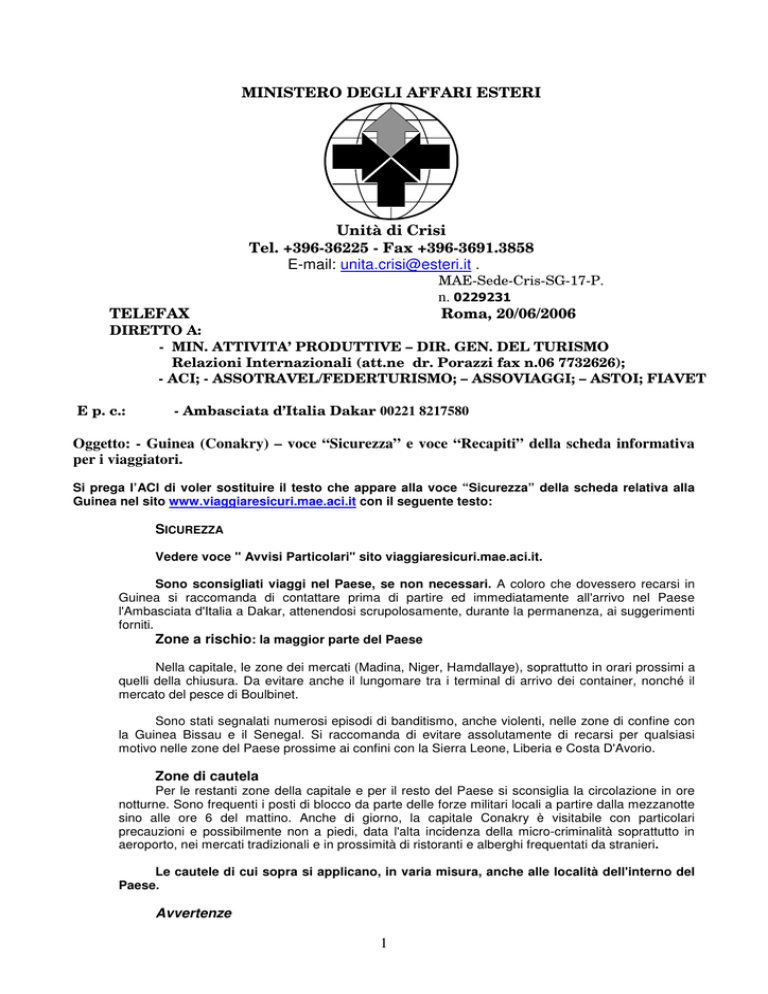 MINISTERO DEGLI AFFARI ESTERI Unità di Crisi Tel. +396-36225 - Fax +396-3691.3858 E-mail: [email protected] . MAE-Sede-Cris-SG-17-P. n. Roma, 20/06/2006 TELEFAX DIRETTO A: - MIN. ATTIVITA’ PRODUTTIVE – DIR. GEN. DEL TURISMO Relazioni Internazionali (att.ne dr. Porazzi fax n.06 7732626); - ACI; - ASSOTRAVEL/FEDERTURISMO; – ASSOVIAGGI; – ASTOI; FIAVET E p. c.: - Ambasciata d’Italia Dakar 00221 8217580 Oggetto: - Guinea (Conakry) – voce “Sicurezza” e voce “Recapiti” della scheda informativa per i viaggiatori. Si prega l’ACI di voler sostituire il testo che appare alla voce “Sicurezza” della scheda relativa alla Guinea nel sito www.viaggiaresicuri.mae.aci.it con il seguente testo: SICUREZZA Vedere voce " Avvisi Particolari" sito viaggiaresicuri.mae.aci.it. Sono sconsigliati viaggi nel Paese, se non necessari. A coloro che dovessero recarsi in Guinea si raccomanda di contattare prima di partire ed immediatamente all'arrivo nel Paese l'Ambasciata d'Italia a Dakar, attenendosi scrupolosamente, durante la permanenza, ai suggerimenti forniti. Zone a rischio: la maggior parte del Paese Nella capitale, le zone dei mercati (Madina, Niger, Hamdallaye), soprattutto in orari prossimi a quelli della chiusura. Da evitare anche il lungomare tra i terminal di arrivo dei container, nonché il mercato del pesce di Boulbinet. Sono stati segnalati numerosi episodi di banditismo, anche violenti, nelle zone di confine con la Guinea Bissau e il Senegal. Si raccomanda di evitare assolutamente di recarsi per qualsiasi motivo nelle zone del Paese prossime ai confini con la Sierra Leone, Liberia e Costa D'Avorio. Zone di cautela Per le restanti zone della capitale e per il resto del Paese si sconsiglia la circolazione in ore notturne. Sono frequenti i posti di blocco da parte delle forze militari locali a partire dalla mezzanotte sino alle ore 6 del mattino. Anche di giorno, la capitale Conakry è visitabile con particolari precauzioni e possibilmente non a piedi, data l'alta incidenza della micro-criminalità soprattutto in aeroporto, nei mercati tradizionali e in prossimità di ristoranti e alberghi frequentati da stranieri. Le cautele di cui sopra si applicano, in varia misura, anche alle località dell'interno del Paese. Avvertenze 1 - Si fa presente che nel Paese non è presente una rappresentanza diplomaticoconsolare italiana. L’Ambasciata d’Italia in Senegal (Dakar) è competente territorialmente anche per la Guinea. In caso di necessità l’assistenza ai nostri connazionali che si trovano nel Paese viene comunque assicurata dall’Ambasciata francese presente a Conakry (vedi Recapiti).” - Si consiglia di evitare la frequentazione di locali notturni che, essendo spesso punto di ritrovo della microcriminalità, potrebbero essere fonte di problemi con le Forze dell'ordine locali. Si raccomanda di evitare i luoghi particolarmente affollati fuori della capitale. Si consiglia inoltre di avere con sé una fotocopia dei documenti d'identità, conservando gli originali ed i biglietti di viaggio in un luogo sicuro. - Non fidarsi di guide o accompagnatori che eventualmente offrissero i propri servizi: è preferibile farsi accogliere in aeroporto dal personale appositamente messo a disposizione dall'albergo, da familiari o da conoscenti. - Si raccomanda di registrare i dati relativi al viaggio che si intende effettuare in Guinea sul sito: www.dovesiamonelmondo.it Consigli di comportamento durante la permanenza I reati contro la morale ed il traffico di stupefacenti sono puniti con pene molto severe, soprattutto quando coinvolgono cittadini stranieri. La Guinea applica la legislazione internazionale in materia di lotta agli stupefacenti. E' proibito fotografare o filmare luoghi pubblici, in particolare l'aeroporto e le zone militari e, anche dove permesso, lo scatto di fotografie e le riprese sono spesso osteggiati dalla popolazione. Si raccomanda la massima attenzione in relazione a possibili offerte di compravendita di metalli e minerali preziosi (oro/diamanti). Sono frequenti i casi di truffa con conseguenze anche sul piano giudiziario e lunghi periodi di detenzione preventiva. Si prega inoltre l’ACI di voler sostituire i dati della voce “Recapiti” con i seguenti dati: Ambasciata d’Italia a Dakar (Senegal): Indirizzo: Rue Alpha Achamiyou Tall - c.p.18524 - B.P.348 Tel: 00221 8220076-8221610-8221471 Fax: 00221 8217580 cell. di reperibilita': 00221 6381895 (attivo nelle ore di chiusura degli uffici per casi d'emergenza). satellitare :00874 761848250-251 E-mail: [email protected] Ambasciata di Francia presente in Guinea: Boulevard du Commerce - BP 373 - Conakry- GUINEE Tel: [ 0024] 30 47 10 00 Fax : [00224] 30 47 10 15 /22 Internet : http://www.ambafrance-gn.org . Si sarà grati per la cortese diffusione. Il Capo dell’Unità di Crisi Cons. Amb. Elisabetta Belloni 2