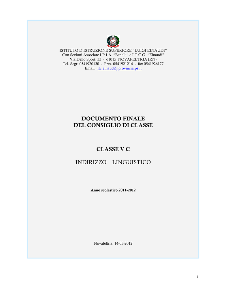 ISTITUTO D’ISTRUZIONE SUPERIORE “LUIGI EINAUDI” Con Sezioni Associate I.P.I.A. “Benelli” e I.T.C.G. “Einaudi” Via Dello Sport, 33 - 61015 NOVAFELTRIA (RN) Tel. Segr. 0541920130 - Pres. 0541921214 - fax 0541926177 Email : [email protected] DOCUMENTO FINALE DEL CONSIGLIO DI CLASSE CLASSE V C INDIRIZZO LINGUISTICO Anno scolastico 2011-2012 Novafeltria 14-05-2012 1 Presentazione dell’Istituto L’I.I.S., articolato complessivamente in 8 indirizzi di studio, è situato in posizione centrale rispetto ad una utenza che proviene dai comuni delle province di Pesaro-Urbino, di Forlì/Cesena, di Rimini e dalla Repubblica di San Marino. L’ampiezza del territorio (circa 600 km. quadrati) e la sua frammentarietà determinano notevoli difficoltà nella gestione di alcuni servizi, che incidono inevitabilmente sulla vita scolastica, in particolare i trasporti che hanno comportato la necessità della riduzione dell’orario scolastico. D’altra parte la centralità geografica dell’Istituto favorisce e valorizza la sua funzione specifica di luogo di saperi e di modelli culturali con iniziative, occasioni formative, momenti di apprendimento svolte anche in collaborazione con gli Enti di governo del territorio. Finalità educative Obiettivo della Scuola è favorire nei giovani un atteggiamento di apertura nei confronti della realtà, globalmente intesa. Si tratta di stimolare la naturale disposizione della persona a porsi domande rispetto a ciò che incontra, a partire dalla realtà più vicina, in cui affonda le proprie radici, fino agli orizzonti nazionali ed europei, facendo così lievitare quello spirito di curiosità e di coscienza critica che, insieme alla capacità di scelta, costituisce il tratto caratteristico della persona libera. La scuola realizza le proprie finalità attraverso la valenza formativa delle discipline di insegnamento e le attività integrative e complementari (orientamento, educazione alla salute, attività musicale, visite e viaggi d’istruzione, teatro, attività sportive, ecc.) Corsi Dall’anno scolastico 2010/2011, per effetto della revisione dell’assetto ordinamentale, organizzativo e didattico del sistema scolastico nazionale, i corsi del precedente ordinamento sono confluiti nei nuovi indirizzi, come risulta dal seguente prospetto: Corsi del precedente ordinamento Corsi del nuovo ordinamento Liceo scientifico Linguistico Moderno Liceo scientifico Liceo linguistico Biologico-Brocca I.G.E.A Geometri Chimica, materiali e biotecnologie articolazione “biotecnologie sanitarie” Amministrazione, finanza e marketing Costruzioni, ambiente e territorio Operatore meccanico-termico Produzioni industriali e artigianali Tecnico delle industrie meccaniche Operatore elettrico-elettronico Produzioni industriali e artigianali Tecnico delle industrie elettriche Operatore della gestione aziendale Servizi commerciali (a.s. 2010/2014) Tecnico della gestione aziendale Operatore dell’impresa turistica Tecnico dei servizi turistici Servizi per l’enogastronomia e l’ospitalità alberghiera articolazione “accoglienza turistica 2 La sostanziale omogeneità fra le discipline del biennio degli indirizzi IGEA, Geometri, Linguistico moderno e Biologico facilita il passaggio da un corso all’altro di studi. Per i corsi IGEA, Geometri, Biologico Brocca e Linguistico moderno è prevista l’esperienza di scuolalavoro, uno stage presso aziende e studi professionali rivolto agli alunni delle classi IV durante il quale l’allievo ha modo di utilizzare le proprie conoscenze e di accostarsi ai problemi reali dell’ambito professionale per trovarvi conferma o rettifica dei propri orientamenti. L’indirizzo Geometri e quello Biologico prevedono nel triennio l’”Area di progetto” in cui alcune ore curricolari vengono destinate ad attività di ricerca su un argomento concordato dal consiglio di classe, svolta anche in maniera interdisciplinare. L’Istituto è stato abilitato a rilasciare la “Patente europea di informatica”(ECDL), ampliando così le opportunità di servizi per alunni e cittadini .Già da alcuni anni si effettuano corsi di approfondimento della lingua inglese con esame finale e certificazione esterna e corsi FSE e IFTS. Caratteri specifici dell’indirizzo di studi L’indirizzo Linguistico Moderno è stato attivato, presso l’I.T.C. “L. Einaudi” di Novafeltria, nell’a.s.1984/85 (D.M. 30/07/84) come Progetto di sperimentazione autonoma. Il corso si configura come un percorso di tipo liceale che intende far acquisire una cultura generale solida e completa, attraverso un piano di studi equilibrato che rivolge un’attenzione particolare alle lingue straniere (francese, inglese, tedesco e spagnolo) e alle materie umanistiche (italiano, storia, filosofia, storia dell’arte), senza trascurare l’ambito matematico-scientifico, arricchito anche dalle attività del laboratorio di informatica e di chimica. L’apprendimento delle lingue straniere è facilitato dalle attività che si svolgono nel laboratorio linguistico. L’area umanistica è caratterizzata dall’integrazione e arricchimento reciproco degli insegnamenti d'italiano, storia , storia dell’arte e filosofia e da un costante richiamo alla realtà sociale, politica ed economica attraverso il diritto e la geografia. L’area delle lingue straniere è caratterizzata da: • Possibilità di scegliere tra tedesco e spagnolo come terza lingua. • Presenza, in tutti e cinque gli anni, del madrelinguista che facilita la conversazione in lingua straniera e, nello stesso tempo, aiuta a correggere e migliorare le impostazioni fonetico-intonative • Realizzazione di gemellaggi linguistici che consentono agli studenti di approfondire la loro conoscenza linguistica, di mettersi in contatto diretto con le civiltà dei paesi stranieri, di instaurare e mantenere rapporti con ragazzi europei. • Possibilità per gli studenti di seguire corsi pomeridiani di lingua inglese per accedere ad esami di certificaz