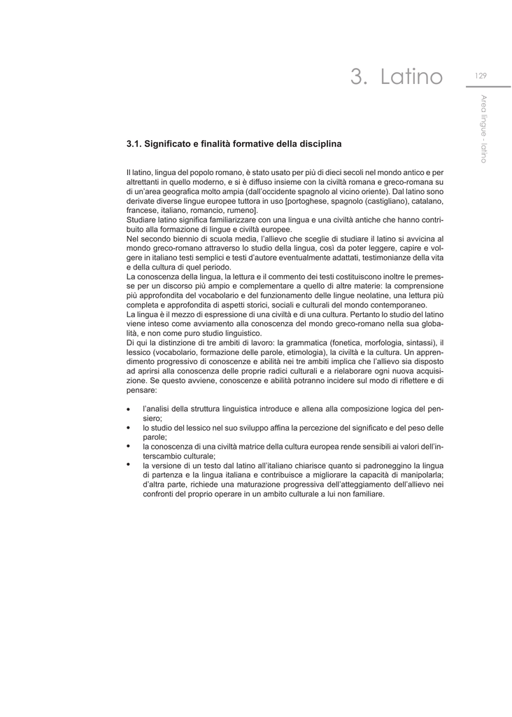 3. Latino 129 Area lingue - latino dimento progressivo di conoscenze e abilità nei tre ambiti implica che l’allievo sia disposto pensare: • • • • l’analisi della struttura linguistica introduce e allena alla composizione logica del pen siero; parole; la conoscenza di una civiltà matrice della cultura europea rende sensibili ai valori dell’in terscambio culturale; di partenza e la lingua italiana e contribuisce a migliorare la capacità di manipolarla; 130 Area lingue - latino Lessico Morfologia e sintassi dice di arrivo. La civiltà e la cultura Il riconoscimento di elementi di continuità e di discontinuità tra passato e presente. Decifrare Comprendere • • • Interpretare Attualizzare • al lessico); • • riconoscimento di elementi di continuità e discontinuità tra passato e presente (nella civiltà e nella cultura). 131 petenza di base e i processi relativi alle tre aree di studio. In calce alla tabella viene presen Area lingue - latino tenze di base delle tre aree. mentale sono demandate a documenti successivi complementari. Figura 17 Modello di competenza per il latino 3° ciclo Processi chiave Decifrare Lessico Lettura e prosodia. Ambiti di competenza Morfologia Declinazione: sintassi radice e desinenze. Coniugazione: tema e desinenze. Civiltà e cultura Comprendere Interpretare Attualizzare Significato della parola latina: parti variabili e invariabili. Catalogazione delle voci nel vocabolario. Traduzioni italiane possibili. Traduzione italiana pertinente al contesto. Legame etimologico tra parole latine e italiane. La lingua latina come mezzo per accedere al mondo romano e greco-romano. Nome, aggettivo, pronome: casi e funzioni logiche. Verbo: modo tempo persona numero; relazioni logiche. Preposizioni: reggenze. Avverbi: funzioni logiche. Congiunzioni: funzioni nell'articolazione della frase e del periodo. Riconoscimento dei gruppi logici. Articolazione delle funzioni logiche con o senza preposizioni. Ricerca delle strutture logiche italiane corrispondenti alle funzioni logiche del testo latino. Riconoscimento delle implicazioni a livello di scelte lessicali e morfologiche del contesto storico-culturale. Analisi degli elementi di continuità e discontinuità tra civiltà antica e mondo contemporaneo. Consapevolezza delle radici culturali. Definizione del contesto Nomi di personaggi storici e nomi comuni propri della storico-culturale cui rimandano gli elementi lessicali civiltà antica. evidenziati. La versione di un testo da un codice lontano nel tempo ad un codice contemporaneo (nel 132 Area lingue - latino a) saper combinare le conoscenze del codice di partenza (lingua e vocabolario) e del il suo pensiero in una lingua non sua. • ta lettura sia per dare risposte mature a problemi dell’uomo che attraversano i secoli; • seriamente coscienti della propria identità culturale; • tendono invece a ridurlo a puro (s)oggetto di consumo. (giornate o settimane con argomenti interdisciplinari) si possono annoverare i seguenti: • • • • • • • tecnologiche. 133 Area lingue - latino documenti successivi complementari l’enunciazione dettagliata. Morfologia adeguati privi di subordinazione mediante il congiuntivo. Conoscenze di parti invariabili del discorso indispensabili alla comprensione dei principali complementi. Sintassi aree semantiche. rie per la versione dei testi. pressi Sapere servirsi delle conoscenze lessicali sia per la versione precisa dei testi dal latino in pevole e meditata del presente. 134 Area lingue - latino contribuire all’unisono all’organizzazione logica del pensiero e all’operazione del tradurre. In particolare: • le conoscenze e abilità linguistiche lavorano sulla logica del pensiero e rendono più • le conoscenze e abilità di lessico contribuiscono ad arricchire lo spettro espressivo dell’allievo e dargli la possibilità di cogliere meglio il valore dei discorsi altrui; le conoscenze e abilità di civiltà e cultura da un lato contribuiscono ad evitare che l’al • dall’altro dovrebbero stimolare la sua curiosità verso i saperi depositati dal tempo nel crogiuolo della tradizione. L’operazione del tradurre rappresenta il luogo privilegiato di osservazione delle compe sibile al lettore di oggi. Le metodologie di insegnamento impiegate saranno orientate a promuovere i seguenti at teggiamenti negli studenti: • • • • • • mezzi per una migliore comprensione del pensiero altrui e una migliore espressione del proprio; aprirsi alla conoscenza del passato per leggere meglio il presente; dialogo tra culture contemporanee; riappropriarsi del gusto della scoperta; agiscano sul modo di essere. ragioni interne). delle civiltà e delle culture del mondo mediterraneo in particolare e dell’Europa in generale; mento delle conoscenze grammaticali e lessicali e logiche della lingua italiana e delle lingue possa trasmettere il suo messaggio a distanza di secoli in un codice diverso. Chi traduce comunicati dal testo di partenza. l’analisi dell’errore deve contribuire non soltanto ad una co 135 Area lingue - latino generale. l’applicazione del ragionamento selettivo appreso con le procedure rete. L’associazione di messaggi verbali e non verbali nell’ambito della civiltà antica allena a ma a catalogarla secondo attendibilità e pertinenza. il meditare sul valore di una buona conoscenza della lingua e del les occorre innanzitutto riconoscere nella lingua una competenza occorre comprendere la necessità di chiara e concisa.