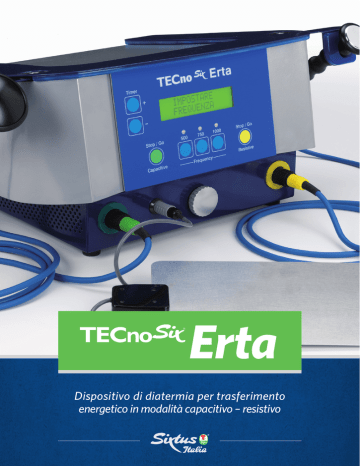 Erta Dispositivo di diatermia per trasferimento energetico in modalità capacitivo – resistivo Erta Il dispositivo Erta rappresenta una importante innovazione in campo tecnologico terapeutico grazie alle caratteristiche di costruzione e funzionamento che lo differenziano da altri dispositivi. Dispositivo di diatermia per trasferimento energetico in modalità capacitivo – resistivo. UTILIZZA IL BREVETTO: GWC (Generation Waveform Control): generazione e controllo della forma d’onda sinusoidale. Il vantaggio del sistema si concretizza in specifici concetti di ricerca che si esplicano sia nella metodologia applicativa che nella realizzazione degli strumenti di lavoro quali ad esempio: tmodalità di erogazione sinusoidale alternata GWC. tpossibilità di verificare in tempo reale la quantità di potenza (espressa in Watt) trasferita al paziente. ttre diverse frequenze di lavoro (500 KHz, 750 KHz e 1000 KHz) tselettività di trasmissione tottima dissipazione superficiale del calore MODALITÀ DI LAVORO Le modalità di lavoro utilizzate sono due: La “modalità dinamica ad elettrodo isolato capacitivo” svolge un’azione attiva sui tessuti molli, a ricco contenuto in acqua, quali i muscoli, il sistema veno – linfatico etc. Essa permette, grazie al sistema di alternanza di campi elettrici a intensità differente sullo stesso elettrodo e alla possibilità di accedere a tre diverse frequenze di lavoro (500 KHz, 750 KHz e 1000 KHz), di essere superiore alla tecnica classica di lavoro capacitivo. Gli effetti benefici delle tecniche con “metodo dinamico ad elettrodo isolato capacitivo” e “metodo statico ad elettrodo non isolato resistivo” sono apprezzabili anche con un basso livello energetico di erogazione. La “modalità statica ad elettrodo non isolato resistivo”, invece, svolge un’azione efficace su tutti i tessuti resistenti, a basso contenuto d’acqua, quali, ossa, tendini, cartilagini etc. Questa tecnica di lavoro, grazie all’utilizzo di un elettrodo in grado di aumentare la dissipazione del calore superficiale cutaneo, consente di lavorare con potenze più elevate che non con un elettrodo utilizzante la classica tecnica resistiva ed anche in questo caso è possibile accedere a tre diverse frequenze di lavoro (500 KHz, 750 KHz e 1000 KHz). La metodica di lavoro in tal modo risulta essere ottimale in termini di efficienza di risultato. CARATTERISTICHE Tecnologia e metodo si affiancano in maniera ottimale nel sistema Il dispositivo Erta è dedicato a chiunque si occupi di benessere e salute: Centri di terapia riabilitativa, traumatologia e traumatologia sportiva e Poliambulatori Erta Le caratteristiche di Erta sono di notevole interesse per l’operatore che voglia avere a sua disposizione uno strumento valido che lo coadiuvi nel suo lavoro, aumentandone la professionalità, la competenza e le abilità tecniche. La garanzia di innovazione di questo strumento deriva dalla ricerca nella scelta di componentistica tecnologicamente avanzata, sia inerente all’interfaccia con l’operatore che nella gestione della potenza trasmessa. -PCJFUUJWPEFMEJTQPTJUJWPÒPUUJNJ[[BSFMBUSBTNJTTJPOFFOFSHFUJDBBJUFTTVUJDPSQPSFJ OFMMBTJDVSF[[BQFSMPQFSBUPSFFQFSJMTPHHFUUPTPUUPQPTUPBUSBUUBNFOUPJOUFSNJOJEJ EFFICACIA RAPIDITÀ di risultato SEMPLICITÀ di utilizzo BIOSTIMOLAZIONE Ciò che si determina è una potente biostimolazione grazie alle movimentazioni energetiche endocellulari, una iperemia capillare e pericapillare, un aumento della ossigenazione dei tessuti, una accelerazione del drenaggio linfatico, una rivascolarizzazione di aree ischemiche soggette a danno biologico. SICUREZZA Le tecniche applicative consentono di ottenere processi esotermici e/o endotermici senza produzione di effetti collaterali e nella piena sicurezza anche dell’operatore, inoltre consentono un lavoro di elevatissima selettività sulle diverse zone corporee e componenti tessutali, evitando in maniera ottimale l’elevata dispersione energetica durante le fasi di trattamento. SELETTIVITÀ nell’azione di trattamento sulle differenti zone del corpo DOTAZIONE DI Il dispositivo è stato realizzato per ottimizzare la modalità di erogazione energetica con metodo Capacitivo-Resistivo. Le caratteristiche costruttive del dispositivo consentono inoltre di filtrare ed eliminare le componenti armoniche garantendo un segnale pulito e privo di interferenze che possono influenzare negativamente l’efficacia del trattamento. Le modalità applicative e le fasi di lavoro sono intuitive e regolabili a seconda delle zone di lavoro; le fasi di lavoro e la finalità dei trattamenti sono variabili attraverso l’azione interattiva con il dispositivo ed il particolare allineamento/orientamento con cui possono essere applicati gli elettrodi attivi, rispetto alla placca neutra di ritorno, durante tutte le fasi di trattamento (corrette geometrie). TECNICA DI LAVORO EJUSBTGFSJNFOUPFOFSHFUJDP$"1"$*5*70ű3&4*45*70 basa la propria attività sul movimento alternato delle cariche elettriche e quindi degli ioni molecolari. La movimentazione delle cariche elettriche è generata dall’attrazione e repulsione delle stesse verso o dall’elettrodo attivo mobile che, di conseguenza, genera un incremento della temperatura all’interno delle strutture biologiche. Erta 1 cavo di alimentazione; 1 generatore di energia biocompatibile; 1 manipolo porta elettrodo isolato dotato di cavo; 1 manipolo porta elettrodo non isolato dotato di cavo; 1 elettrodo isolato circolare Ø 35 mm per trattamento capacitivo; 1 elettrodo isolato circolare bombato Ø 55 mm per trattamento capacitivo; 1 elettrodo isolato circolare Ø 75 mm per trattamento capacitivo; 1 elettrodo non isolato circolare Ø 35 mm per trattamento resistivo; 1 elettrodo non isolato circolare Ø 55 mm per trattamento resistivo; 1 elettrodo non isolato circolare Ø 75 mm per trattamento resistivo; 1 piastre neutre di ritorno piatte rettangolari rigide in acciaio inox; 1 manuale d’uso e manutenzione; 1