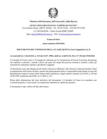 Ministero dell’Istruzione, dell’Università e della Ricerca LICEO GINNASIO STATALE “CORNELIO TACITO” Via Giordano Bruno, 400195 ROMA Tel. 06/39733186 - FAX 06/39737428 C.F. 80226930586- Codice Scuola RMPC220009 Mail: [email protected] – PEC: [email protected] Esame di Stato Anno scolastico 2015/2016 DOCUMENTO DEL CONSIGLIO DELLA CLASSE QUINTA Liceo Linguistico sez. B Ai sensi dell’art. 5 del D.P.R. n. 323 del 23.07. 1998 e dell’art. 6 dell’O.M. Prot. N° 252 del 19/04/2016 il Consiglio di Classe entro il 15 maggio ha elaborato per la Commissione di Esame il presente documento che esplicita i contenuti, i metodi, i mezzi, gli spazi ed i tempi del percorso formativo, nonché i criteri, gli strumenti di valutazione adottati e gli obiettivi raggiunti. Al documento sono stati allegati gli atti relativi alle prove effettuate e alle iniziative realizzate durante l’anno in preparazione dell’Esame di Stato, nonché alla partecipazione attiva e responsabile degli alunni ai sensi del Regolamento recante le norme dello Statuto delle studentesse e degli studenti emanato con D.P.R. n. 249 del 24.06.1998, modificato dal D.P.R. 21.11.2007 n. 235. Prima della elaborazione del testo definitivo del documento, il Consiglio di Classe ha consultato, per eventuali proposte o osservazioni, la componente studentesca e quella dei genitori. Il documento è stato affisso all’albo dell’istituto. 1 INDICE 1. Presentazione della scuola, sue strutture e attrezzature................................................3 2. Elenco docenti....................................................................................................................4 3. La classe: elenco e profilo..................................................................................................5 4. Attività e iniziative della classe.........................................................................................6 5. Metodo di studio e di insegnamento.................................................................................7 6. Strumenti di valutazione...................................................................................................7 7. Obiettivi formativi, cognitivi e disciplinari comuni........................................................8 8. Relazioni per materia (a cura dei singoli docenti)...........................................................9 a. Libri di testo adottati b. Obiettivi perseguiti c. Metodo d'insegnamento d. Strumenti di verifica e valutazioni e. Contenuti (cfr. i programmi allegati, da confermare al termine dell'anno scolastico) f. Giudizio della classe 9. Foglio firme........................................................................................................................28 10. Allegati................................................................................................................................29 a. Programmi svolti b. Simulazioni della seconda e terza prova c. Griglie di valutazione d. Moduli CLIL e. PDP 1. Presentazione dell' Istituto, sue strutture e attrezzature 2 Il Liceo “Cornelio Tacito” si articola in una sede centrale e in una succursale; in entrambe sono attivi gli indirizzi di studio classico e linguistico. Per realizzare l’obiettivo previsto dall’art. 1 comma 2 dello schema di regolamento in materia di autonomia delle istituzioni scolastiche e il successo formativo dello studente, in linea con le sue potenzialità, la scuola ha elaborato una serie di interventi e progetti sul piano organizzativo, didattico, curricolare ed extra curricolare, esplicitati nel POF. I Docenti cercano quanto possibile di aggiornare la didattica e di valorizzare al massimo gli specifici ambiti di comunicazione delle nuove generazioni. La prevenzione del disagio si basa su un confronto costruttivo col mondo degli adolescenti e con le istituzioni per tentare di evitare gli insuccessi scolastici e orientare gli studenti in modo consapevole dopo il diploma. Asse culturale portante del POF è la valorizzazione e l’aggiornamento degli studi classici, nella consapevolezza dell’importanza del passato e della memoria storica nella costruzione del futuro, e degli studi linguistici, che con l’acquisizione della conoscenza di tre lingue straniere, consentono allo studente di esercitare attivamente la cittadinanza europea e di realizzare una formazione interculturale. Lo studio delle tre lingue straniere, caratterizzato da una metodologia di insegnamento laboratoriale, si sviluppa all’interno di una dimensione formativa allargata, assicurata dalle discipline a valenza letterario-artistico, storico-filosofica e matematico-scientifica. La qualità dell’insegnamento linguistico è peraltro accresciuta dall’apporto didattico di docenti di conversazione di lingua madre francese, inglese e spagnola. Particolare cura, infine, è stata posta nell’organizzazione dei corsi di recupero e degli sportelli pomeridiani per sostenere gli studenti al fine di colmare il più possibile le loro carenze. Quasi tutte le aule della sede centrale del Liceo sono fornite di un videoproiettore e di uno schermo; i docenti hanno a loro disposizione dei PC utilizzabili previa prenotazione. Il Liceo “C. Tacito” si avvale delle seguenti strutture ed attrezzature: Biblioteca Laboratorio di scienze fisiche e chimiche. Laboratorio di Informatica Palestra Campo da pallavolo/pallacanestro. 3 2. Elenco docenti DISCIPLINA DOCENTE ANZIANITA' NELLA CLASSE RELIGIONE DI MARCO ALESSANDRO 1 ANNO ( V° ANNO) ITALIANO SIMONELLI ANTONIETTA 5 ANNI FRANCESE SESTILI ROSA MARIA 5 ANNI INGLESE GAIA LINDA 4 ANNI (I°-II°-IV°-V° ANNO) SPAGNOLO CELLITTI ANTONELLA 5 ANNI CONVERSAZIONE FRANCESE BOUTONNET CLAIRE HELENE 3 ANNI ( III°-IV°-V° ANNO) CONVERSAZIONE INGLESE ANGELILLO MARIA 1 ANNO ( V° ANNO) CONVERSAZIONE SPAGNOLO ESQUIVEL LUCIA 1 ANNO (V° ANNO) STORIA E FILOSOFIA CRAMAROSSA GIULIA 3 ANNI ( III°-IV°-V° ANNO) MATEMATICA CORTESE CATERINA 3 ANNI ( II°-IV°-V° ANNO)