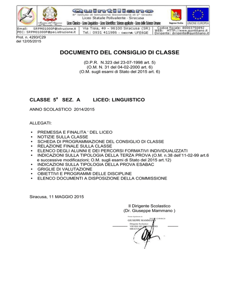 Prot. n. 4293/C29 del 12/05/2015 DOCUMENTO DEL CONSIGLIO DI CLASSE (D.P.R. N.323 del 23-07-1998 art. 5) (O.M. N. 31 del 04-02-2000 art. 6) (O.M. sugli esami di Stato del 2015 art. 6) CLASSE 5a SEZ. A LICEO: LINGUISTICO ANNO SCOLASTICO 2014/2015 ALLEGATI: PREMESSA E FINALITA ‘ DEL LICEO NOTIZIE SULLA CLASSE SCHEDA DI PROGRAMMAZIONE DEL CONSIGLIO DI CLASSE RELAZIONE FINALE SULLA CLASSE ELENCO DEGLI ALUNNI E DEI PERCORSI FORMATIVI INDIVIDUALIZZATI INDICAZIONI SULLA TIPOLOGIA DELLA TERZA PROVA (O.M. n.38 dell’11-02-99 art.6 e successive modificazioni; O.M. sugli esami di Stato del 2015 art.12) INDICAZIONI SULLA TIPOLOGIA DELLA PROVA ESABAC GRIGLIE DI VALUTAZIONE OBIETTIVI E PROGRAMMI DELLE DISCIPLINE ELENCO DOCUMENTI A DISPOSIZIONE DELLA COMMISSIONE Siracusa, 11 MAGGIO 2015 Il Dirigente Scolastico (Dr. Giuseppe Mammano ) Firmato digitalmente da 2015.05.12 09:06:24 GIUSEPPE MAMMANO Dirigente Scolastico ___________________________ VIII IISS MF QUINTILIANO SIRACUSA Documento del 15 Maggio Codice M DQM A Pagina 2 di 107 PREMESSA Il liceo polivalente M.F. Quintiliano presenta 4 licei a struttura quinquennale: liceo classico, liceo linguistico, liceo scientifico opzione scienze applicate, liceo delle scienze umane (con la possibilità di attivare anche l’opzione economico-sociale). Le finalità dei piani di studio sono quelle di sviluppare tre abilità: ⋅ capacità di tipo cognitivo per decodificare i testi e la realtà complessa, di tipo corporeo per conoscere se stessi e lo spazio, di tipo simbolico per leggere all’interno delle cose; ⋅ competenze metodologiche, tecnologiche e operative per manifestare le proprie capacità; ⋅ conoscenze di saperi essenziali e di linguaggi diversificati per saper fare scelte autonome. LICEO LINGUISTICO “Il percorso del liceo linguistico è indirizzato allo studio di più sistemi linguistici e culturali. Guida lo studente ad approfondire e a sviluppare le conoscenze e le abilità, a maturare le competenze necessarie per acquisire la padronanza comunicativa di tre lingue, oltre l’italiano e per comprendere criticamente l’identità storica e culturale di tradizioni e civiltà diverse” (art. 6 comma 1). Il nostro liceo linguistico partecipa al progetto ESABAC-Diploma Binazionale Italo-Francese (Esame di Stato e Baccalauréat) finalizzato al rilascio di un diploma binazionale valido a tutti gli effetti in Italia e Francia a seguito di un Esame finale integrato da specifiche prove di competenza in lingua Francese. Le classi interessate sono la VAL e la VBL. ESABAC L’EsaBac è un percorso educativo che consente agli allievi italiani e francesi di conseguire simultaneamente due diplomi a partire da un solo esame – l’Esame di Stato italiano e il Baccalauréat francese. Questo doppio rilascio di diplomi, reso possibile grazie all’accordo intergovernativo firmato il 24 febbraio 2009 dal Ministero Italiano dell’Istruzione, dell’Università e della Ricerca (MIUR) e dal Ministère de l’Education Nationale, convalida un percorso scolastico bi-culturale e bilingue, che permette agli allievi di acquisire la lingua e la cultura studiando in prospettiva europea ed internazionale i contributi della letteratura e della cultura storica comuni ai due paesi. Descrizione percorso EsaBac a) dispositivo L’Ufficio Scolastico Regionale per la Sicilia, in stretta collaborazione con l’Attachée de Coopération de l’Ambassade de France, Mme Guzman, ha costituito un gruppo di progetto regionale composto da tre docenti, presieduto dalla Dott.ssa Magliokeen, ha predisposto un piano di accompagnamento annuale di 60 ore per i docenti dei corsi EsaBac di Sicilia. Durante il corrente anno sono stati effettuati 5 seminari di formazione che hanno coinvolto i docenti di letteratura, di storia e conversatori della Sicilia Descrizione percorso EsaBac I seminari di studio e formazione sulla metodologia e la valutazione nel progetto EsaBac, sono stati tenuti da formatori francesi e italiani con lo scopo di mettere in comune le buone pratiche anche attraverso il sito provvisorio “Sicilia In Rete” e la consegna “on line” di proposte di lavoro sulla piattaforma Edmodo. Le griglie di valutazione regionali della quarta prova (letteratura e histoire) e del colloquio di francese sono state sperimentate lo scorso anno durante prove di simulazione regionali (Bac blanc); esse costituiscono una sintesi efficace e verificata che ha armonizzato il lavoro dei docenti e degli studenti coinvolti nel progetto. Descrizione percorso di formazione Il percorso formativo si svolge al 3°, 4° e 5° anno di corso e prevede: -un livello quasi B1 in ingresso in francese (inizio 3°anno) Documento del 15 Maggio Codice M DQM A Pagina 3 di 107 - un livello B2 in uscita, da verificare in fase di esame - un potenziamento dello studio della lingua e della letteratura francese con 4 ore settimanali di lezione, già presenti nel piano scolastico del liceo linguistico. -l'insegnamento di una DNL (disciplina non linguistica) in francese (obbligatoriamente storia) per due ore alla settimana, insegnamento affidato alla docente di storia, affiancata dalla conversatrice. Codice M DQM A Documento del 15 Maggio Pagina 4 di 107 DOCUMENTO DEL CONSIGLIO DI CLASSE (D.P.R. 323/98 art.5) CLASSE V° SEZ. A LICEO LINGUISTICO COMPOSIZIONE DEL CONSIGLIO DI CLASSE MATERIE DOCENTI ORE ANNUALI DI LEZIONE ORE EFF. DI LEZIONE Religione Cattolica Rizza Lucia 33 23 Italiano Biondi Maria Alba 132 108 Storia Pizzo Paola 66 56 Filosofia Ventura Maria 66 54 1° lingua: Inglese Conv. Inglese 2° lingua: Francese Conv. Francese 3° lingua: Tedesco Conv. Tedesco Lowe Glenda Pender Moira Madella Maria Luisa Saturnino Sylvana Dulcetta Maria Oliveta Von Harnack Andrea 99 72 132 98 132 120 Matematica Calafiore Paolo 66 60 Fisica Calafiore Paolo 66 59 Biologia Ganci Rosa 66 56 Storia dell’arte e rilevamento dei B.B.C.C. Spedale Carmela 66 58 Scienze Motorie Fazzino Chiarella 66 33 Sostegno Peretti Katia - Codice M DQM A Docum