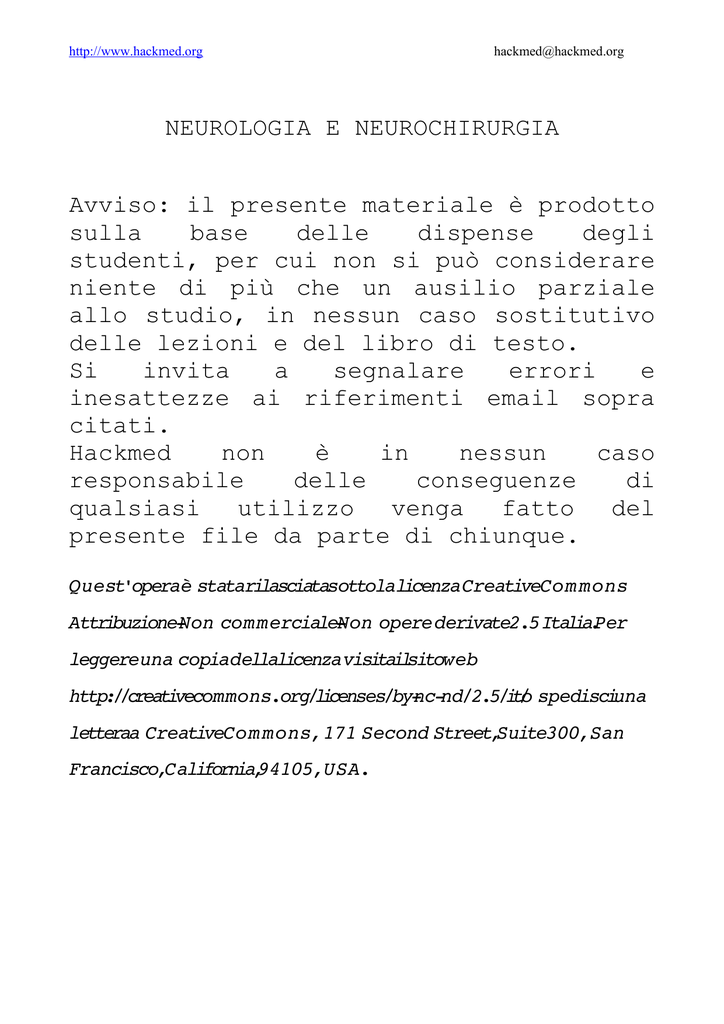 http://www.hackmed.org [email protected] NEUROLOGIA E NEUROCHIRURGIA Avviso: il presente materiale è prodotto sulla base delle dispense degli studenti, per cui non si può considerare niente di più che un ausilio parziale allo studio, in nessun caso sostitutivo delle lezioni e del libro di testo. Si invita a segnalare errori e inesattezze ai riferimenti email sopra citati. Hackmed non è in nessun caso responsabile delle conseguenze di qualsiasi utilizzo venga fatto del presente file da parte di chiunque. Quest'opera è stata rilasciata sotto la licenza Creative Com mons AttribuzioneNon commercialeNon opere derivate 2.5 Italia .Per leggere una copia della licenza visita il sito web http://creativecommons.org/licenses/byncnd/2.5/it /o spedisci una lettera a Creative Com mons, 171 Second Street, Suite 300, San Francisco, California, 94105, USA. CAP 1 SEMEIOTICA NEUROLOGICA.........................................................................................................................................6 1.1 Le vie di moto e della sensibilità............................................................................................................................6 1.2 Esame della funzione motoria................................................................................................................................9 Esame muscolare intrinseco.......................................................................................................................................11 Esame globale della forza muscolare.........................................................................................................................12 Alterazioni dell'iniziativa motrice..............................................................................................................................14 1.3 Esame della funzione sensitiva.............................................................................................................................18 CAP 2 MALATTIE VASCOLARI CEREBRALI.............................................................................................................................23 2.1 Anatomia e fisiologia del circolo cerebrale..........................................................................................................23 2.2 Ictus (Stroke)........................................................................................................................................................27 2.3 TIA.......................................................................................................................................................................32 2.4 Emorragia cerebrale............................................................................................................................................33 2.5 Emorragia subaracnoidea....................................................................................................................................34 2.6 Encefalopatia Ipertensiva.....................................................................................................................................35 2.7 Trombosi venosa cerebrale..................................................................................................................................36 2.8 Amnesia globale transitoria.................................................................................................................................36 2.9 Malattie vascolari del midollo..............................................................................................................................37 CAP 3 LE DEMENZE: ASPETTI GENERALI...............................................................................................................................41 3.1 Epidemiologia e costo sociale..............................................................................................................................41 3.2 Quadro clinico generale.......................................................................................................................................44 3.3 Protocollo diagnostico.........................................................................................................................................46 3.4 Approccio terapeutico e gestionale......................................................................................................................49 3.5 Strutture per la gestione del paziente demente.....................................................................................................52 CAP 4 LE DEMENZE: PARTE SPECIALE..................................................................................................................................54 4.1 La Malattia di Alzheimer......................................................................................................................................54 4.2 Malattia di Pick....................................................................................................................................................56 4.3 Malattia a corpi di Lewy diffusi...........................................................................................................................56 4.4 Demenza frontale primaria..................................................................................................................................56 4.5 Demenze di natura vascolare...............................................................................................................................57 4.6 Demenze da Prioni...............................................................................................................................................58 4.7 Altre forme di demenza.........................................................................................................................................59 CAP 5 MALATTIE DEL SISTEMA EXTRAPIRAMIDALE....................