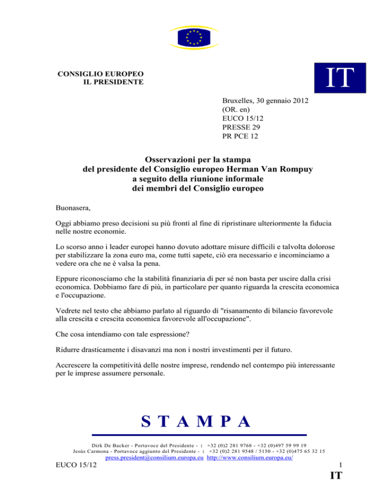IT CONSIGLIO EUROPEO IL PRESIDENTE Bruxelles, 30 gennaio 2012 (OR. en) EUCO 15/12 PRESSE 29 PR PCE 12 Osservazioni per la stampa del presidente del Consiglio europeo Herman Van Rompuy a seguito della riunione informale dei membri del Consiglio europeo Buonasera, Oggi abbiamo preso decisioni su più fronti al fine di ripristinare ulteriormente la fiducia nelle nostre economie. Lo scorso anno i leader europei hanno dovuto adottare misure difficili e talvolta dolorose per stabilizzare la zona euro ma, come tutti sapete, ciò era necessario e incominciamo a vedere ora che ne è valsa la pena. Eppure riconosciamo che la stabilità finanziaria di per sé non basta per uscire dalla crisi economica. Dobbiamo fare di più, in particolare per quanto riguarda la crescita economica e l'occupazione. Vedrete nel testo che abbiamo parlato al riguardo di "risanamento di bilancio favorevole alla crescita e crescita economica favorevole all'occupazione". Che cosa intendiamo con tale espressione? Ridurre drasticamente i disavanzi ma non i nostri investimenti per il futuro. Accrescere la competitività delle nostre imprese, rendendo nel contempo più interessante per le imprese assumere personale. STAMPA Dirk De Backer - Portavoce del Presidente - ( +32 (0)2 281 9768 - +32 (0)497 59 99 19 Jesús Carmona - Portavoce aggiunto del Presidente - ( +32 (0)2 281 9548 / 5150 - +32 (0)475 65 32 15 [email protected] http://www.consilium.europa.eu/ EUCO 15/12 1 IT Ci siamo concentrati su tre priorità: In primo luogo, la creazione di posti di lavoro, in particolare per i giovani. Aiutare i giovani, uomini e donne, di tutta l'Europa a trovare il loro posto nel mercato del lavoro. La scorsa settimana ho ricevuto una lettera dal Forum europeo della gioventù in cui era scritto “I giovani, in tempi di crisi e di austerità economica, non hanno bisogno di belle parole ma di forti investimenti.” Effettivamente è così. Per questo motivo abbiamo convenuto di utilizzare i fondi europei per istituire programmi di apprendistato ed aiutare i giovani neoimprenditori. Stimolare l'occupazione compete principalmente ai singoli Stati ma una parte del lavoro possiamo farla insieme, in quanto Unione, e la faremo. Seconda priorità: aiutare le piccole e medie imprese ad ottenere l'accesso al credito, ad esempio liberando i finanziamenti UE disponibili per sostenere i datori di lavoro e ridurre gli oneri burocratici. Terza priorità: il mercato unico. Siamo determinati ad eliminare i rimanenti ostacoli al suo completamento, ad esempio portando a compimento il mercato digitale e il mercato dell'energia. Deve essere attribuito carattere prioritario alle misure che maggiormente stimolano la crescita e l'occupazione. Questo Consiglio europeo è un passo foriero di progresso, nel quadro del semestre europeo, verso i Consiglio di marzo e di giugno. Considerate complessivamente, le nostre decisioni possono fare una vera differenza. Per i giovani, la differenza tra la disoccupazione e il primo lavoro; per una piccola impresa, la differenza tra essere costretta a licenziare un lavoratore ed essere in grado di assumerne uno in più … L'obiettivo è garantire delle prospettive e dare speranza. Il secondo tema principale della riunione di oggi è stato il nostro costante lavoro sulla stabilità della zona euro. Abbiamo compiuto importanti progressi nella messa a punto di una strategia per superare la crisi e collegare più strettamente le nostre economie in un quadro rafforzato. Permettetemi di accennare a quattro elementi. In primo luogo, abbiamo concordato e approvato il patto di bilancio, un trattato sulla stabilità e la convergenza nell'unione economica e monetaria che sarà firmato a marzo, in occasione della nostra prossima riunione, dai 17 leader della zona euro, nonché dai leader degli Stati membri non euro che vogliano aderirvi. I punti fondamentali del trattato riguardano una maggiore responsabilità e una sorveglianza rafforzata. Ogni paese firmatario s'impegna a inserire nella propria legislazione, a livello costituzionale o a un livello equivalente, un "freno all'indebitamento" o "regola d'oro". Nuove norme di voto e un meccanismo automatico di correzione contribuiranno a garantirne l'osservanza. Il trattato sarà firmato da 25 Stati membri - tutti gli Stati dell'UE ad eccezione di Regno Unito e Repubblica ceca - ed entrerà in vigore una volta ratificato da 12 paesi dell'euro. EUCO 15/12 2 IT In secondo luogo, abbiamo approvato l'accordo tra i 17 sul trattato per il meccanismo europeo di stabilità. Invitiamo i ministri delle finanze a firmarlo in occasione della prossima riunione dell'Eurogruppo, in modo che possa avere effetto dal luglio 2012. La rapida entrata in vigore di questo argine permanente impedirà il contagio nella zona euro e contribuirà a ripristinare ulteriormente la fiducia. In terzo luogo, a marzo riesamineremo, come convenuto a dicembre, l'adeguatezza delle risorse nell'ambito dei fondi di salvataggio del FESF e del MES. Dal momento che il nostro prossimo vertice è previsto per il 1º marzo, in realtà mancano meno di cinque settimane! Quarto e ultimo punto: per ciò che riguarda la Grecia, accogliamo con favore i progressi compiuti nel quadro dei negoziati col settore privato. Invitiamo le autorità greche e la troika a trovare un accordo sugli interventi necessari affinché l'attuale programma sia riportato sui giusti binari. Esortiamo i ministri delle finanze a intraprendere tutte le misure necessarie per attuare l'accordo relativo alla partecipazione del settore privato e adottare il nuovo programma entro la fine della settimana, in tempo utile affinché l'operazione possa essere avviata entro la metà di febbraio. Un'osservazione finale. Sebbene formalmente non fosse all'ordine del giorno di oggi, abbiamo anche affrontato brevemente i temi delle relazioni esterne. A tale proposito ho rilasciato una dichiarazione stampa separata, quindi permettetemi soltanto di accennare a tre dei temi discussi. Abbiam