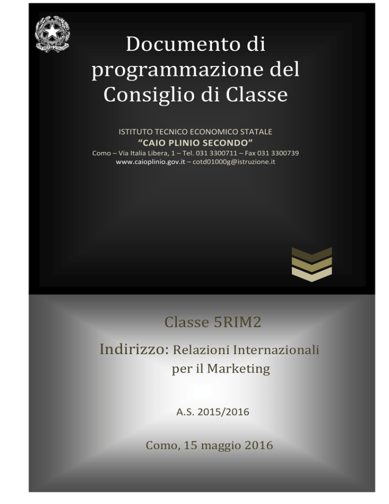 Documento di programmazione del Consiglio di Classe ISTITUTO TECNICO ECONOMICO STATALE “CAIO PLINIO SECONDO” Como – Via Italia Libera, 1 – Tel. 031 3300711 – Fax 031 3300739 www.caioplinio.gov.it – [email protected] Classe 5RIM2 Indirizzo: Relazioni Internazionali per il Marketing A.S. 2015/2016 Como, 15 maggio 2016 Sommario DOCUMENTO DI PROGRAMMAZIONE PAG. 3 – 8 ALLEGATO I – PROGRAMMA E RELAZIONI PAG. 9 – 53 ALLEGATO II – SIMULAZIONI TERZE PROVE PAG. 54 – 62 ALLEGATO III – GRIGLIE DI CORREZIONE PAG. 63 – 69 ALLEGATO IV – PROGETTO “IN TRENO PER LA MEMORIA PAG. 70 – 71 1 ML 2-64 Documento di programmazione del CC 12.05 DOCUMENTO DI PROGRAMMAZIONE DEL CONSIGLIO DI CLASSE 2 Composizione del Consiglio di Classe DISCIPLINA DOCENTE Italiano Prof.ssa Elisabetta Lombi Storia Prof.ssa Elisabetta Lombi Matematica Prof.ssa Rita Masi Inglese I lingua Prof.ssa Isabella Faggiano Francese II lingua Prof.ssa Gabriella Masi Tedesco II lingua Prof.ssa Francesca Monico Spagnolo II lingua Prof.ssa Erika Tettamanti Spagnolo III lingua Prof.ssa Cristina Ponisio Relazioni Internazionali Prof.ssa Elena Biondi Diritto Prof.ssa Elena Biondi Economia Aziendale e Geopolitica Prof.ssa Piera Benaglio Educazione Fisica Prof. Achille Ostinelli Religione Prof. Pier Luigi Canclini IL DIRIGENTE SCOLASTICO (Dott.ssa Silvana Campisano) 3 Profilo Professionale: Specificità del progetto A conclusione del percorso quinquennale, il diplomato consegue i risultati di apprendimento di seguito specificati in termini di competenze: ¬ Valutare fatti ed orientare i propri comportamenti in base ad un sistema di valori coerenti con i principi della Costituzione e con le carte internazionali dei diritti umani. ¬ Utilizzare il patrimonio lessicale ed espressivo della lingua italiana secondo le esigenze comunicative nei vari contesti: sociali, culturali, scientifici, economici, tecnologici. ¬ Stabilire collegamenti tra le tradizioni culturali locali, nazionali ed internazionali, sia in una prospettiva interculturale sia ai fini della mobilità di studio e di lavoro. ¬ Utilizzare gli strumenti culturali e metodologici per porsi con atteggiamento razionale, critico e responsabile di fronte alla realtà, ai suoi fenomeni, ai suoi problemi, anche ai fini dell’apprendimento permanente. ¬ Riconoscere gli aspetti geografici, ecologici, territoriali dell’ambiente naturale ed antropico, le connessioni con le strutture demografiche, economiche, sociali, culturali e le trasformazioni intervenute nel corso del tempo. ¬ Riconoscere il valore e le potenzialità dei beni artistici e ambientali, per una loro corretta fruizione e valorizzazione. ¬ Utilizzare e produrre strumenti di comunicazione visiva e multimediale, anche con riferimento alle strategie espressive e agli strumenti tecnici della comunicazione in rete. ¬ Padroneggiare la lingua inglese e altre due lingue comunitarie per scopi comunicativi e utilizzare i linguaggi settoriali relativi ai percorsi di studio, per interagire in diversi ambiti e contesti professionali, al livello B1 del quadro comune europeo di riferimento per le lingue (QCER). ¬ Riconoscere gli aspetti comunicativi, culturali e relazionali dell’espressività corporea e l’importanza che riveste la pratica dell’attività motorio-sportiva per il benessere individuale e collettivo. ¬ Utilizzare il linguaggio e i metodi propri della matematica per organizzare e valutare adeguatamente informazioni qualitative e quantitative. ¬ Utilizzare le strategie del pensiero razionale negli aspetti dialettici e algoritmici per affrontare situazioni problematiche, elaborando opportune soluzioni. ¬ Utilizzare i concetti e i modelli delle scienze sperimentali per investigare fenomeni sociali e naturali e per interpretare dati. ¬ Utilizzare le reti e gli strumenti informatici nelle attività di studio, ricerca e approfondimento disciplinare. ¬ 4 Analizzare il valore, i limiti e i rischi delle varie soluzioni tecniche per la vita sociale e culturale con particolare attenzione alla sicurezza nei luoghi di vita e di lavoro, alla tutela della persona, dell’ambiente e del territorio. Presentazione della classe e sua evoluzione nel quinquennio La classe è attualmente composta da 15 alunni (11 ragazze e 4 ragazzi) che provengono tutti dalla IV RIM 2 dello scorso anno scolastico. La classe si sdoppia per seguire le lezioni relative alla seconda e terza lingua straniera (francese/tedesco/spagnolo). L’attuale classe si è formata nel triennio (terza F): gli alunni in terza erano 21 provenienti da diverse seconde. In seguito alla non ammissione alla classe successiva sono diventati 16 in quarta; oltre alle non ammissioni sei alunni hanno avuto uno o più debiti a settembre. A settembre dello scorso anno 2015 un alunno non è stato ammesso alla classe successiva in seguito al permanere di gravi e diffuse lacune non recuperate per problemi personali. Solo due alunni hanno avuto uno/più debiti a settembre. Una alunna ha frequentato l’anno scolastico 14/15 all’estero; nel mese di settembre ha integrato la preparazione delle discipline non seguite all’estero sostenendo un esame. Per quanto riguarda la composizione del Consiglio di Classe nel corso del triennio la classe ha mantenuto la continuità didattica in quasi tutte le discipline; solo per la terza lingua – Spagnolo – si è verificato il cambiamento d’insegnante tutti i tre anni; quest’anno è cambiata l’insegnante di Tedesco. Partecipazione, impegno e metodo di studio Dopo una terza un po’ faticosa sia dal punto di vista sia della partecipazione che del rendimento (vedi risultati di cui sopra), a partire dall’anno scorso si è potuto lavorare in modo più positivo: è migliorata la partecipazione al dialogo educativo e l’interesse verso le diverse discipline. Inoltre, grazie a un costante lavoro personale alcuni alunni hanno evidenziato quest’anno i frutti di una progressiva maturazione/crescita raggiungendo, chi ottimi ris