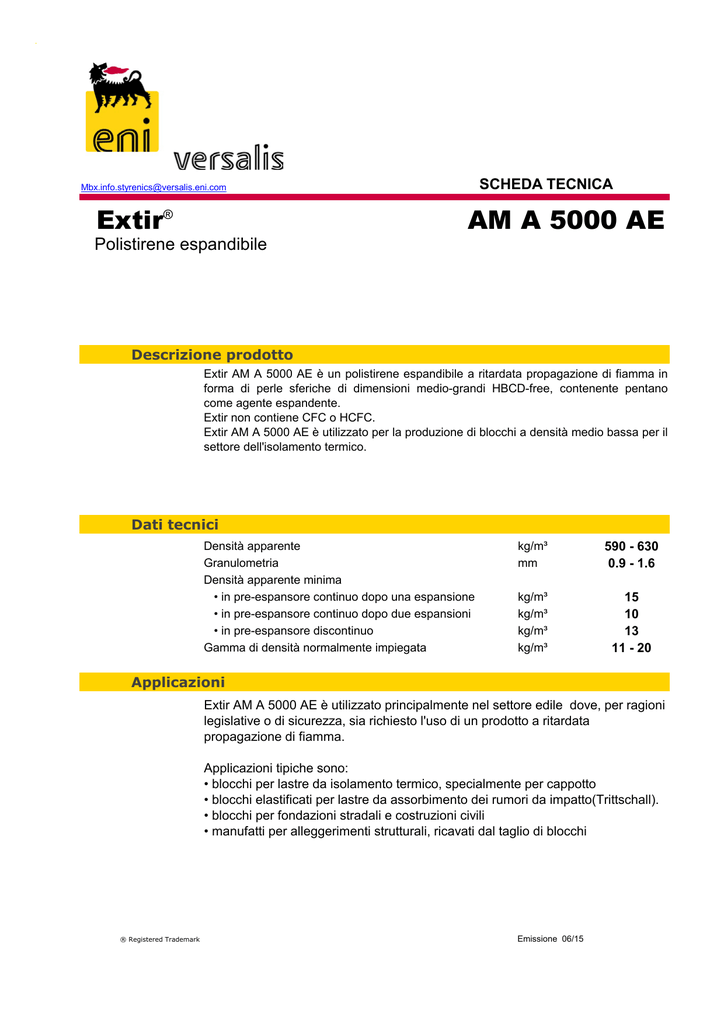. SCHEDA TECNICA [email protected] Extir® AM A 5000 AE Polistirene espandibile Descrizione prodotto Extir AM A 5000 AE è un polistirene espandibile a ritardata propagazione di fiamma in forma di perle sferiche di dimensioni medio-grandi HBCD-free, contenente pentano come agente espandente. Extir non contiene CFC o HCFC. Extir AM A 5000 AE è utilizzato per la produzione di blocchi a densità medio bassa per il settore dell'isolamento termico. Dati tecnici Densità apparente Granulometria Densità apparente minima • in pre-espansore continuo dopo una espansione • in pre-espansore continuo dopo due espansioni • in pre-espansore discontinuo Gamma di densità normalmente impiegata kg/m³ mm 590 - 630 0.9 - 1.6 kg/m³ kg/m³ kg/m³ kg/m³ 15 10 13 11 - 20 Applicazioni Extir AM A 5000 AE è utilizzato principalmente nel settore edile dove, per ragioni legislative o di sicurezza, sia richiesto l'uso di un prodotto a ritardata propagazione di fiamma. Applicazioni tipiche sono: • blocchi per lastre da isolamento termico, specialmente per cappotto • blocchi elastificati per lastre da assorbimento dei rumori da impatto(Trittschall). • blocchi per fondazioni stradali e costruzioni civili • manufatti per alleggerimenti strutturali, ricavati dal taglio di blocchi ® Registered Trademark Emissione 06/15 Extir® Polistirene espandibile AM A 5000 AE Processabilità Extir AM A 5000 AE può essere facilmente pre-espanso fino a 15 kg/m³ in una sola espansione e fino a 11 kg/m³ dopo una seconda espansione.In quest'ultimo caso è opportuno non forzare l'espansione sino al limite ottenibile. Il tempo di maturazione consigliato,prima dell'utilizzo,dipende ovviamente dalla densità di pre-espansione e varia dalle 6 alle 72 ore. Lo stampaggio dei blocchi è caratterizzato da cicli veloci. Inoltre grazie ad un' eccellente reazione al vapore,è possibile stampare pezzi con un più elevato contenuto di materiale FR riciclato, senza significative riduzione delle proprietà. I blocchi vengono tagliati in lastre dello spessore richiesto o in manufatti conformati per mezzo di fili caldi e/o oscillanti. . Informazioni generali Si raccomanda di conservare il prodotto in luoghi asciutti e ben ventilati a temperatura tra 15 e 20°C. A queste temperature il prodotto in octabin mantiene le proprie caratteristiche per almeno un mese; in fusti metallici questo periodo si estende a sei mesi. Durante la lavorazione del Polistirene Espandibile vanno evitate tutte le possibili cause di innesco quali fiamme libere o scintille e si raccomanda quindi il divieto di fumare. Si consiglia una adeguata messa a terra delle apparecchiature e delle linee di trasporto pneumatico. Per ulteriori informazioni relative alla conservazione, imballaggio e precauzioni durante la lavorazione, si prega di fare riferimento a "Stirenici - Schede Tecniche", ed alle "Schede di Sicurezza Extir". In riferimento alle proprietà di "ritardata propagazione della fiamma", gli articoli prodotti con Extir AM AE sono in fase di certificazione B1 nach DIN 4102. I risultati dei test nei nostri laboratori soddistano questo standard. L'azione dell'additivo ritardante di fiamma si esercita solo dopo l'eliminazione dell'agente espandente e solo dopo che Extir AM AE sia stato trasformato in manufatti espansi (adeguatamente stagionati ove necessario). Emissione 06/15 Tutti i valori riportati sono riferiti ai prodotti in versione naturale. I dati, le notizie ed i suggerimenti riportati hanno valore semplicemente indicativo. La Società non assume alcuna responsabilità per i risultati che siano ottenuti con il loro impiego o per la loro utilizzazione in violazione di eventuali brevetti. La Società è comunque disponibile a fornire su richiesta i valori garantiti per i singoli prodotti.