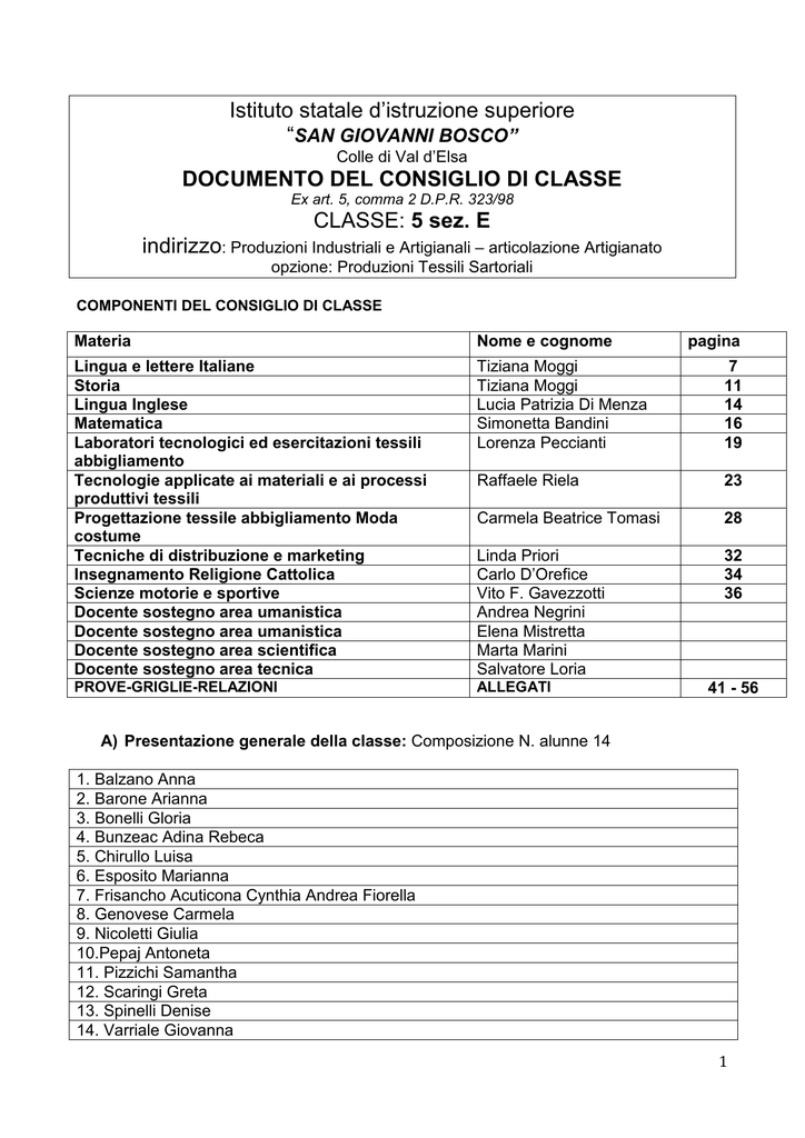 Istituto statale d’istruzione superiore “SAN GIOVANNI BOSCO” Colle di Val d’Elsa DOCUMENTO DEL CONSIGLIO DI CLASSE Ex art. 5, comma 2 D.P.R. 323/98 CLASSE: 5 sez. E indirizzo: Produzioni Industriali e Artigianali – articolazione Artigianato opzione: Produzioni Tessili Sartoriali COMPONENTI DEL CONSIGLIO DI CLASSE Materia Nome e cognome pagina Lingua e lettere Italiane Storia Lingua Inglese Matematica Laboratori tecnologici ed esercitazioni tessili abbigliamento Tecnologie applicate ai materiali e ai processi produttivi tessili Progettazione tessile abbigliamento Moda costume Tecniche di distribuzione e marketing Insegnamento Religione Cattolica Scienze motorie e sportive Docente sostegno area umanistica Docente sostegno area umanistica Docente sostegno area scientifica Docente sostegno area tecnica Tiziana Moggi Tiziana Moggi Lucia Patrizia Di Menza Simonetta Bandini Lorenza Peccianti 7 11 14 16 19 Raffaele Riela 23 Carmela Beatrice Tomasi 28 Linda Priori Carlo D’Orefice Vito F. Gavezzotti Andrea Negrini Elena Mistretta Marta Marini Salvatore Loria 32 34 36 PROVE-GRIGLIE-RELAZIONI ALLEGATI 41 - 56 A) Presentazione generale della classe: Composizione N. alunne 14 1. Balzano Anna 2. Barone Arianna 3. Bonelli Gloria 4. Bunzeac Adina Rebeca 5. Chirullo Luisa 6. Esposito Marianna 7. Frisancho Acuticona Cynthia Andrea Fiorella 8. Genovese Carmela 9. Nicoletti Giulia 10.Pepaj Antoneta 11. Pizzichi Samantha 12. Scaringi Greta 13. Spinelli Denise 14. Varriale Giovanna 1 PROFILO PROFESSIONALE D’INDIRIZZO Produzioni industriali e artigianali – op: PRODUZIONI TESSILI SARTORIALI Il Diplomato d’istruzione professionale nell’indirizzo “Produzioni industriali e artigianali” interviene nei processi di lavorazione, fabbricazione, assemblaggio e commercializzazione di prodotti industriali e artigianali. Il primo biennio ha un quadro orario, con un’area di formazione generale e una d’indirizzo in cui si ottiene una formazione su materie tecnologiche di base. Il laboratorio tecnologico si caratterizza, fin dal primo anno, per soddisfare l’identità professionale del nostro istituto nel settore abbigliamento e moda. A conclusione dei cinque anni di studio: • Utilizzare adeguatamente gli strumenti informatici e i software dedicati agli aspetti produttivi e gestionali. • Selezionare e gestire i processi di produzione in rapporto ai materiali e alle tecnologie specifiche. • Applicare le procedure che disciplinano i processi produttivi, nel rispetto della normativa sulla sicurezza nei luoghi di vita e di lavoro e sulla tutela dell’ambiente e del territorio. • Innovare e valorizzare, sotto il profilo creativo e tecnico, le produzioni tradizionali del territorio. • Applicare i sistemi di controllo-qualità nella propria attività lavorativa. • Intervenire nelle diverse fasi e livelli del processo produttivo, mantenendone la visione sistemica. Il diplomato nell’indirizzo Produzioni Industriali e Artigianali - op. Produzioni Tessili Sartoriali possiede competenza e abilità per inserirsi in aziende del settore moda, quali abbigliamento, sartorie, studi stilistici, centri di marketing aziendale, laboratori di attività connesse e può svolgere un ruolo attivo sia in un contesto di lavoro autonomo che nell’industria. B) Descrizione del percorso d’apprendimento Progressione nell’apprendimento: RELAZIONE FINALE DEL COORDINATORE La classe è composta da 14 elementi. Una ragazza si avvale del programma differenziato. Due studentesse sono di Italiano L2, anche se hanno frequentato regolarmente dalle elementari la scuola italiana. Le 14 studentesse sono il risultato di una fusione della sezione F e E, fusione avvenuta al terzo anno, momento in cui si è inserita l’allieva Anna Balzano, proveniente dall’istituto Don Bosco indirizzo pedagogico. In prima E le studentesse erano 19. In prima F le studentesse erano 17. Nel corso del secondo anno la sezione E si è articolata con la sezione A Indirizzo Manutenzione e in tale anno le studentesse erano 14. Le iscritte alla sezione F al secondo anno erano13. In terza il nuovo gruppo classe terza EPI si è costituito con 25 frequentanti. La quarta classe ha visto iscriversi 20 studentesse. In quinta il numero attuale di 14 elementi deriva da due non promozioni, da due abbandoni scolastici e da un trasferimento in altra città per motivi familiari e un abbandono in corso d’anno. La classe disciplinata e collaborativa nelle varie iniziative scolastiche presenta un profilo che evidenzia la generale propensione per le abilità pratiche di settore dove una buona parte delle allieve mantiene un profitto più che discreto e solo un paio si trovano ai limiti della sufficienza. Nell'ambito delle materie teoriche, umanistiche, in particolare, la preparazione raggiunta, 2 eccetto alcuni elementi, si attesta genericamente intorno ai limiti della sufficienza. Influisce su tali risultati una non adeguata proprietà di lessico, una certa fragilità di esposizione sia scritta che orale e un’altrettanta fragilità di elaborazione dei contenuti acquisiti. Lo studio casalingo in quest’ anno scolastico è stato per lo più regolare e la partecipazione al dialogo scolastico assidua anche se solo recettiva. Si sottolinea da parte del corpo docente comunque una buona disposizione della classe a partecipare alla vita scolastica senza sottrarsi ad impegni e proposte. Considerando la provenienza da diverse sezioni c'è stato un notevole avvicendarsi di insegnanti che ha interessato sia il settore professionalizzante che le altre materie ed in particolare la lingua Inglese. Malgrado alcuni cambiamenti c’è stata più regolarità nelle materie letterarie e assoluta continuità per Matematica. C) Obiettivi trasversali individuati dal consiglio di classe in sede di programmazione (dal verbale del Consiglio di Classe) 1. Acquisizione di un metodo di studio valido e redditizio. 2. Acquisizione di dati teorici e uso di strumenti adeguati per la loro assim