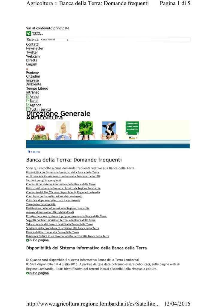 Agricoltura :: Banca della Terra: Domande frequenti Pagina 1 di 5 Vai al contenuto principale Ricerca Cerca nel sito Contatti Newsletter Twitter Webcam Diretta English Regione Cittadini Imprese Ambiente Tempo Libero Intranet Avvisi Bandi Agenda Tutti i servizi Direzione Generale Agricoltura Banca della Terra: Domande frequenti Sono qui raccolte alcune domande frequenti relative alla Banca della Terra. Disponibilità del Sistema informativo della Banca della Terra A chi compete il censimento dei terreni abbandonati e incolti Sanzioni per gli inadempienti Contenuti del sistema informativo della Banca della Terra Utilizzo del sistema informativo fornito da Regione Lombardia Contenuto del file CSV reso disponibile da Regione Lombardia Contributo per la realizzazione del censimento Cosa fare dopo aver effettuato il censimento Terreno in comproprietà Restituzione delle informazioni a Regione Lombardia Assenza di terreni incolti o abbandonati Privato che vuole iscrivere il proprio terreno alla Banca della Terra Soggetti pubblici: iscrizione terreni alla Banca della Terra Valorizzazione dei terreni iscritti alla Banca della Terra Scadenza della procedura di iscrizione alla Banca della Terra Revoca dell'iscrizione alla Banca della Terra Rimessa a coltura di un terreno incolto iscritto alla Banca della Terra inizio pagina Disponibilità del Sistema informativo della Banca della Terra D: Quando sarà disponibile il sistema informativo Banca della Terra Lombarda? R: Sarà disponibile dal 4 luglio 2016. A partire da tale data potranno essere pubblicati, sulle pagine web di Regione Lombardia, i dati identificativi dei terreni incolti disponibili alla rimessa a coltura. inizio pagina http://www.agricoltura.regione.lombardia.it/cs/Satellite... 12/04/2016 Agricoltura :: Banca della Terra: Domande frequenti Pagina 2 di 5 A chi compete il censimento dei terreni abbandonati e incolti D: A chi compete il censimento dei terreni abbandonati e incolti? Entro quanto tempo deve essere eseguito? R: La legge regionale identifica l’amministrazione comunale quale unico soggetto responsabile del censimento, che deve essere eseguito e trasmesso a Regione Lombardia entro 180 giorni dall’approvazione del Regolamento regionale (ovvero entro il 1 settembre 2016). inizio pagina Sanzioni per gli inadempienti D: Quali sono le sanzioni alle quali va incontro l’amministrazione comunale inadempiente (che non redige il censimento e/o non lo trasmette entro il 1/09/2016)? R: Decorso inutilmente il termine indicato, Regione Lombardia esclude temporaneamente i Comuni inadempienti da ogni trasferimento, bando o finanziamento regionale fino al momento dell’effettuazione e trasmissione del censimento. inizio pagina Contenuti del sistema informativo della Banca della Terra D: Cosa contiene lo strato informativo messo a disposizione da Regione Lombardia ai Comuni? R: La banca dati contiene l'elenco delle particelle catastali potenzialmente incolte o abbandonate; “potenziali” in quanto derivante da una elaborazione di dati contenuti in fonti informative di scala regionale, alla data di entrata in vigore della legge regionale. Le particelle catastali sono identificate come segue: identificativi catastali, destinazione d’uso catastale ed estremi proprietà; informazioni georeferenziate, così come messe a disposizione dall’Agenzia delle Entrate. inizio pagina Utilizzo del sistema informativo fornito da Regione Lombardia D: Il Comune è obbligato ad utilizzare lo strato informativo messo a disposizione da Regione Lombardia? R: No. La legge regionale di istituzione della Banca della Terra pone in capo ai Comuni il censimento dei terreni abbandonati o incolti. Regione, per supportare l’amministrazione comunale, ha elaborato uno strato informativo di cui i Comuni possono avvalersi, ma con libertà di utilizzare anche altre banche dati o documentazioni o informazioni in loro possesso. D: Il Comune deve verificare puntualmente lo strato informativo regionale e dare riscontro su questo? R: Lo strato informativo può essere utilizzato come strumento di lavoro per eseguire il censimento e come format per organizzare la restituzione dei dati a Regione Lombardia (senza georeferenziazione). Tuttavia è l’amministrazione comunale responsabile del censimento, la quale attribuisce, sulla base delle proprie valutazioni e informazioni, lo stato di incolto o abbandonato ad un terreno privato (in coerenza alla definizione in legge) avviando successivamente le procedure per ottenere la disponibilità del proprietario all’iscrizione alla Banca della Terra. Per le proprietà pubbliche è l’Ente proprietario che determina lo stato del terreni e che, in autonomia, decide se procedere o meno all’iscrizione alla Banca della Terra, seguendo le procedure indicate nel regolamento. inizio pagina Contenuto del file CSV reso disponibile da Regione Lombardia D: Ho scaricato il file CSV contenente i terreni potenzialmente incolti o abbandonati messo a disposizione da Regione Lombardia, ma è vuoto, non contiene alcun dato. Cosa vuol dire? http://www.agricoltura.regione.lombardia.it/cs/Satellite... 12/04/2016 Agricoltura :: Banca della Terra: Domande frequenti Pagina 3 di 5 R: Per prima cosa è necessario assicurarsi che il file sia realmente “vuoto”, non basta quindi aprirlo direttamente nell’area di download , ma salvarlo sul proprio PC e aprirlo in locale. Se il file permane vuoto (assenza dei dati) vuol dire che, sulla base delle informazioni regionali a disposizione (e con i limiti del sistema di ricognizione, effettuato a scala regionale), non sono stati rilevati terreni incolti o abbandonati. Il Comune deve comunque procedere al censimento sulla base delle proprie informazioni, conoscenze dirette o altre banche dati per accertare l’assenza o la presenza di terreni incolti. inizio pagina Contributo per la realizzazione del censimento D: E’ previsto un contributo ai Comuni per la realizzazione del censimento? R: No. La legge regional