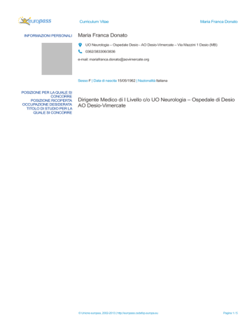 Curriculum Vitae INFORMAZIONI PERSONALI Maria Franca Donato Maria Franca Donato UO Neurologia – Ospedale Desio - AO Desio-Vimercate – Via Mazzini 1 Desio (MB) 0362/383306/3836 e-mail: [email protected] Sesso F | Data di nascita 15/05/1962 | Nazionalità Italiana POSIZIONE PER LA QUALE SI CONCORRE POSIZIONE RICOPERTA OCCUPAZIONE DESIDERATA TITOLO DI STUDIO PER LA QUALE SI CONCORRE Dirigente Medico di I Livello c/o UO Neurologia – Ospedale di Desio AO Desio-Vimercate © Unione europea, 2002-2013 | http://europass.cedefop.europa.eu Pagina 1 / 5 Curriculum Vitae Maria Franca Donato ESPERIENZA PROFESSIONALE Dal 25/11/1998 ad oggi Dirigente Medico di I Livello Neurologo in equipe per Reparto di 34 posti letto Neurologo di PS Desio e per altri Ospedali aziendali Consulente Neurologo per le altre UO Desio Ambulatorio di Neurologia Desio e occasionalmente c/o altri ospedali aziendali Responsabile Centro Cefalee - UO Neurologia - Ospedale Desio Responsabile lettura / refertazione EEG - UO Neurofisiologia – Ospedale Desio Diagnosi e cura malattie Neurodegenerative, con competenza in testi neuropsicologici – UO Neurologia –Ospedale Desio UO Neurologia – Ospedale di Desio – AO Desio - Vimercate Da marzo 2010 ad oggi Responsabile della lettura e della refertazione degli EEG Ospedalieri ed esterni UO Neurofisiologia – Ospedale di Desio –AO Desio-Vimercate Da aprile 2006 ad oggi Dall’8/9/ 1997 al 22/11/1998 Dal 23/5/1994 al 29/12/1994 Responsabile di Ambulatorio –Centro per la diagnosi e la cura delle Cefalee UO Neurologia – Ospedale di Desio – AO Desio-Vimercate Incarico di supplenza come Assistente Medico Neurologo/ Dirigente Medico I livello Neurologo UO Neurologia – Ospedale di Desio – AO Desio-Vimercate Dal 30/12/1994 al 7/9/1997 Incarico di supplenza come Assistente Medico Neurologo/ Dirigente Medico I livello Neurologo UO Neurologia – Ospedale Niguarda Cà Granda Milano Dal 1993 al 1996 Coinvestigator in studi sperimentali multicentrici per la somministrazione di farmaci in paziente affetti da m- di Alzheimer , con somministrazione di test neuropsicologici UO Neurologia – Ospedale Niguarda Cà Granda Milano Servizio geriatrico c/o Ospedale Passirana di Rho Dal 1992 al 1994 Dal 1991 al 1994 Dal 1987 al1991 Dal 1983 al 1992 Borsista neurologo c/o Reparto e ambulatorio di Neurologia UO Neurologia – Ospedale Niguarda Cà Granda Milano Incarico di specialista Neurologo ambulatoriale SUMAI USSL di Milano, Lecco, Monza e Bellano, Lecco Milano Medico Titolare di guardia medica c/o Le USSL di Lecco e Milano Sostituzione MMG c/o la USSL di Milano Sostituzioni MMG USSL Milano Medico interno/specializzando/borsista neurologo Pad. Ponti – Neurologia -Ospedale Maggiore Policlinico - Milano M © Unione europea, 2002-2013 | http://europass.cedefop.europa.eu Pagina 2 / 5 Curriculum Vitae Maria Franca Donato ISTRUZIONE E FORMAZIONE 10/7/1991 21/7/1987 Anno Scolastico 1980/81 Specializzazione in Neurologia Università degli Studi – Milano Tesi sperimentale: “Fattori trofici (Nerve Growth Factor) e astrociti umani in vitro”. Relatore Prof. G Scarlato, correlatore Prof. V Silani Voto 62/70 Laurea in Medicina e Chirurgia Università degli Studi – Milano Tesi sperimentale: “ Risposta astrocitaria in vitro al siero e al liquor di Paziente affetti da Sclerosi Laterale Amiotrofica”. Relatore Prof. G Scarlato, correlatore Prof. V.Silani Voto 110 e lode/ 110 Maturità scientifica c/o L. Scientifico “L.Cremona” Milano Anno scolastico 1980/81 Voto 51/60 COMPETENZE PERSONALI Lingua madre italiana ALTRA LINGUA INGLESE COMPRENSIONE PARLATO PRODUZIONE SCRITTA Ascolto Lettura Interazione Produzione orale B1/2 B1/2 B1/2 B1/2 B1/2 Competenze comunicative Ottime capacità comunicative innate e potenziate da esperienze personali, lavorative nonché tramite corsi d’aggiornamento sulla comunicazione. (es “Minimaster: la valutazione neuropsicologica”, RE 2007) Competenze organizzative Eccellenti capacità organizzative grazie ad una propensione naturale e necessarie al fine di svolgere al meglio il particolare e complesso tipo di lavoro (neurologo ospedaliero in reparto ed in PS) e per poter conciliare al meglio vita privata con quella lavorativa. Competenze informatiche Buona padronanza degli strumenti Microsoft Office di comune impiego nella pratica lavorativa (Word, Exell, Power Point) acquisita con la pratica e tramite corsi di aggiornamento Altre competenze Brevetto sub, discreta ballerina di ballo liscio e latino-americano, palestra, running all’aria aperta, escursionista amatoriale in montagna, sci di fondo, buona lettrice di libri, abituale frequentatrice di cinema e teatro. © Unione europea, 2002-2013 | http://europass.cedefop.europa.eu Pagina 3 / 5 Curriculum Vitae Patente di guida Maria Franca Donato B ULTERIORI INFORMAZIONI Pubblicazioni Presentazioni Progetti Conferenze Seminari Riconoscimenti e premi Appartenenza a gruppi / associazioni Referenze Più di 50 pubblicazioni inerenti ai principali argomenti della Neurologia Partecipazione a numerosi corsi d’aggiornamento con crediti ECM ALLEGATI PUBBLICAZIONI Le colture di motoneuroni di corteccia cerebrale umana come strumento di studio in neuroimmunologia Silani V, DONATO MF, Causarano RI, Scarlato G. In: La Neuroimmunologia Clinica Oggi: realtà e prospettive, Piccin (Annunziata P, Guazzi D, EDS), 113-124, 1988; Purified human adult and fetal astrocytes in vitro Silani V, DONATO MF, Strada O, Ghezzi C, Scarlato G Abstractof the 12th Annual Meeting of the European Neuroscience Association Turin 3-7 September 1989. Suppl 2 to the European Journala of Neuroscience Human neuronal cells in culture: from concepts to basic methodology Silani V, DONATO MF, Scarlato G Bollettino Istituto Sieroterapico Milanese, Vol 69, 1, Gennaio 1990 Cellular Development in the human adrenal gland Mariani D, Silani V, Strada O, Mazzuchelli F, DONATO MF, Pizzuti A, Scarlato G The Italian Journal of Neurological Sciences, 11,211,1990 N