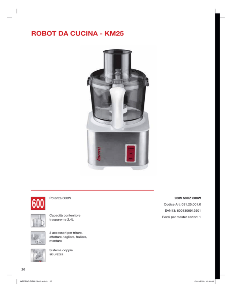 ROBOT DA CUCINA - KM25 600 Potenza 600W 230V 50HZ 600W Codice Art: 091.25.001.0 EAN13: 8001306912501 Capacità contenitore trasparente 2,4L Pezzi per master carton: 1 3 accessori per tritare, affettare, tagliare, frullare, montare Sistema doppia sicurezza 26 INTERNO GIRMI 09-10 ok.indd 26 17-11-2009 10:11:03