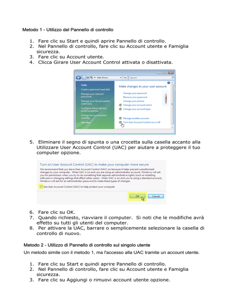 Metodo 1 - Utilizzo del Pannello di controllo 1. Fare clic su Start e quindi aprire Pannello di controllo. 2. Nel Pannello di controllo, fare clic su Account utente e Famiglia sicurezza. 3. Fare clic su Account utente. 4. Clicca Girare User Account Control attivata o disattivata. 5. Eliminare il segno di spunta o una crocetta sulla casella accanto alla Utilizzare User Account Control (UAC) per aiutare a proteggere il tuo computer opzione. 6. Fare clic su OK. 7. Quando richiesto, riavviare il computer. Si noti che le modifiche avrà effetto su tutti gli utenti del computer. 8. Per attivare la UAC, barrare o semplicemente selezionare la casella di controllo di nuovo. Metodo 2 - Utilizzo di Pannello di controllo sul singolo utente Un metodo simile con il metodo 1, ma l'accesso alla UAC tramite un account utente. 1. Fare clic su Start e quindi aprire Pannello di controllo. 2. Nel Pannello di controllo, fare clic su Account utente e Famiglia sicurezza. 3. Fare clic su Aggiungi o rimuovi account utente opzione. 4. Fai clic per selezionare qualsiasi account utente. 5. Fare clic su Vai alla pagina principale account utente. 6. Fare clic su Modifica impostazioni di sicurezza sotto "Apportare modifiche al tuo account utente" sezione. 7. Eliminare il segno di spunta o una crocetta sulla casella accanto alla Utilizzare User Account Control (UAC) per aiutare a proteggere il tuo computer opzione. 8. Fare clic su OK. 9. Quando richiesto, riavviare il computer. Si noti che le modifiche avrà effetto su tutti gli utenti del computer. 10. Per attivare la UAC, barrare o semplicemente selezionare la casella di controllo di nuovo. Metodo 3 - Utilizzo del Registro di sistema 1. Eseguire Editor del Registro di sistema, digitando "Regedit" Inizia ricerca o nel prompt dei comandi. 2. Nel Registro di sistema, passare alla seguente chiave di registro: HKEY_LOCAL_MACHINE \ Software \ Microsoft \ Windows \ CurrentVersion \ Policies \ System 3. Individuare la seguente sottochiave di registro DWORD nel riquadro di destra: EnableLUA 4. Fare clic col pulsante destro e scegliere di modificare o fare doppio clic su EnableLUA di modificare l'impostazione. Il prompt di valud, impostare il nuovo valore a 0. 5. Uscire dal Registro di sistema. 6. Riavviare il computer. 7. Per attivare la UAC, è sufficiente cambiare il valore di ritorno EnableLUA a 1. Metodo 4 - Uso di msconfig configurazione di sistema 1. Esegui MsConfig da Esegui opzione. 2. Nella finestra di configurazione di sistema, fare clic sulla scheda Strumenti. 3. Scorrere l'elenco e individuare "Disabilitare UAP" o "Disabilita UAC" opzione voce. Fare clic su questa linea. 4. Fare clic sul pulsante Avvio. 5. Una finestra del prompt dei comandi e si aprirà automaticamente eseguire ed eseguire determinate processo di disattivare UAC. 6. Chiudi finestra CMD quando fare. 7. Chiudi Msconfig. 8. Riavvia il computer per attivare le modifiche da applicare ed efficace. 9. Per riattivare UAC, basta selezionare "Abilita UAP" o "Abilita UAC" invece di "Disattiva UAP" o "Disabilita UAC", e quindi fare clic sul pulsante Lancia. Metodo 5 - Utilizzo di Criteri di gruppo Se sei un amministratore IT o amministratore di sistema, che gestisce molti computer Windows Vista o clienti attraverso il computer, i criteri di gruppo possono essere uno strumento efficace e facile da attivare o disattivare la massa di un gruppo di computer. Per disattivare UAC, sia locali o Criteri di gruppo di Active Directory GPO può essere utilizzato. 1. Fare clic su Start -> Esegui. 2. Tipo gpedit.msc e fare clic su OK per aprire la Criteri di gruppo Editor. Nota: Se si sta utilizzando Active Directory Domain GPO che controlla molti computer, aprire Criteri di gruppo Management Console facendo clic su Start -> Esegui, quindi digitare gpmc.msc e fare clic su OK Windows Vista da un computer che è un membro del dominio AD . In Criteri di gruppo Management Console (GPMC) finestra, passare in rassegna le rispettive GPO che è collegato e abilitato alla UO (organizzazione unità) o in cui il dominio Vista computer sono localizzati, poi modificarlo. 3. Naviga e naviga a Configurazione computer -> Impostazioni di Windows -> Impostazioni - Sicurezza> Politiche locali -> Opzioni di sicurezza. 4. Nella parte destra riquadro dettagli, individuare l'utente politiche di controllo di accesso. 5. Fai clic destro ciascuna delle seguenti politiche e configurare o modificare il valore, come indicato qui di seguito, dopo il trattino (-): * User Account Control: Rileva domanda di impianti per il prompt di altezza e disabili * User Account Control: Comportamento del prompt di altezza standard per gli utenti - Nessuna richiesta * User Account Control: Esegui tutti gli amministratori nel Admin Mode Approvazione disabili 6. Riavviare il computer.
