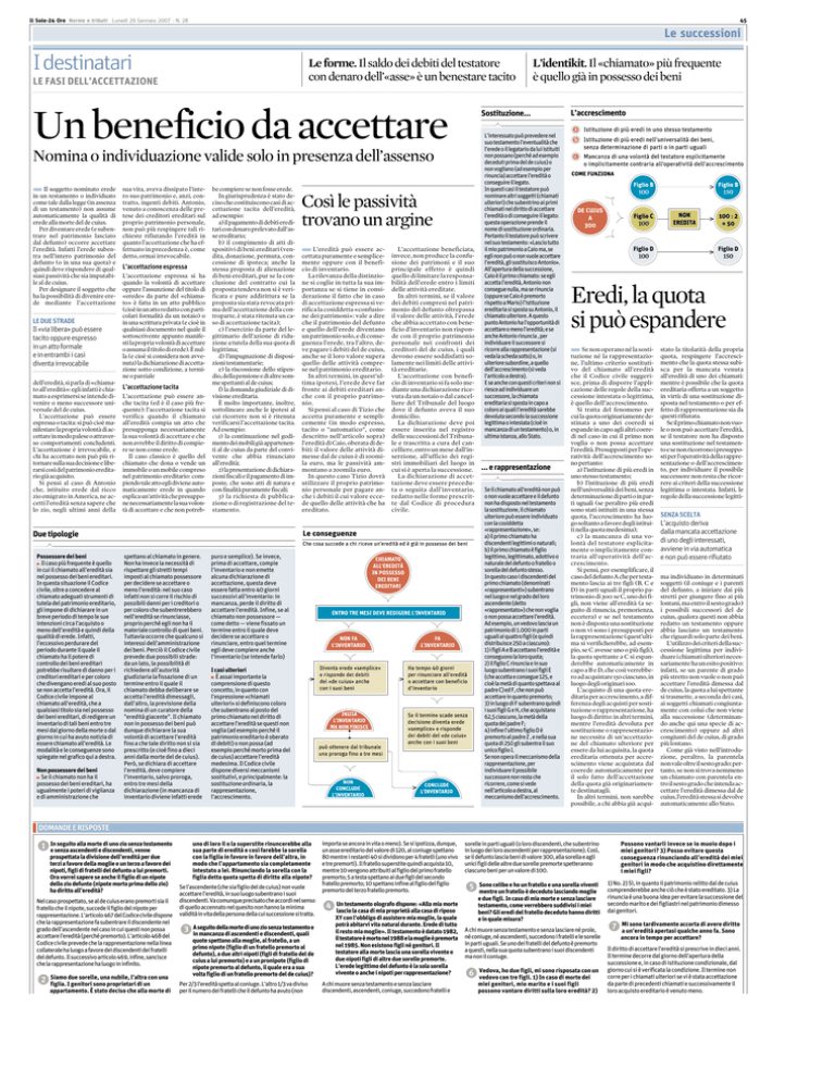 Il Sole-24 Ore Norme e tributi Lunedì 29 Gennaio 2007 - N. 28 45 Le successioni Idestinatari Le forme. Il saldo dei debiti del testatore con denaro dell’«asse» è un benestare tacito LE FASI DELL’ACCETTAZIONE Un beneficio da accettare Sostituzione... Nomina o individuazione valide solo in presenza dell’assenso Il soggetto nominato erede in un testamento o individuato come tale dalla legge (in assenza di un testamento) non assume automaticamente la qualità di erede alla morte del de cuius. Per diventare erede (e subentrare nel patrimonio lasciato dal defunto) occorre accettare l’eredità. Infatti l’erede subentra nell’intero patrimonio del defunto (o in una sua quota) e quindi deve rispondere di qualsiasi passività che sia imputabile al de cuius. Per designare il soggetto che ha la possibilità di divenire erede mediante l’accettazione LE DUE STRADE Il «via libera» può essere tacito oppure espresso in un atto formale e in entrambi i casi diventa irrevocabile dell’eredità, si parla di «chiamato all’eredità»: egli infatti è chiamato a esprimersi se intende divenire o meno successore universale del de cuius. L’accettazione può essere espressa o tacita: si può cioè manifestarelapropriavolontàdiaccettareinmodopaleseoattraverso comportamenti concludenti. L’accettazione è irrevocabile, e chi ha accettato non può più ritornaresullasuadecisione eliberarsicosìdelpatrimonio ereditario già acquisito. Si pensi al caso di Antonio che, istituito erede dal ricco zio emigrato in America, ne accetti l’eredità senza sapere che lo zio, negli ultimi anni della sua vita, aveva dissipato l’intero suo patrimonio e, anzi, contratto, ingenti debiti. Antonio, venuto a conoscenza delle pretese dei creditori ereditari sul proprio patrimonio personale, non può più respingere tali richieste rifiutando l’eredità in quanto l’accettazione che ha effettuato in precedenza è, come detto, ormai irrevocabile. L’accettazione espressa L’accettazione espressa si ha quando la volontà di accettare oppure l’assunzione del titolo di «erede» da parte del «chiamato» è fatta in un atto pubblico (cioèinunattoredatto con particolari formalità da un notaio) o in una scrittura privata (e cioè in qualsiasi documento nel quale il sottoscrivente appunto manifestilapropria volontà di accettare oassuma il titolodi erede).È nulla (e cioè si considera non avvenuta)la dichiarazione diaccettazione sotto condizione, a termine o parziale L’accettazione tacita L’accettazione può essere anche tacita (ed è il caso più frequente): l’accettazione tacita si verifica quando il chiamato all’eredità compia un atto che presupponga necessariamente la sua volontà di accettare e che non avrebbe il diritto di compiere se non come erede. Il caso classico è quello del chiamato che dona o vende un immobile o un mobile compreso nel patrimonio ereditario: compiendotaleattoeglidivieneautomaticamente erede in quando esplicaun’attività chepresupponenecessariamentelasua volontà di accettare e che non potreb- be compiere se non fosse erede. In giurisprudenza è stato deciso che costituiscono casi di accettazione tacita dell’eredità, ad esempio: a)ilpagamento didebitiereditaricondenaro prelevatodall’asse ereditario; b) il compimento di atti dispositivi di beni ereditari (vendita, donazione, permuta, concessione di ipoteca; anche la stessa proposta di alienazione di beni ereditari, pur se la conclusione del contratto cui la proposta tendeva non si è verificata e pure addirittura se la proposta sia stata revocata prima dell’accettazione della controparte, è stata ritenuta un caso di accettazione tacita); c) l’esercizio da parte del legittimario dell’azione di riduzione a tutela della sua quota di legittima; d) l’impugnazione di disposizioni testamentarie; e) la riscossione dello stipendio,dellapensioneedialtre somme spettanti al de cuius; f) la domanda giudiziale di divisione ereditaria. È molto importante, inoltre, sottolineare anche le ipotesi al cui ricorrere non si è ritenuta verificarsi l’accettazione tacita. Ad esempio: 1) la continuazione nel godimentodeimobiligiàappartenenti al de cuius da parte del convivente che abbia rinunciato all’eredità; 2)lapresentazionedidichiarazioni fiscali e il pagamento di imposte, che sono atti di natura e con finalità puramente fiscali; 3) la richiesta di pubblicazione o di registrazione del testamento. Così le passività trovano un argine L’eredità può essere accettata puramente e semplicemente oppure con il beneficio di inventario. La rilevanza della distinzione si coglie in tutta la sua importanza se si tiene in considerazione il fatto che in caso di accettazione espressa si verifica la cosiddetta «confusione dei patrimoni»: vale a dire che il patrimonio del defunto e quello dell’erede diventano un patrimonio solo, e di conseguenza l’erede, tra l’altro, deve pagare i debiti del de cuius, anche se il loro valore supera quello delle attività comprese nel patrimonio ereditario. In altri termini, in quest’ultima ipotesi, l’erede deve far fronte ai debiti ereditari anche con il proprio patrimonio. Si pensi al caso di Tizio che accetta puramente e semplicemente (in modo espresso, tacito o "automatico", come descritto nell’articolo sopra) l’eredità di Caio, oberata di debiti: il valore delle attività dimesse dal de cuius è di 100mila euro, ma le passività ammontano a 200mila euro. In questo caso Tizio dovrà utilizzare il proprio patrimonio personale per pagare anche i debiti il cui valore eccede quello delle attività che ha ereditato. L’accettazione beneficiata, invece, non produce la confusione dei patrimoni e il suo principale effetto è quindi quello di limitare la responsabilità dell’erede entro i limiti delle attività ereditate. In altri termini, se il valore dei debiti compresi nel patrimonio del defunto oltrepassa il valore delle attività, l’erede che abbia accettato con beneficio d’
