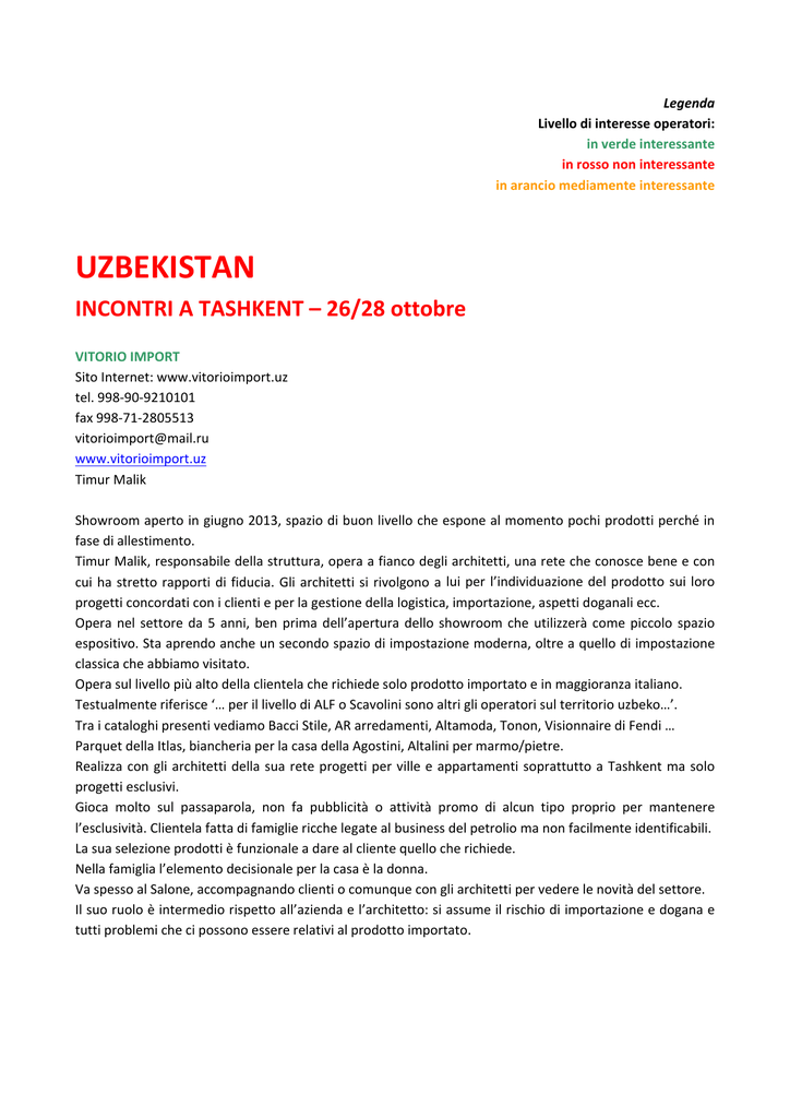 Legenda Livello di interesse operatori: in verde interessante in rosso non interessante in arancio mediamente interessante UZBEKISTAN INCONTRI A TASHKENT – 26/28 ottobre VITORIO IMPORT Sito Internet: www.vitorioimport.uz tel. 998‐90‐9210101 fax 998‐71‐2805513 [email protected] www.vitorioimport.uz Timur Malik Showroom aperto in giugno 2013, spazio di buon livello che espone al momento pochi prodotti perché in fase di allestimento. Timur Malik, responsabile della struttura, opera a fianco degli architetti, una rete che conosce bene e con cui ha stretto rapporti di fiducia. Gli architetti si rivolgono a lui per l’individuazione del prodotto sui loro progetti concordati con i clienti e per la gestione della logistica, importazione, aspetti doganali ecc. Opera nel settore da 5 anni, ben prima dell’apertura dello showroom che utilizzerà come piccolo spazio espositivo. Sta aprendo anche un secondo spazio di impostazione moderna, oltre a quello di impostazione classica che abbiamo visitato. Opera sul livello più alto della clientela che richiede solo prodotto importato e in maggioranza italiano. Testualmente riferisce ‘… per il livello di ALF o Scavolini sono altri gli operatori sul territorio uzbeko…’. Tra i cataloghi presenti vediamo Bacci Stile, AR arredamenti, Altamoda, Tonon, Visionnaire di Fendi … Parquet della Itlas, biancheria per la casa della Agostini, Altalini per marmo/pietre. Realizza con gli architetti della sua rete progetti per ville e appartamenti soprattutto a Tashkent ma solo progetti esclusivi. Gioca molto sul passaparola, non fa pubblicità o attività promo di alcun tipo proprio per mantenere l’esclusività. Clientela fatta di famiglie ricche legate al business del petrolio ma non facilmente identificabili. La sua selezione prodotti è funzionale a dare al cliente quello che richiede. Nella famiglia l’elemento decisionale per la casa è la donna. Va spesso al Salone, accompagnando clienti o comunque con gli architetti per vedere le novità del settore. Il suo ruolo è intermedio rispetto all’azienda e l’architetto: si assume il rischio di importazione e dogana e tutti problemi che ci possono essere relativi al prodotto importato. OQ TEPA ТеL.: (99871) 288‐27‐21, (99893) 589‐89‐35 Javdat Gayratovich ‐ Director Struttura con due negozi a Tashkent e un rapporto di esclusiva con Gautier. E’ il più grosso importatore di livello medio in tutto l’Uzbekistan. L’altro negozio che visitiamo si chiama Intermebel’ e ha solo mobile di provenienza italiana, francese, polacca, serba. Tra i produttori italiani Camel Group, espositori Nieri ma non prodotto per rapporti avuti in passato e dichiara di lavorare attualmente con Elle Salotti. Riferisce di lavorare limitatamente con architetti e designer: per il tipo di prodotto che tratta fa riferimento principalmente alla vendita retail per il privato. Dalla visualizzazione della nostra presentazione dimostra interesse per aziende di imbottito come Goldconfort e Picci per incrementare l’area infanzia. MEBEL E‐CLASSA Sito Internet: www.mebel‐e.com Contatti: A. Temur Street, n. 60 tel. 998‐71‐2342626 fax 998‐71‐2342626 general@mebel‐e.com Ashot Gazaryan ‐ Store manager Da 17 anni sul mercato. Da 8 anni lavora con operatori italiani e polacchi. Ha aperto lo showroom ad inizio anno (showroom nuovo in fase di allestimento). Ha un rapporto di esclusiva con Camel Group ma vende anche altre imprese su catalogo. Per le cucine ad esempio lavorano con la Record. Interessato a ricevere informazioni su cucine medio livello, arredo e illuminazione di livello medio e medio/alto. MAKSIMA Email: [email protected] Viktor 998 71 976 3918 Negozio di basso profilo che dice di avere rapporti con aziende del Gimo e Ciac export. Ha un piano di esposizione per complemento in vetro, cristallo e porcellane di origine italiana in maggioranza, per il piano inferiore di solo arredo ha aziende spagnole. Non sembra lavorare molto. PERFECT DESIGN Hamza district, Sadik Azimov str., building 52A. 233 8150 Dilnoza Gazieva ‐ Director Designers and interior Studio di design estremamente interessante che opera da 8 anni sul mercato. Gestisce progetti importanti ma ha rapporti limitati e non diretti con le imprese produttrici di arredo e rivestimenti che inserisce nel progetto. Si affida a rivenditore di Dubai per approvvigionamento. La titolare si sposta col cliente a Dubai per la selezione e acquisto dell’arredo. Dichiara a questo proposito un forte interesse a stabilire rapporti diretti con le aziende che propone sui progetti ed avere di conseguenza una selezione di cataloghi importante a disposizione. Utilizzano prodotto italiano o spagnolo. Si occupano prevalentemente di progetti di ville e appartamenti. Il segmento su cui operano è principalmente il residenziale, benché abbiano avuto esperienze sul settore commerciale (hotel e business centre) ma non è il loro focus. Lo studio in cui andiamo è in una sede temporanea, non nell’ufficio stabile in cui operano di norma: si trovano qui in un’area che sembra diplomatica, ma è solo fatta da uffici di grandi aziende e quindi con sicurezza all’ingresso. Non è possibile accedere se non invitati. Hanno gestito la realizzazione di molti degli edifici intorno ai quali si trova l’ufficio, da qui la localizzazione temporanea funzionale alla gestione dei progetti stessi. Seguono di norma tutto il progetto, dall’aspetto costruttivo fino all’arredo d’interni. Dichiara che il gusto del cliente Uzbeko di alto livello è sia classico che moderno: in genere vengono proposte soluzioni che mescolano i due stili con indicazioni di gusto che provengono in massima parte da designer/architetto. Fino a soluzioni contemporanee o neo‐contemporanee. Ritiene che il mercato si sposterà presto verso il prodotto moderno passando per il neoclassico. La clientele ha 40/50 anni. Lo studio non lavora molto con i giovani che non hanno potere d’acquisto. Lo studio è