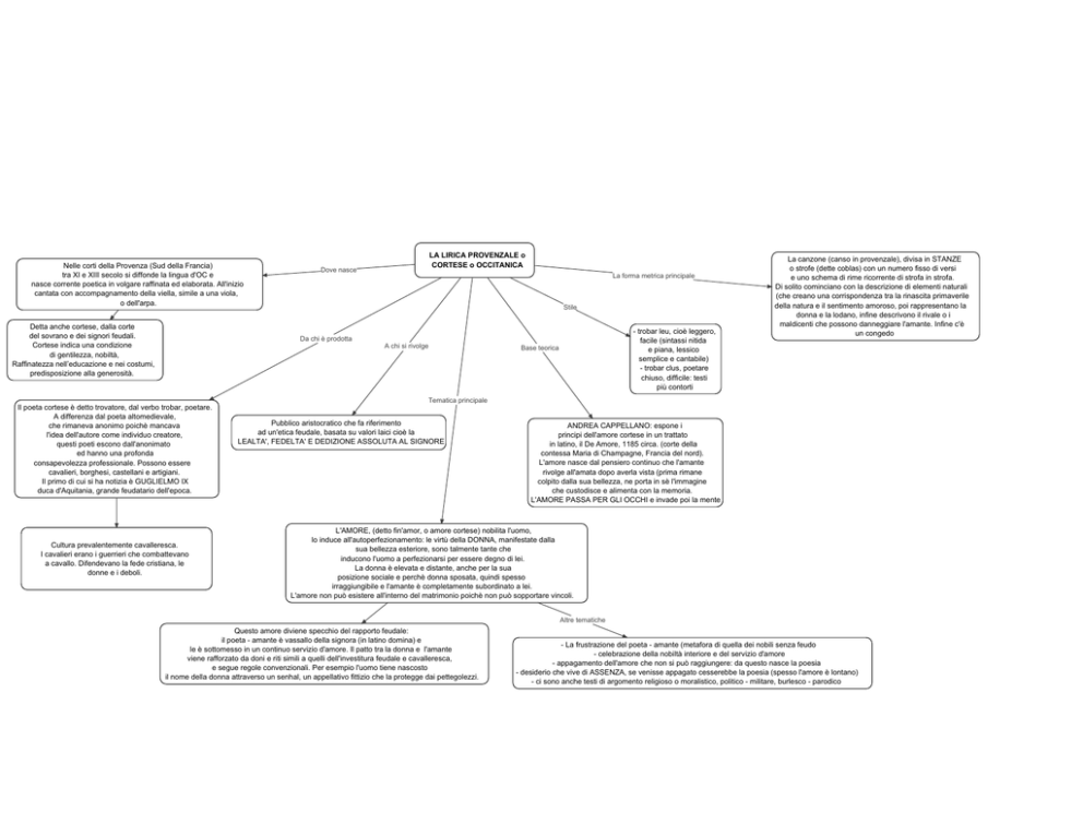 Nelle corti della Provenza (Sud della Francia) tra XI e XIII secolo si diffonde la lingua d'OC e nasce corrente poetica in volgare raffinata ed elaborata. All'inizio cantata con accompagnamento della viella, simile a una viola, o dell'arpa. Detta anche cortese, dalla corte del sovrano e dei signori feudali. Cortese indica una condizione di gentilezza, nobiltà, Raffinatezza nell’educazione e nei costumi, predisposizione alla generosità. LA LIRICA PROVENZALE o CORTESE o OCCITANICA Dove nasce La forma metrica principale Stile - trobar leu, cioè leggero, facile (sintassi nitida e piana, lessico semplice e cantabile) - trobar clus, poetare chiuso, difficile: testi più contorti Da chi è prodotta A chi si rivolge Base teorica La canzone (canso in provenzale), divisa in STANZE o strofe (dette coblas) con un numero fisso di versi e uno schema di rime ricorrente di strofa in strofa. Di solito cominciano con la descrizione di elementi naturali (che creano una corrispondenza tra la rinascita primaverile della natura e il sentimento amoroso, poi rappresentano la donna e la lodano, infine descrivono il rivale o i maldicenti che possono danneggiare l'amante. Infine c'è un congedo Tematica principale Il poeta cortese è detto trovatore, dal verbo trobar, poetare. A differenza dal poeta altomedievale, che rimaneva anonimo poichè mancava l'idea dell'autore come individuo creatore, questi poeti escono dall'anonimato ed hanno una profonda consapevolezza professionale. Possono essere cavalieri, borghesi, castellani e artigiani. Il primo di cui si ha notizia è GUGLIELMO IX duca d'Aquitania, grande feudatario dell'epoca. Cultura prevalentemente cavalleresca. I cavalieri erano i guerrieri che combattevano a cavallo. Difendevano la fede cristiana, le donne e i deboli. Pubblico aristocratico che fa riferimento ad un'etica feudale, basata su valori laici cioè la LEALTA', FEDELTA' E DEDIZIONE ASSOLUTA AL SIGNORE ANDREA CAPPELLANO: espone i principi dell'amore cortese in un trattato in latino, il De Amore, 1185 circa. (corte della contessa Maria di Champagne, Francia del nord). L'amore nasce dal pensiero continuo che l'amante rivolge all'amata dopo averla vista (prima rimane colpito dalla sua bellezza, ne porta in sè l'immagine che custodisce e alimenta con la memoria. L'AMORE PASSA PER GLI OCCHI e invade poi la mente L'AMORE, (detto fin'amor, o amore cortese) nobilita l'uomo, lo induce all'autoperfezionamento: le virtù della DONNA, manifestate dalla sua bellezza esteriore, sono talmente tante che inducono l'uomo a perfezionarsi per essere degno di lei. La donna è elevata e distante, anche per la sua posizione sociale e perchè donna sposata, quindi spesso irraggiungibile e l'amante è completamente subordinato a lei. L'amore non può esistere all'interno del matrimonio poichè non può sopportare vincoli. Altre tematiche Questo amore diviene specchio del rapporto feudale: il poeta - amante è vassallo della signora (in latino domina) e le è sottomesso in un continuo servizio d'amore. Il patto tra la donna e l'amante viene rafforzato da doni e riti simili a quelli dell'investitura feudale e cavalleresca, e segue regole convenzionali. Per esempio l'uomo tiene nascosto il nome della donna attraverso un senhal, un appellativo fittizio che la protegge dai pettegolezzi. - La frustrazione del poeta - amante (metafora di quella dei nobili senza feudo - celebrazione della nobiltà interiore e del servizio d'amore - appagamento dell'amore che non si può raggiungere: da questo nasce la poesia - desiderio che vive di ASSENZA, se venisse appagato cesserebbe la poesia (spesso l'amore è lontano) - ci sono anche testi di argomento religioso o moralistico, politico - militare, burlesco - parodico