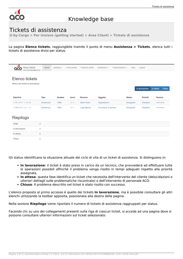 Tickets di assistenza Knowledge base Tickets di assistenza U-by-Cargo > Per iniziare (getting started) > Area Clienti > Tickets di assistenza La pagina Elenco tickets, raggiungibile tramite il punto di menu Assistenza > Tickets, elenca tutti i tickets di assistenza divisi per status. Gli status identificano la situazione attuale del ciclo di vita di un ticket di assistenza. Si distinguono in: In lavorazione: il ticket è stato preso in carico da un tecnico, che provvederà ad effettuare tutte le operazioni possibili affinché il problema venga risolto in tempi adeguati rispetto alla priorità assegnata. In attesa: questa fase identifica un ticket che necessita dell'intervento del cliente (delucidazioni o ulteriori dettagli sulle problematiche riscontrate) o dell'intervento di personale ACO. Chiuso: Il problema descritto nel ticket è stato risolto con successo. L'elenco proposto al primo accesso è quello dei tickets In lavorazione, ma è possibile consultare gli altri elenchi utilizzando la toolbar apposita, posizionata alla destra della pagina. Nella sezione Riepilogo viene riportato il numero di tickets di assistenza raggruppati per status. Facendo clic su uno dei collegamenti presenti sulla riga di ciascun ticket, si accede ad una pagina dove si possono consultare ulteriori informazioni sul ticket selezionato: Pagina 1 di 4 | acoinformatica.it/help | © 2014 - A.C.O. Informatica Srl, Partita IVA IT13149600150. Tutti i diritti riservati. Tickets di assistenza Nella pagina sono riportati anche la lista degli interventi effettuati con i dettagli relativi, inclusa la durata e l'addebito. Comunicazioni Il pulsante Comunicazioni permette di comunicare con i nostri operatori, tramite una finestra interattiva: Pagina 2 di 4 | acoinformatica.it/help | © 2014 - A.C.O. Informatica Srl, Partita IVA IT13149600150. Tutti i diritti riservati. Tickets di assistenza Pagina 3 di 4 | acoinformatica.it/help | © 2014 - A.C.O. Informatica Srl, Partita IVA IT13149600150. Tutti i diritti riservati. Tickets di assistenza Il supporto via chat in tempo reale è disponibile solo quanto lo status del ticket si trova In lavorazione o In attesa. Nel caso di ticket Chiuso non è più possibile l'interazione. Pagina 4 di 4 | acoinformatica.it/help | © 2014 - A.C.O. Informatica Srl, Partita IVA IT13149600150. Tutti i diritti riservati. Powered by TCPDF (www.tcpdf.org)