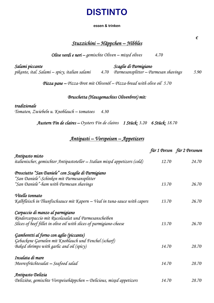 DISTINTO essen & trinken € Stuzzichini – Häppchen – Nibbles Olive verdi e neri – gemischte Oliven – mixed olives Salami piccante pikante, ital. Salami – spicy, italian salami 4.70 4.70 Scaglie di Parmigiano Parmesansplitter – Parmesan shavings 5.90 Pizza pane – Pizza-Brot mit Olivenöl – Pizza-bread with olive oil 5.70 Bruschetta (Hausgemachtes Olivenbrot) mit: tradizionale Tomaten, Zwiebeln u. Knoblauch – tomatoes 4.30 Austern Fin de claires – Oysters Fin de claires 1 Stück: 3.20 6 Stück: 18.70 Antipasti – Vorspeisen – Appetizers Antipasto misto italienischer, gemischter Antipastoteller – Italian mixed appetizers (cold) für 1 Person für 2 Personen 12.70 24.70 Prosciutto “San Daniele” con Scaglie di Parmigiano “San Daniele”-Schinken mit Parmesansplitter “San Daniele”-ham with Parmesan shavings 13.70 26.70 Vitello tonnato Kalbfleisch in Thunfischsauce mit Kapern – Veal in tuna-sauce with capers 13.70 26.70 Carpaccio di manzo al parmigiano Rindercarpaccio mit Rucolasalat und Parmesanscheiben Slices of beef fillet in olive oil with slices of parmigiano-cheese 13.70 26.70 Gamberetti al forno con aglio (piccante) Gebackene Garnelen mit Knoblauch und Fenchel (scharf) Baked shrimps with garlic and oil (spicy) 14.70 28.70 Insalata di mare Meeresfrüchtesalat – Seafood salad 14.70 28.70 Antipasto Delizia Deliziöse, gemischte Vorspeisehäppchen – Delicious, mixed appetizers 14.70 28.70 DISTINTO essen & trinken Zuppa – Suppe – Soups € Minestrone all’ ortolana Gemüsesuppe Vegetables soup 7.30 Crema di pomodoro Tomatencremesuppe Tomato soup 7.30 Zuppa di pesce Edelfischsuppe Fish soup 12.90 Insalata – Salate – Salad Insalata mista Bunter Salat in hauseigenem Dressing Mixed salad with home-made dressing 7.50 Pomodorini ciliegia con Burrata-Mozzarella e basilico Cherrytomaten mit Burrata-Mozzarella und Basilikum in Olivenöl Burrata-Mozzarella-cheese with cherry tomatoes and basil 12.70 Insalata mista con petto di tacchino affettato Bunter Salat mit Putenbruststreifen in hauseigenem Dressing Mixed salad with pieces of turkey breast in Balsamicovinaigrette 13.70 Formaggio di capra con Insalata di rucola, noci e miele Gebackener Ziegenkäse auf Rucolasalat mit Nüssen und Honig Baked goat cheese with rocket salad, nuts and honey 13.70 Insalata di campo con le punte di filetto di manzo (150 g) Feldsalat mit 150 g arg. Black Angus-Rinderfiletspitzen in hauseigenem Dressing Lamb’s lettuce salad with pieces of arg. Black Angus-beef fillet (150 g) in Balsamicovinaigrette 18.90 DISTINTO essen & trinken € Pasta – Nudeln – Noodles Spaghetti aglio, olio e peperoncino Spaghetti mit Knoblauch, Olivenöl und Peperoni Spaghetti with garlic, olive oil and hot pepper 11.70 Spaghetti alla carbonara Spaghetti mit Sahne, Eiern und Speck Spaghetti with cream, eggs and bacon 11.70 Penne arrabbiata (piccante) Penne mit Tomatensauce, Knoblauch und Peperoni (scharf) Penne with tomato sauce, garlic and hot pepper (spicy) 11.70 Farfalle con Bolognese di vitello Farfalle mit Kalbsbolognese Farfalle with calf’s Bolognese 11.70 Spaghettini nella forma di parmigiano reggiano con tartufo nero Spaghettini im Parmigiano-Reggianoleib mit schwarzen Trüffeln Spaghettini in parmigiano-cheese with black truffles für 1 Person: 21.70 für 2 Personen: 39.70 Pasta fresca – Frische Nudeln – Fresh Noodles Tagliatelle al salmone Tagliatelle mit Lachs Tagliatelle with salmon 13.70 Caramelle con pomodrini ciliegia e basilico Caramelle (Füllung: Ricotta und Spinat) mit Cherrytomaten und Basilikum Caramelle (Stuffed with: Ricotta and spinach) with cherry tomatoes and basil 13.70 Ravioloni con spinaci e noci al gorgonzola Ravioloni (Füllung: Käse und Birnen) mit Baby-Spinat, Nüssen und Gorgonzola Ravioloni (Stuffed with: cheese and pear) with baby-spinach, nuts and Gorgonzola 14.70 Tagliatelle rosse ai gamberi con spinaci Rote Tagliatelle mit Garnelen und Baby-Spinat Red Tagliatelle mit shrimps and Baby-spinach 18.70 Gnocchi di patate con Ragú di filetto di manzo Gnocchi mit Ragout von Rinderfiletspitzen Gnocchi with ragout of beef fillet 18.90 DISTINTO essen & trinken Pesce – Fisch – Fish € Salmone alla griglia Lachsfilet vom Holzkohlegrill Salmon fillet grilled 22.70 Orata alla griglia Dorade Royal vom Holzkohlegrill Gilthead grilled 24.70 Gamberoni giganti alla griglia (selvatico) Black tiger-Riesengarnelen vom Holzkohlegrill (Wildfang) King-size prawns grilled (captured wild) 28.70 Orata al sale Dorade Royal in Salzkruste Gilthead in salt crust 28.70 Gamberoni giganti all’aglio e pepe (selvatico) Black tiger- Riesengarnelen mit Knoblauch in Pfeffersauce (Wildfang) King-size prawns in peppersauce with garlic (captured wild) 29.70 Diese Fischgerichte sind inclusive Beilage This fish dishes are served with garnishing Täglich weitere marktfrische Fische vorhanden. Unser Serviceteam berät Sie gern! We have daily more fresh fish. Our waiters will advise you! Carne – Fleisch – Meat Saltimbocca alla Romana Kalbsschnitzel mit Parmaschinken und Salbei Veal escalope with Parma ham and sage 24.70 Fegato di vitello al burro e salvia Kalbsleber in Butter und Salbei Calf’s liver in butter and sage 24.70 Filetto di manzo (200 g) alla diavola (piccante) 200 g arg. Black Angus-Rinderfilet mit Riesengarnele und Champignons in Pfeffersauce (scharf) 200 g arg. Black Angus-beef fillet with prawn and buttom-mushrooms in peppersauce (spicy) 34.70 Diese Fleischgerichte sind inclusive Beilage This meat dishes are served with garnishing DISTINTO essen & trinken € Spezialitäten vom Holzkohlegrill Paiarda di vitello alla griglia Gegrilltes Kalbsschnitzel (dünn geschnitten) – Grilled veal escalope (thin) (200g) 17.90 Bistecca di manzo alla griglia Gegrilltes argentinisches Black-Angus Rumpsteak – Grilled argentinean Rumpsteak (300g) 23.90 Costolette d’agnello alla griglia Gegrillte Lammkoteletts aus Neuseeland – Grilled ccutlets of lamb from New Zealand (450g) 26.70