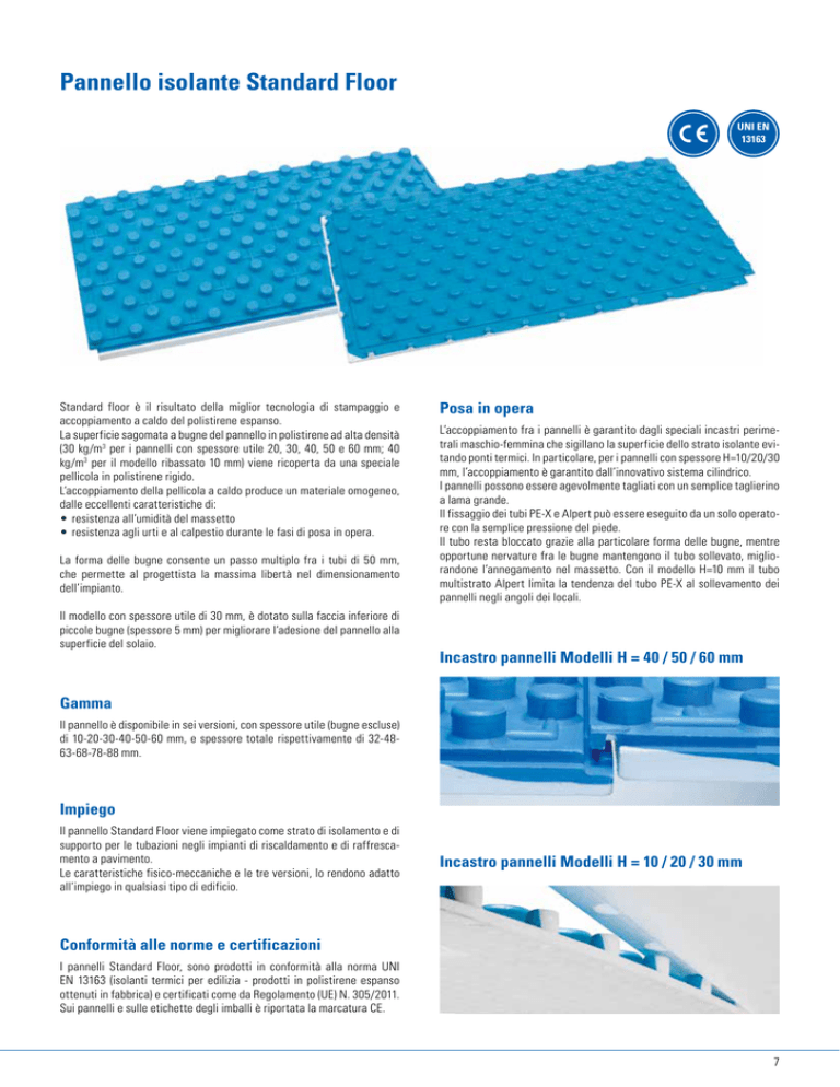 Pannello isolante Standard Floor UNI EN 13163 Standard floor è il risultato della miglior tecnologia di stampaggio e accoppiamento a caldo del polistirene espanso. La superficie sagomata a bugne del pannello in polistirene ad alta densità (30 kg/m3 per i pannelli con spessore utile 20, 30, 40, 50 e 60 mm; 40 kg/m3 per il modello ribassato 10 mm) viene ricoperta da una speciale pellicola in polistirene rigido. L’accoppiamento della pellicola a caldo produce un materiale omogeneo, dalle eccellenti caratteristiche di: • resistenza all’umidità del massetto • resistenza agli urti e al calpestio durante le fasi di posa in opera. La forma delle bugne consente un passo multiplo fra i tubi di 50 mm, che permette al progettista la massima libertà nel dimensionamento dell’impianto. Il modello con spessore utile di 30 mm, è dotato sulla faccia inferiore di piccole bugne (spessore 5 mm) per migliorare l’adesione del pannello alla superficie del solaio. Posa in opera L’accoppiamento fra i pannelli è garantito dagli speciali incastri perimetrali maschio-femmina che sigillano la superficie dello strato isolante evitando ponti termici. In particolare, per i pannelli con spessore H=10/20/30 mm, l’accoppiamento è garantito dall’innovativo sistema cilindrico. I pannelli possono essere agevolmente tagliati con un semplice taglierino a lama grande. Il fissaggio dei tubi PE-X e Alpert può essere eseguito da un solo operatore con la semplice pressione del piede. Il tubo resta bloccato grazie alla particolare forma delle bugne, mentre opportune nervature fra le bugne mantengono il tubo sollevato, migliorandone l’annegamento nel massetto. Con il modello H=10 mm il tubo multistrato Alpert limita la tendenza del tubo PE-X al sollevamento dei pannelli negli angoli dei locali. Incastro pannelli Modelli H = 40 / 50 / 60 mm Gamma Il pannello è disponibile in sei versioni, con spessore utile (bugne escluse) di 10-20-30-40-50-60 mm, e spessore totale rispettivamente di 32-4863-68-78-88 mm. Impiego Il pannello Standard Floor viene impiegato come strato di isolamento e di supporto per le tubazioni negli impianti di riscaldamento e di raffrescamento a pavimento. Le caratteristiche fisico-meccaniche e le tre versioni, lo rendono adatto all’impiego in qualsiasi tipo di edificio. Incastro pannelli Modelli H = 10 / 20 / 30 mm Conformità alle norme e certificazioni I pannelli Standard Floor, sono prodotti in conformità alla norma UNI EN 13163 (isolanti termici per edilizia - prodotti in polistirene espanso ottenuti in fabbrica) e certificati come da Regolamento (UE) N. 305/2011. Sui pannelli e sulle etichette degli imballi è riportata la marcatura CE. 7 Codice di designazione Modelli H=10 mm EPS-EN13163-T2-L3-W3-S2-P5D S(70,-)1-BS350-CS(10)250-DS(N)2-WL(T)5 UNI EN 13163 Modelli H=20, 30, 40, 50, 60 mm EPS-EN13163-T2-L3-W3-S2-P5DS(70,-)1-BS250-CS(10)200-DS(N)2-WL(T)5 Imballo Tipo Pannelli per pacco Superficie utile per pacco Dimensioni (mm) Modello H=10 mm Scatola di cartone n° 22 Modello H=20 mm Scatola di cartone n° 12 Modello H=30 mm Scatola di cartone n° 10 Modello H=40 mm Scatola di cartone n° 8 Modello H=50 mm Scatola di cartone n° 7 Modello H=60 mm Scatola di cartone n° 6 14,52 m2 7,92 m2 6,6 m2 5,28 m2 4,62 m2 3,96 m2 1155 x 665 x 520 1155 x 665 x 450 1155 x 665 x 520 1155 x 655 x 555 1155 x 665 x 520 1155 x 655 x 555 Materiali Pannello Polistirene espanso (EPS) Foglio di rivestimento Polistirene rigido Caratteristiche fisiche Proprietà Norma Valore Tipo mod. H=20 mm, H=30 mm, H=40 mm, H=50 mm e H=60 mm UNI EN 13163 EPS 200 Tipo mod. H=10 mm UNI EN 13163 EPS 250 Conduttività termica λD (λins) mod. H=20 mm, H=30 mm, H=40 mm, H=50 mm e H=60 mm EN 12939 (UNI EN 1264) 0.035 W/mK Conduttività termica λD (λins) mod. H=10 mm EN 12939 (UNI EN 1264) 0.034 W/mK Densità nominale mod. H=20 mm, H=30 mm, H=40 mm, H=50 mm e H=60 mm UNI EN 1602 30 kg/m3 Densità nominale mod. H=10 mm UNI EN 1602 40 kg/m3 UNI EN 826 ≥ 200 kPa UNI EN 826 ≥ 250 kPa Resistenza a compressione al 10% di schiacciamento mod. H=20 mm, H=30 mm, H=40 mm, H=50 mm e H=60 mm Resistenza a compressione al 10% di schiacciamento mod. H=10 mm Classe di reazione al fuoco UNI EN ISO 11925 Euroclasse E Assorbimento d’acqua EN 12087 < 5% Fattore resistenza diffusione vapore d’acqua μ EN 12086 40÷100 Spessore del film di rivestimento 0,16 mm Dati tecnici Descrizione Norma EN 12939 Resistenza termica RD Lunghezza totale Larghezza totale Spessore totale Spessore lastra UNI EN 1264 UNI EN 1264 Spessore equivalente Sins Resistenza termica R λ,ins (Sins / λins) UNI EN 1264 Superficie utile Passo tubi Ø esterno tubi installabili 8 Modello H=10 mm 0,45 m2 K/W 1135 mm 635 mm 32 mm 10 mm 15,78 mm 0,45 m2 K/W 0,66 m2 50 mm 16-17 mm Modello H=20 mm 0,75 m2 K/W 1135 mm 635 mm 48 mm 20 mm 27,03 mm 0,75 m2 K/W 0,66 m2 50 mm 16-17 mm Modello H=30 mm 1,05 m2 K/W 1135 mm 635 mm 63 mm 30 mm 37,03 mm 1,05 m2 K/W 0,66 m2 50 mm 16-17 mm Modello H=40 mm 1,35 m2 K/W 1120 mm 620 mm 68 mm 30 mm 47,03 mm 1,35 m2 K/W 0,66 m2 50 mm 16-17 mm Modello H=50 mm 1,65 m2 K/W 1120 mm 620 mm 78 mm 50 mm 57,03 mm 1,65 m2 K/W 0,66 m2 50 mm 16-17 mm Modello H=60 mm 1,90 m2 K/W 1120 mm 620 mm 88 mm 30 mm 67,03 mm 1,90 m2 K/W 0,66 m2 50 mm 16-17 mm Schema accoppiamento pannelli Striscia perimetrale Modelli H = 10/20/30 Incastro femmina Incastro maschio Striscia perimetrale Modelli H = 40/50/60 Incastro maschio Incastro femmina Dente maschio Dimensioni (mm) Modello H = 10 Modelli H = 20/30 1100 50 35 100 50 1100 50 600 50 600 100 100 35 35 100 35 A A A A Modello H = 40/50/60 20 1100 50 600 50 100 20 100 A A 9 Esempio d’installazione pannello Standard Floor Battiscopa Pavimento Intonaco Striscia isolante perimetrale Massetto Tubo Alpert Tubo PE-X Pannello Standard Floor Foglio in polietilene Rete elettrosaldata Sezioni (mm) Pannello 1100 x 600 H 20 sez. A-A sez. A-A 48 20 32 10 2 7 Pannello 1100 x 600 H 10 Pannello 1100 x 600 H 40 sez. A-A sez. A-A 68 40 63 5