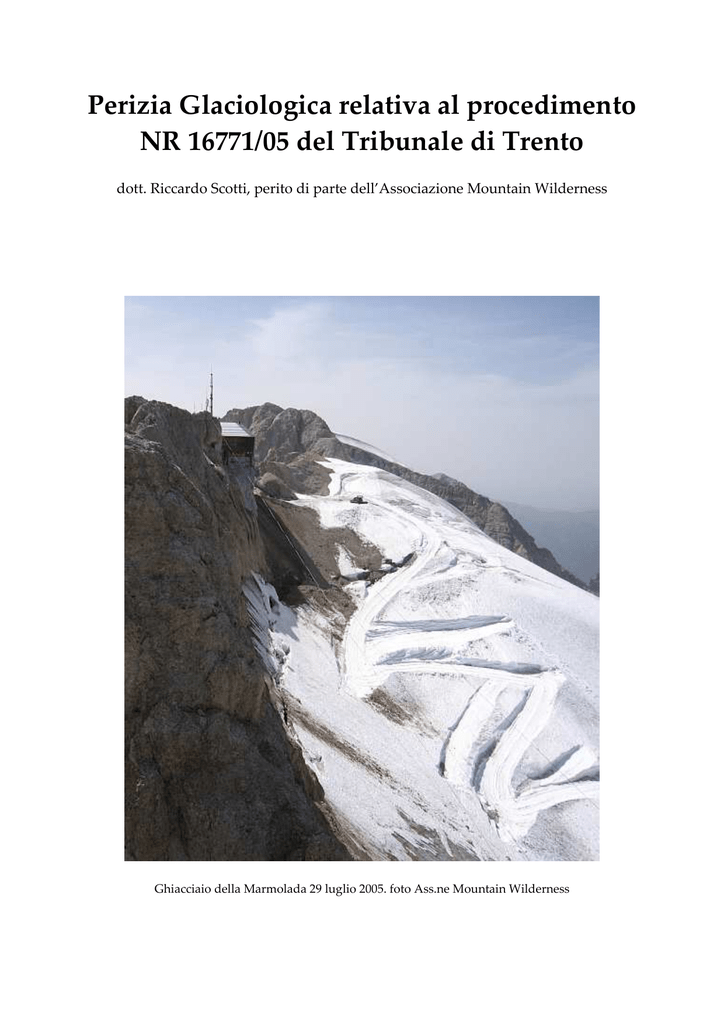 Perizia Glaciologica relativa al procedimento NR 16771/05 del Tribunale di Trento dott. Riccardo Scotti, perito di parte dell’Associazione Mountain Wilderness Ghiacciaio della Marmolada 29 luglio 2005. foto Ass.ne Mountain Wilderness Indice 1.0 Relazione a cura dello scrivente dei due sopralluoghi effettuati dal Collegio dei Periti - pag.3 1.1 Il sopralluogo del 19 maggio 2006 - pag 3 1.2 Il sopralluogo del 27 agosto 2006 - pag 7 2.0 Gli impatti sul Ghiacciaio della traccia effettuata nell’estate del 2005 - pag 9 2.1 La maggior vulnerabilità alla fusione del firn pluriennale presente al di sotto del manto nevoso - pag 10 2.2 L’alterazione del profilo originale del firn pluriennale - pag 13 2.3 L’alterazione della stabilità del manto nevoso - pag 16 2.4 Il danno paesaggistico - pag 17 3.0 I quesiti posti al perito - pag 18 4.0 Bibliografia - pag 21 5.0 Riferimenti relativi al caso in oggetto - pag 21 2 1.0 Relazione a cura dello scrivente dei due sopralluoghi effettuati dal Collegio dei periti 1.1 Il sopralluogo del 19 maggio 2006 In data 19 maggio 2006 si è svolto il primo sopralluogo sul Ghiacciaio della Marmolada. La zona interessata dalla traccia contestata è stata osservata scrupolosamente dall’alto (funivia) e da terra. È stata poi effettuata una serie di misure dello spessore del manto nevoso ed una trincea nivologica sul margine destro idrografico della pista da sci nel punto di coordinate 1719992 est e 5146302 nord (Gauss Boaga F32). Le caratteristiche meccaniche, termiche e cristallografiche del manto nevoso sono riportate nel modello 4 AINEVA (fig. 5). Non è stato possibile raggiungere la base dello strato nevoso della stagione 2005/2006 a causa dell’elevata resistenza meccanica della neve in profondità. Le numerose misure di spessore del manto nevoso effettuate mediante sonda telescopica hanno fornito risultati piuttosto disomogenei con spessori misurati fra 400 e 150 cm estremamente variabili anche a pochi metri di distanza. L’impressione derivata dall’analisi nivologica effettuata è di un notevole rimodellamento meccanico del manto nevoso occorso durante la stagione autunnale ed invernale. Molto probabilmente la compattazione meccanica dei mezzi battipista è la causa primaria della difficoltà nel reperimento di dati validi altrimenti generalmente ottenibili su superfici nivo-glaciali naturali. L’azione meccanica dei “gatti delle nevi” per la preparazione della pista da sci invernale ha certamente modificato in modo considerevole l’area rendendo difficili le valutazioni sullo stato di ripristino della zona interessata dall’opera contestata. Fig. 1. La parte alta della pista da sci P.ta Rocca-Serauta vista dalla funivia il 19.05.2006. R.Scotti 3 Fig. 2. Operazioni di scavo della trincea stratigrafica, 19.05.2006. R.Scotti Fig. 3. Analisi stratigrafica del manto nevoso 19.05.2006. R.Scotti 4 Fig. 4. La contropendenza sul ghiacciaio formata dalla pista da sci guardando verso P.ta Serauta 19.05.2006. R.Scotti 5 Fig. 5. Il profilo del manto nevoso riscontrato il 19.05.2006, gli strati in profondità presentano una elevata densità e resistenze meccaniche. Il profilo termico indica che gli strati profondi sono ancora “freddi” mostrando temperature decisamente inferiori agli 0°C, il manto nevoso non ha ancora raggiunto la condizione di omotermia tipica della fase estiva 6 1.2 Il sopralluogo del 27 agosto 2006 Durante il sopralluogo del 27 agosto sono state effettuate osservazioni morfologiche della parte alta del Ghiacciaio della Marmolada dall’alto (funivia) e percorrendo il tratto Punta Rocca-Serauta. È stata effettuata un’analisi stratigrafica speditiva per valutare lo spessore della neve recente e l’eventuale presenza di neve vecchia stagionale. Quest’ultima sembra essere presente sul tracciato della pista da sci. Il suo spessore risulta comunque piuttosto limitato visto che affiorano numerosi crepacci soprattutto nella parte medio bassa del tracciato compresa fra i 3150 ed i 3050 m. La neve recente, attribuibile alle nevicate di agosto non ha quindi permesso di valutare compiutamente l’estensione e lo spessore della neve vecchia (quella relativa alla stagione di accumulo iniziata nell’ottobre 2005 e conclusasi nel maggio 2006). Allo stesso modo la lavorazione della neve vecchia durante il mese di luglio con mezzi battipista ha probabilmente mascherato completamente le evidenze morfologiche dell’opera oggetto della perizia. Fig. 6. Trincea nivologica speditiva utile a valutare lo spessore del manto nevoso recente (nevicate di agosto) rispetto alla neve primaverile ed estiva 27.8.2006. R.Scotti 7 Fig. 7. Nella parte bassa della pista si sono aperti numerosi crepacci che testimoniano lo scarsissimo innevamento residuo stagionale al di sotto della neve recente di agosto 27.8.2006. R.Scotti Fig. 8. L’innaturale profilo della pista da sci solcato da numerosi crepacci. 27.8.2006 R.Scotti. 8 2.0 Gli impatti sul Ghiacciaio della traccia effettuata nell’estate del 2005 In seguito ai due sopralluoghi svolti nell’estate del 2006 è apparso evidente come, a causa della riprofilatura e della movimentazione del manto nevoso effettuata dai mezzi battipista nel periodo invernale (autunno 2005-primavera 2006), sia indispensabile un’analisi accurata delle immagini relative all’estate del 2005 per poter valutare correttamente gli effetti dell’opera contestata sul Ghiacciaio. Per quanto riguarda i dati geometrici e topografici del tracciato non è stato possibile in alcun modo ripetere o verificare le perizie compiute nei primi giorni delle indagini (inizio agosto 2005). In particolare il verbale tecnico della P.A.T. del 10.08.2005 a cura dell’Ing. Nicola Paoli fornisce il valore di 2000 m³ di neve movimentata. Dal materiale iconografico e cartografico si desume che sono stati tracciati 10 tornanti per superare un dislivello di 200 m fra i 3070 m s.l.m. ed i 3270 m s.l.m.. Nel tratto più ripido sono state scavate 7 tracce inter