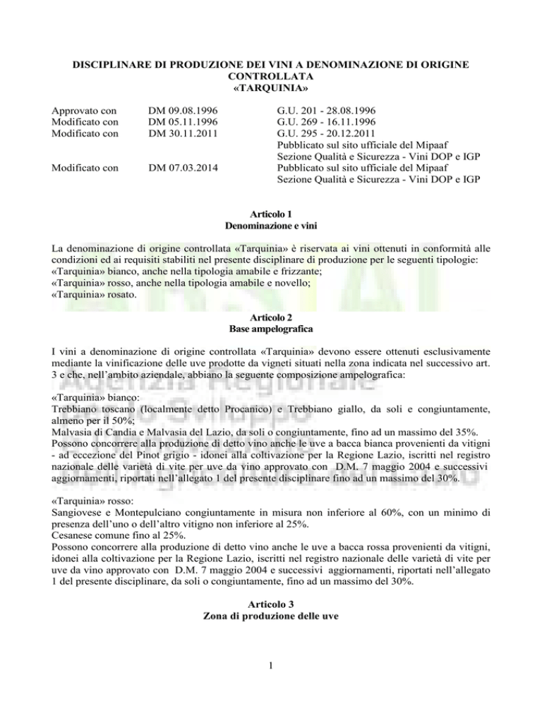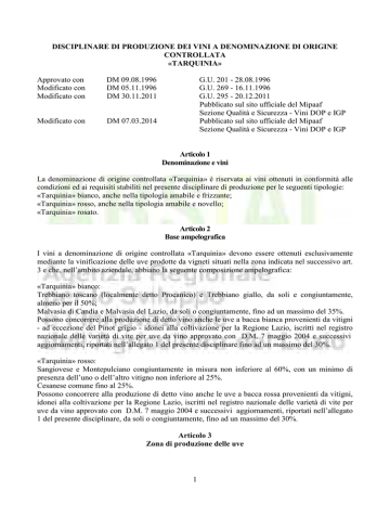 DISCIPLINARE DI PRODUZIONE DEI VINI A DENOMINAZIONE DI ORIGINE CONTROLLATA «TARQUINIA» Approvato con Modificato con Modificato con DM 09.08.1996 DM 05.11.1996 DM 30.11.2011 Modificato con DM 07.03.2014 G.U. 201 - 28.08.1996 G.U. 269 - 16.11.1996 G.U. 295 - 20.12.2011 Pubblicato sul sito ufficiale del Mipaaf Sezione Qualità e Sicurezza - Vini DOP e IGP Pubblicato sul sito ufficiale del Mipaaf Sezione Qualità e Sicurezza - Vini DOP e IGP Articolo 1 Denominazione e vini La denominazione di origine controllata «Tarquinia» è riservata ai vini ottenuti in conformità alle condizioni ed ai requisiti stabiliti nel presente disciplinare di produzione per le seguenti tipologie: «Tarquinia» bianco, anche nella tipologia amabile e frizzante; «Tarquinia» rosso, anche nella tipologia amabile e novello; «Tarquinia» rosato. Articolo 2 Base ampelografica I vini a denominazione di origine controllata «Tarquinia» devono essere ottenuti esclusivamente mediante la vinificazione delle uve prodotte da vigneti situati nella zona indicata nel successivo art. 3 e che, nell’ambito aziendale, abbiano la seguente composizione ampelografica: «Tarquinia» bianco: Trebbiano toscano (localmente detto Procanico) e Trebbiano giallo, da soli e congiuntamente, almeno per il 50%; Malvasia di Candia e Malvasia del Lazio, da soli o congiuntamente, fino ad un massimo del 35%. Possono concorrere alla produzione di detto vino anche le uve a bacca bianca provenienti da vitigni - ad eccezione del Pinot grigio - idonei alla coltivazione per la Regione Lazio, iscritti nel registro nazionale delle varietà di vite per uve da vino approvato con D.M. 7 maggio 2004 e successivi aggiornamenti, riportati nell’allegato 1 del presente disciplinare fino ad un massimo del 30%. «Tarquinia» rosso: Sangiovese e Montepulciano congiuntamente in misura non inferiore al 60%, con un minimo di presenza dell’uno o dell’altro vitigno non inferiore al 25%. Cesanese comune fino al 25%. Possono concorrere alla produzione di detto vino anche le uve a bacca rossa provenienti da vitigni, idonei alla coltivazione per la Regione Lazio, iscritti nel registro nazionale delle varietà di vite per uve da vino approvato con D.M. 7 maggio 2004 e successivi aggiornamenti, riportati nell’allegato 1 del presente disciplinare, da soli o congiuntamente, fino ad un massimo del 30%. Articolo 3 Zona di produzione delle uve 1 La zona di produzione delle uve ammessa alla produzione dei vini a denominazione di origine controllata «Tarquinia» è costituita dai territori: la provincia di Roma limitatamente agli interi territori amministrativi dei comuni di Allumiere, Tolfa, Bracciano, Cerveteri, Ladispoli, Civitavecchia, Santa Marinella, Canale Monterano, Manziana, Trevignano Romano, Anguillara ed, in parte, i territori amministrativi dei comuni di Campagnano Romano, Roma, Fiumicino e Formello; la provincia di Viterbo limitatamente agli interi territori amministrativi dei comuni di Montalto di Castro, Tarquinia, Blera, Oriolo Romano, Sutri, Bassano Romano, Villa San Giovanni in Tuscia, Barbarano Romano, Vejano e parte dei territori amministrativi dei comuni di Tessennano, Tuscania, Monteromano, Ronciglione, Arlena di Castro e Capranica. Tale zona è così delimitata: partendo dall'intersezione fra le province di Viterbo e Grosseto con il mar Tirreno, la linea di demarcazione della zona segue questo confine regionale fino a incontrare, lungo la "strada dell'Abbadia", il confine del territorio comunale di Canino. Segue il confine comunale di Canino prima in direzione nord, poi verso sud e poi ancora verso sud- est e infine a nord- est, fino a intersecare la strada che da Canino conduce a Tessennano. Prosegue lungo questa strada passando per i centri abitati di Tessennano, Arlena di castro e Tuscania. Da qui prosegue sempre su questa strada, in direzione di Vetralla, fino a incrociare, in località "ponte della Leia", il confine comunale di Viterbo. Percorrendo la direzione sud- ovest questo confine, verso Monte Romano, arriva a intersecare il confine comunale di Vetralla. Segue ancora questo confine in direzione sud per poi risalire verso nord- est in direzione Villa San Giovanni in Tuscia. Continuando lungo il confine comunale di Vetralla, arriva a intersecare, in località "Madonna del Piano", la strada che da Capranica conduce a Ronciglione. Continua la suddetta strada incrociando la via Cassia Antica che percorre fino a intersecare il confine del comune di Sutri. Proseguendo a sud lungo detto confine arriva a intersecare il confine comunale di Trevignano Romano (confine di provincia), che segue fino a incrociare la S.S. n. 2 Cassia percorrendo la quale incontra il gran raccordo anulare di roma. Prosegue lungo il raccordo anulare in direzione ovest fino all'intersezione con il fiume Tevere, che prende come confine fino alla diramazione del "Canale di Porto", che passando per il centro abitato di Fiumicino, si immette nel mar Tirreno. Da qui segue la linea di costa fino a incontrare il confine regionale tra le province di Grosseto e Viterbo da dove era partita. Articolo 4 Norme per la viticoltura Le condizioni ambientali e di coltura dei vigneti destinati alla produzione dei vini a denominazione di origine controllata «Tarquinia» devono essere quelle tradizionali della zona e comunque atte a conferire alle uve e al vino derivato le specifiche caratteristiche di qualità. Non sono ammessi i vigneti dei fondovalle umidi e quelli esposti su pendici ripide insufficientemente soleggiate. L’altitudine, massima e minima, è quella presente nella zona delimitata all’articolo 3. La densità dell’impianto minima deve essere di 2500 ceppi/ha, nei nuovi impianti e nei reimpianti. La potatura può essere corta, media o lunga, purché assicuri le caratteristiche tradizionali delle uve e il rispetto delle rese massime consentite. Nei nuovi impianti e nei reimpianti i sistemi di allevamento devono essere a controspalliera, o ad altro sistema che assicuri le c