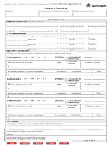 Il presente modulo è valido ai fini della conversione in Italia delle azioni di SCHRODER INTERNATIONAL SELECTION FUND Domanda di Conversione Collocatore Rif. di sottoscrizione (ad uso interno del Collocatore) Deposito Amministrato/posizione nr. Soggetto Incaricato dei Pagamenti: PRIMO SOTTOSCRITTORE (Persona Fisica - Società o Ente) cognome e nome/denominazione data di nascita codice fiscale comune di nascita prov. partita IVA stato di nascita ALTRI SOTTOSCRITTORI Secondo Sottoscrittore - In caso di Società o Ente, persona fisica con poteri di rappresentanza (barrare se inesistente) cognome e nome codice fiscale data di nascita cognome e nome codice fiscale data di nascita codice fiscale data di nascita Terzo Sottoscrittore (barrare se inesistente) Quarto Sottoscrittore (barrare se inesistente) cognome e nome MODALITÀ DI CONVERSIONE Il/i Sottoscritto/i chiede/ono la conversione delle proprie azioni secondo le modalità di seguito indicate: CLASSI DI AZIONI: A A1 B C DA: Nome del comparto da convertire CATEGORIA: ACCUMULAZIONE DISTRIBUZIONE N. Totale azioni possedute Valuta Commissione: N. Azioni da convertire 1. A: Nome del comparto in cui convertire nella categoria Accumulazione Valuta Distribuzione 1. CLASSI DI AZIONI: A A1 B C DA: Nome del comparto da convertire CATEGORIA: ACCUMULAZIONE DISTRIBUZIONE N. Totale azioni possedute Valuta Commissione: N. Azioni da convertire 2. A: Nome del comparto in cui convertire nella categoria Accumulazione Valuta Distribuzione 2. CLASSI DI AZIONI: A A1 B C DA: Nome del comparto da convertire CATEGORIA: ACCUMULAZIONE DISTRIBUZIONE N. Totale azioni possedute Valuta Commissione: N. Azioni da convertire 3. A: Nome del comparto in cui convertire nella categoria Accumulazione Valuta Distribuzione 3. TIPO DI AZIONI febbraio 2008 - SCH-MC_2008 Le azioni da convertire e le nuove azioni sono oggetto di Lettere di Conferma dell’Investimento Firma Primo Sottoscrittore Firma Secondo Sottoscrittore Firma Terzo Sottoscrittore Firma Quarto Sottoscrittore (Qualora si fosse optato per la firma congiunta, riportare la firma di tutti i Sottoscrittori) Luogo e data Firma del Promotore Finanziario o di colui che ha ricevuto il modulo facente fede della corretta compilazione e dell’identificazione dei firmatari anche ai sensi della legge n. 197/91 e successive integrazioni e modifiche (Firma) COPIA A - SICAV Il presente modulo è valido ai fini della conversione in Italia delle azioni di SCHRODER INTERNATIONAL SELECTION FUND Domanda di Conversione Collocatore Rif. di sottoscrizione (ad uso interno del Collocatore) Deposito Amministrato/posizione nr. Soggetto Incaricato dei Pagamenti: PRIMO SOTTOSCRITTORE (Persona Fisica - Società o Ente) cognome e nome/denominazione data di nascita codice fiscale comune di nascita prov. partita IVA stato di nascita ALTRI SOTTOSCRITTORI Secondo Sottoscrittore - In caso di Società o Ente, persona fisica con poteri di rappresentanza (barrare se inesistente) cognome e nome codice fiscale data di nascita cognome e nome codice fiscale data di nascita codice fiscale data di nascita Terzo Sottoscrittore (barrare se inesistente) Quarto Sottoscrittore (barrare se inesistente) cognome e nome MODALITÀ DI CONVERSIONE Il/i Sottoscritto/i chiede/ono la conversione delle proprie azioni secondo le modalità di seguito indicate: CLASSI DI AZIONI: A A1 B C DA: Nome del comparto da convertire CATEGORIA: ACCUMULAZIONE DISTRIBUZIONE N. Totale azioni possedute Valuta Commissione: N. Azioni da convertire 1. A: Nome del comparto in cui convertire nella categoria Accumulazione Valuta Distribuzione 1. CLASSI DI AZIONI: A A1 B C DA: Nome del comparto da convertire CATEGORIA: ACCUMULAZIONE DISTRIBUZIONE N. Totale azioni possedute Valuta Commissione: N. Azioni da convertire 2. A: Nome del comparto in cui convertire nella categoria Accumulazione Valuta Distribuzione 2. CLASSI DI AZIONI: A A1 B C DA: Nome del comparto da convertire CATEGORIA: ACCUMULAZIONE DISTRIBUZIONE N. Totale azioni possedute Valuta Commissione: N. Azioni da convertire 3. A: Nome del comparto in cui convertire nella categoria Accumulazione Distribuzione Valuta 3. TIPO DI AZIONI febbraio 2008 - SCH-MC_2008 Le azioni da convertire e le nuove azioni sono oggetto di Lettere di Conferma dell’Investimento Firma Primo Sottoscrittore Firma Secondo Sottoscrittore Firma Terzo Sottoscrittore Firma Quarto Sottoscrittore (Qualora si fosse optato per la firma congiunta, riportare la firma di tutti i Sottoscrittori) Luogo e data Firma del Promotore Finanziario o di colui che ha ricevuto il modulo facente fede della corretta compilazione e dell’identificazione dei firmatari anche ai sensi della legge n. 197/91 e successive integrazioni e modifiche (Firma) COPIA B - SOGGETTO INCARICATO DEI PAGAMENTI Il presente modulo è valido ai fini della conversione in Italia delle azioni di SCHRODER INTERNATIONAL SELECTION FUND Domanda di Conversione Collocatore Rif. di sottoscrizione (ad uso interno del Collocatore) Deposito Amministrato/posizione nr. Soggetto Incaricato dei Pagamenti: PRIMO SOTTOSCRITTORE (Persona Fisica - Società o Ente) cognome e nome/denominazione data di nascita codice fiscale comune di nascita prov. partita IVA stato di nascita ALTRI SOTTOSCRITTORI Secondo Sottoscrittore - In caso di Società o Ente, persona fisica con poteri di rappresentanza (barrare se inesistente) cognome e nome codice fiscale data di nascita cognome e nome codice fiscale data di nascita codice fiscale data di nascita Terzo Sottoscrittore (barrare se inesistente) Quarto Sottoscrittore (barrare se inesistente) cognome e nome MODALITÀ DI CONVERSIONE Il/i Sottoscritto/i chiede/ono la conversione delle proprie azioni secondo le modalità di seguito indicate: CLASSI DI AZIONI: A A1 B C DA: Nome del comparto da convertire CATEGORIA: ACCUMULAZIONE DISTRIBUZIONE N. Totale azioni possedute Valuta Commissione: N. Azioni da convertire 1. A: Nome del comparto in cui convertire nella categoria Accumulazione Valuta Distribuzione 1.