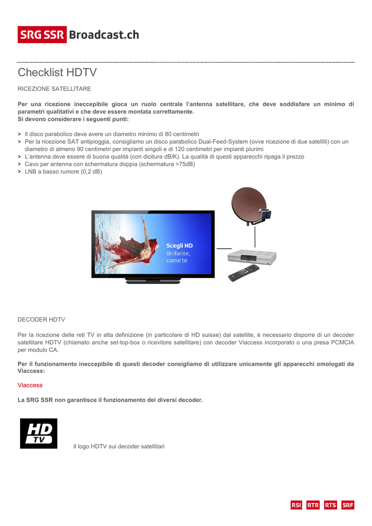 Checklist HDTV RICEZIONE SATELLITARE Per una ricezione ineccepibile gioca un ruolo centrale l’antenna satellitare, che deve soddisfare un minimo di parametri qualitativi e che deve essere montata correttamente. Si devono considerare i seguenti punti: > Il disco parabolico deve avere un diametro minimo di 80 centimetri > Per la ricezione SAT antipioggia, consigliamo un disco parabolico Dual-Feed-System (ovve ricezione di due satelliti) con un diametro di almeno 90 centimetri per impianti singoli e di 120 centimetri per impianti plurimi > L’antenna deve essere di buona qualità (con dicitura dB/K). La qualità di questi apparecchi ripaga il prezzo > Cavo per antenna con schermatura doppia (schermatura >75dB) > LNB a basso rumore (0,2 dB) DECODER HDTV Per la ricezione delle reti TV in alta definizione (in particolare di HD suisse) dal satellite, è necessario disporre di un decoder satellitare HDTV (chiamato anche set-top-box o ricevitore satellitare) con decoder Viaccess incorporato o una presa PCMCIA per modulo CA. Per il funzionamento ineccepibile di questi decoder consigliamo di utilizzare unicamente gli apparecchi omologati da Viaccess: Viaccess La SRG SSR non garantisce il funzionamento dei diversi decoder. Il logo HDTV sui decoder satellitari LE CARATTERISTICHE INDISPENSABILI DI UN DECODER SATELLITARE HDTV: Modulazione / demodulazione Standard di codifica MPEG video Standard di codifica MPEG audio Risoluzione Voltaggio del LNB e controllo Switch Connessioni: Antenna Video QPSK, 8 PSK DVB-S, DVB-S2 MPEG-2, MPEG-4 (H264AVC) MPEG-1 Dolby Digital (AC3), DD2.0 per stereo, DD5.1 per suono stereofonico 1280x720p 50 Hz, 1920x1080i, 50 Hz, 1920x1080p 25 Hz 13V / 18V 22kHz segnalel DiSEqC IEC 169 entrata antenna HDMI o DVI (compatibile con HDCP) Analogico: componenti Y,Pb,Pr o S-Video Min., 2 Scart Audio SPDIF interfaccia ottica (o coassiale) Cinch (analogico) Interfaccia dati Altre funzioni RS 232 Decoder Viaccess (necessario per HD suisse) Aggiornamento software via satellite (OTA) È consigliabile inoltre acquistare un decoder satellitare con disco rigido incorporato per registrarre programmi in qualità digitale e visionarli in un secondo momento. IMPORTANTE Per connettere il decoder con lo schermo HD o con il proiettore HD non è necessario utilizzare i collegamenti scart, Y/C e Composite della tecnologia SD. I collegamenti si effettuano per mezzo delle porte DVI o HDMI che trasportano il medesimo segnale (DVI video / HDMI suono e immagine). Le connessioni HDMI sono sempre protette dal sistema di protezione HDCP. Questo non vale per le interfacce DVI poiché non sono compatibili con il sistema HDCP. È necessario verificare che gli schermi o videoproiettori con entrata DVI portino la dicitura "supporta HDCP”. In caso contrario non sarebbe possibile accedere ai programmi protetti (per esempio film). * PRESA HDMI RIPRODUZIONE DELL’IMMAGINE (TELEVISIONE) In linea generale, è raccomandabile solo l’acquisto di schermi con le diciture seguenti: In ambito televisivo si è imposto il termine «Full HD». I fabbricanti sono liberi di utilizzare un logo individuale che però non garantisce né una prestazione tecnica minima né una qualità particolare. Per una riproduzione ottimale delle immagini è consigliabile disporre di uno schermo con una diagonale di almeno 40’’ (100 cm). Prima dell’acquisto vale la pena paragonare più modelli. È preferibile effettuare tale confronto con immagini in movimento; fermo-immagini o film d’animazione non sono raccomandabili per una simile verifica. RIPRODUZIONE DEL SUONO Oltre ai normali canali stereo, le reti HD della SSR dispongono di uno speciale canale audio per il suono digitale Surround, identico al Dolby Digital delle sale cinematografiche. Per beneficiare di questa qualità sonora oppure se utilizzate già un impianto Surround o un Homecinema, di solito serve un collegamento speciale (S/P dif) tra il ricevitore e l’impianto stesso. RICEZIONE HD VIA CAVO O TELECOM Praticamente tutti gli operatori via cavo e telecom propongono numerose reti HDTV. Rivolgetevi al vostro operatore di fiducia per gli ultimi aggiornamenti: www.swisscom.ch www.votre-téléréseau.ch 2011.07 Checklist HDTV © SRG SSR / subject to change without notice