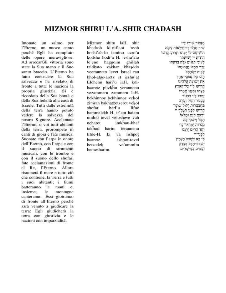 MIZMOR SHIRU L’A. SHIR CHADASH Intonate un salmo per l’Eterno, un nuovo canto perché Egli ha compiuto delle opere meravigliose. Ad arrecarGli vittoria sono state la Sua mano e il Suo santo braccio. L’Eterno ha fatto conoscere la Sua salvezza e ha rivelato di fronte a tutte le nazioni la propria giustizia. Si è ricordato della Sua bontà e della Sua fedeltà alla casa di Israele. Tutti dalle estremità della terra hanno potuto vedere la salvezza del nostro S-gnore. Acclamate l’Eterno, o voi tutti abitanti della terra, prorompete in canti di gioia e fate musica. Suonate con l’arpa in onore dell’Eterno, con l’arpa e con il suono di strumenti musicali, con le trombe e con il suono dello shofar, fate acclamazioni di fronte al Re, l’Eterno. Allora risuonerà il mare e tutto ciò che contiene, la Terra e tutti i suoi abitanti; i fiumi batteranno le mani e, insieme, le montagne canteranno. Essi gioiranno di fronte all’Eterno perché sarà venuto a giudicare la terra: Egli giudicherà la terra con giustizia e le nazioni con imparzialità. Mizmor shiru laH. shir kĥadash ki-niflaot ‘asah hoshi’ah-lo iemino uzro’a ķodsho hodi’a H. ieshu’ato le’ene haggoim ghillah tzidķato zakhar kĥaşddo veemunato levet Israel rau khol-afşe-aretz et ieshu’at Elohenu hari’u laH. kolhaaretz pitzkĥu verannenu vezammeru zammeru laH. bekhinnor bekhinnor veķol zimrah bakĥatzotzerot veķol shofar hari’u lifne hammelekh H. ir’am haiam umloo tevel veiosheve vah neharot imkĥau-khaf iakĥad harim ierannenu lifne-H. ki va lishpoţ haaretz ishpoţ-tevel betzedeķ ve’ammim bemesharim. ִַמזְמֹור ִׁשירּו ל ָׂשה ָ ִׁשיר ָחדָׁש ּכִינִ ְפלָאֹות ע הֹוׁשיעָהּלֹו יְמִינֹו ּוזְרֹו ַע ָקדְׁשֹו ִ הֹודִי ַע יְׁשּועָתֹו ְלעֵינֵי הַּגֹוים ִּגּלָה ִצ ְדקָתֹו זָכַר ַחסְּדֹו וֶאֱמּונָתֹו ִׂש ָראֵל ְ ְלבֵית י רֶץ+ ְפסֵי,רָאּו כָל אֵת יְׁשּועַת אֱלהֵינּו רֶץ+ָָהרִיעּו לַ ּכָלה ִּפצְחּו וְ ַרּנְנּו וְזַּמֵרּו זַּמְרּו לַ ְּבכִּנֹור ְּבכִּנֹור וְקֹול זִ ְמרָה ַּבחֲצצְרֹות וְקֹול ׁשֹופָר ָהרִיעּו ִל ְפנֵי ַה ֶּמ ֶל ְך יִ ְרעַם ַהּיָם ּומְלאֹו ְיׁש ֵבי בָּה ְ ֵּתבֵל ו נְהָרֹות יִ ְמחֲאּוכָף יַחַד ָהרִים יְ ַרּנֵנּו ִל ְפנֵי רֶץ+ִָׁשּפט ה ְ ּכִי בָא ל ִׁשּפט ֵּתבֵל ְּב ֶצדֶק ְי ֵיׁשרִים ָ וְ ַעּמִים ְּבמ