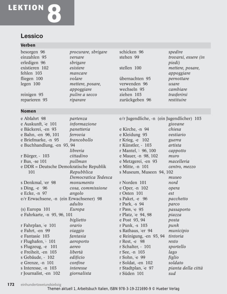 LE K T I O N 8 Lessico Verben besorgen 96 einzahlen 95 erledigen 96 existieren 102 fehlen 103 fliegen 100 legen 100 reinigen 95 reparieren 95 procurare, sbrigare versare sbrigare esistere mancare volare mettere, posare, appoggiare pulire a secco riparare schicken 96 stehen 99 stellen 100 übernachten 95 verwenden 96 wechseln 95 ziehen 103 zurückgeben 96 spedire trovarsi, essere (in piedi) mettere, posare, appoggiare pernottare usare cambiare trasferirsi restituire Nomen e Abfahrt 98 partenza .. e Auskunft, -e 101 informazione e Bäckerei, -en 93 panetteria e Bahn, -en 96, 101 ferrovia e Briefmarke, -n 95 francobollo e Buchhandlung, -en 93, 94 libreria r Bürger, - 103 cittadino r Bus, -se 101 pullman e DDR = Deutsche Demokratische Republik 101 Repubblica Democratica Tedesca .. s Denkmal, -er 98 monumento s Ding, -e 96 cosa, commissione e Ecke, -n 97 angolo e/r Erwachsene, -n (ein Erwachsener) 98 adulto (s) Europa 101 Europa e Fahrkarte, -n 95, 96, 101 biglietto .. r Fahrplan, -e 101 orario e Fahrt, -en 99 viaggio e Fantasie 103 fantasia .. r Flughafen, - 101 aeroporto s Flugzeug, -e 101 aereo e Freiheit, -en 103 libertà s Gebäude, - 102 edificio e Grenze, -n 101 confine s Interesse, -n 103 interesse r Journalist, -en 102 giornalista 172 einhundertzweiundsiebzig e/r Jugendliche, -n (ein Jugendlicher) 103 giovane e Kirche, -n 94 chiesa e Kleidung 95 vestiario r Krieg, -e 102 guerra r Künstler, - 103 artista .. r Mantel, - 96, 100 cappotto e Mauer, -n 98, 102 muro e Metzgerei, -en 93 macelleria e Mitte, -n 101 centro, mezzo s Museum, Museen 94, 102 museo r Norden 101 nord e Oper, -n 102 opera r Osten 101 est s Paket, -e 96 pacchetto r Park, -s 94 parco .. r Pass, -e 95 passaporto .. r Platz, -e 94, 98 piazza e Post 93, 94 posta r Punk, -s 103 punk .. s Rathaus, -er 94 municipio e Reinigung, -en 93, 94 tintoria r Rest, -e 98 resto r Schalter, - 101 sportello r See, -n 103 lago .. r Sohn, -e 99 figlio r Soldat, -en 102 soldato .. r Stadtplan, -e 97 pianta della città r Süden 101 sud Themen aktuell 1, Arbeitsbuch Italien, ISBN 978-3-19-221690-9 © Hueber Verlag LE K T I O N e Tasche, -n 100 r Teil, -e 98, 102 s Tor, -e 102 .. r Turm, -e 98 e Universität, -en 98 e Wahl, -en 101 borsetta, borsa parte porta (della città) torre università scelta r Weg, -e 97, 101 strada, via r Westen 101 ovest e Zeichnung, -en 99 disegno s Zentrum, Zentren 101, 102 centro disoccupato famoso vario tedesco prima, una volta, un tempo grau 103 sozial 103 voll 103 grigio sociale pieno diversamente diritto a sinistra rechts 97 völlig 102 weiter 97 a destra completamente sempre fino a così ... come ... über ... nach ... 101 von ... nach ... 101 via ... a ... da ... a/per ... 8 Adjektive arbeitslos 103 berühmt 102 bunt 103 deutsch 102 früher 102 Adverbien anders 103 geradeaus 97 links 97 Funktionswörter bis zu 97 so ... wie ... 103 Ausdruck zum Schluss 99 infine einhundertdreiundsiebzig Themen aktuell 1, Arbeitsbuch Italien, ISBN 978-3-19-221690-9 © Hueber Verlag 173 LEZION E Nach Übung 2 im Kursbuch Nach Übung 2 8 1. Completa. a) b) c) d) e) f) Bücher kaufen : Buchhandlung / Bücher leihen : ________________________________ Wäsche : waschen / einen Mantel : ________________________________ Essen : bestellen / eine Reise : ________________________________ Arzt : Praxis / Sekretärin : ________________________________ Geld auf die Bank bringen : einzahlen / Geld von der Bank holen :_____________________ Lebensmittel einkaufen : Supermarkt / (fast) alles einkaufen : __________________________ 2. Leggi e completa. a) Paul trägt die Koffer nicht selbst. im Kursbuch Er lässt die Koffer tragen. Nach Übung b) Paul: die Dusche reparieren c) d) e) f) g) h) das Auto in die Garage fahren den Kaffee machen den Brief beantworten den Koffer am Bahnhof abholen die Wäsche waschen die Hausarbeiten machen Paul: ich: er: ihr: Sie: ich: Paul repariert die … Er lässt … i) Paula: die Wohnung putzen j) du: den Schreibtisch aufräumen k) ich: das Essen und die Getränke bestellen l) Paul und Paula: das Frühstück machen 3. Qual è l’abbinamento giusto? 3 Tourist-Information Schwimmbad Commerzbank Biblioth ek Bahnhof Metzgerei Koch VW-Werkstatt rkt König Sprachschule Berger Superma Post o Ufa-Kin Parkcafé im Kursbuch Sie möchten … Wohin gehen Sie dann? a) Geld wechseln auf die Commerzbank b) das Auto reparieren lassen c) Deutsch lernen d) Briefmarken kaufen e) eine Fahrkarte kaufen f) einen Film sehen g) Informationen bekommen 174 einhundertvierundsiebzig Themen aktuell 1, Arbeitsbuch Italien, ISBN 978-3-19-221690-9 © Hueber Verlag LEZION E 8 h) einen Tee trinken i) schwimmen j) Fleisch kaufen k) Salat und Gemüse kaufen l) Bücher leihen 4. “In”, “auf”, “an” + dativo o accusativo? Nach Übung ● Was müssen wir noch für die Reise organisieren? ■ Wir müssen noch _________ Reisebüro gehen; und dann müssen wir Apotheke Reisetabletten kaufen. ● Hast du deinen Reisepass schon geholt? ■ Nein, ich war _________ Rathaus, aber der Pass ist erst morgen fertig. ● Dann hole ich den morgen ab. Ich muss auch _________ Rathaus gehen. ■ Wir müssen auch Reiseschecks besorgen. Das machen wir heute Nachmittag Bank. Übrigens, sollen wir auch Badesachen mitnehmen? ● Natürlich! _________ Hotel ist ein Schwimmbad, und wir gehen bestimmt auch ________ Meer. ■ Dann muss ich morgen _________ Kaufhaus Urban noch eine Badehose kaufen. ● Gut, wir fahren morgen ________ Innenstadt. Dann kannst du auch ________ Kaufhaus gehen. 5. Scrivi. 3 im Kursbuch Nach Übung 5 In der Stadt hin und her. Heute hat Paul viel erledigt. im Kursbuch b) a) c) < Um halb neun ist er von zu Hause weggefahren. f) Zuerst ist er zur Bank gefahren. Um neun Uhr war er … e) 11:00 09:30 09:00 08:30 Dann ist er zum … d) 10:00 10:30 einhundertfünfundsiebzig Themen aktuell 1, Arbeitsbuch Italien, ISBN 978-3-19-221690-9 © Hueber Verlag 175 LEZION E 8 g) h) k) 16:30 Nach Übung 6 im Kursbuch 14:30 12:00 11:30 l) i) j) 16:00 6. Che