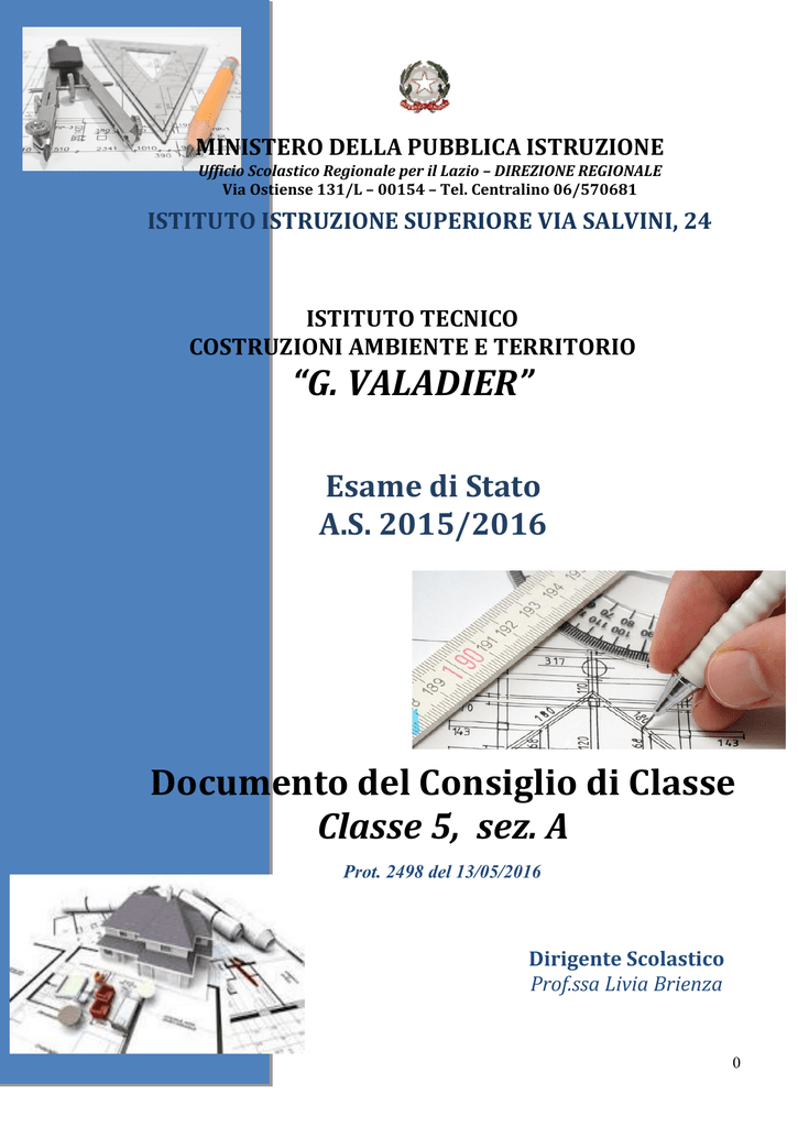 MINISTERO DELLA PUBBLICA ISTRUZIONE Ufficio Scolastico Regionale per il Lazio – DIREZIONE REGIONALE Via Ostiense 131/L – 00154 – Tel. Centralino 06/570681 ISTITUTO ISTRUZIONE SUPERIORE VIA SALVINI, 24 ISTITUTO TECNICO COSTRUZIONI AMBIENTE E TERRITORIO “G. VALADIER” Esame di Stato A.S. 2015/2016 Documento del Consiglio di Classe Classe 5, sez. A Prot. 2498 del 13/05/2016 Dirigente Scolastico Prof.ssa Livia Brienza 0 In base al DPR 323/98 il "DOCUMENTO DEL 15 MAGGIO" esplicita i contenuti, i metodi, i mezzi, gli spazi ed i tempi del percorso formativo, nonché i criteri, gli strumenti di valutazione adottati e gli obiettivi raggiunti. Per la Commissione dell'Esame di Stato, costituisce orientamento e vincolo per la terza prova scritta (Art. 5, c. 3) e per la conduzione del colloquio orale(Art. 4, c.5 – Art. 5, c. 7) INDICE A. FISIONOMIA DELL’ISTITUTO 1. Presentazione dell’Istituto “Via Salvini 24” 2. Il territorio 3. Progetto Ri-orienta 4. Alternanza Scuola lavoro 5. Metodologie didattiche 6. Valutazione 7. Criteri di attribuzione del voto nelle discipline B. ISTITUTO TECNICO CAT “G. VALADIER 1. Presentazione storica dell’Istituto Tecnico CAT “G. Valadier” 2. Contesto socio culturale Pag. 5 Pag. 8 Pag. 11 Pag. 12 Pag. 14 Pag. 15 Pag. 16 Pag. 18 Pag. 19 C. L’OFFERTA FORMATIVA DELL’ISTITUTO TECNICO “G. VALADIER” 1. Finalità generali 2. Finalità specifiche 3. Quadro Orario 4. Sbocchi professionali 5. Nuovo Ordinamento Pag. 21 Pag. 22 Pag. 24 Pag. 25 Pag. 25 D. LA CLASSE 5^ SEZ. A 1. Il Consiglio di Classe 2. Profilo della classe 3. Analisi della situazione iniziale 4. Organizzazione delle attività didattico formative 5. Esame di Stato Pag. 26 Pag. 27 Pag. 28 Pag. 31 Pag. 34 E. F. PROGRAMMAZIONE DEL CONSIGLIO DI CLASSE 1. Criteri di valutazione 2. Elementi che concorrono alla valutazione 3. Criteri di attribuzione voto di condotta 4. Numero verifiche effettuate 5. Obiettivi minimi 6. Modalità di lavoro 7. Tipo di attività 8. Supporti didattici 9. Strumenti di verifica formativa e sommativa Pag. 36 Pag. 36 Pag. 36 Pag. 37 Pag. 38 Pag. 38 Pag. 39 Pag. 39 Pag. 39 PERCORSO FORMATIVO REALIZZATO 1. Obiettivi formativi trasversali del Consiglio di classe 2. Obiettivi didattici trasversali del Consiglio di classe 3. Obiettivi cognitivi trasversali del Consiglio di classe 4. Attività extracurriculari 5. Programma realizzato di Didattica alternativa cogestita 6. Monitoraggio partecipazione Pag. 41 Pag. 42 Pag. 42 Pag. 43 Pag. 44 Pag. 45 Documento del Consiglio della Classe 5A A.S. 2015 - 2016 1 G. ESAMI DI STATO 1. Criteri per l’attribuzione del credito scolastico e formativo 2. Griglia di valutazione della Prima Prova: Italiano 3. Griglia di valutazione della Seconda Prova: Disegno e Progettazione 4. Griglia valutazione Terza Prova 5. Griglia di valutazione Colloquio Pag. 47 Pag. 48 Pag. 49 Pag. 50 Pag. 51 H. PERCORSI FORMATIVI DISCIPLINARI 1. Italiano 2. Inglese 3. Storia 4. Matematica 5. Progettazione, costruzioni, impianti 6. Gestione cantiere e sicurezza sul lavoro 7. Topografia 8. Estimo 9. Educazione Fisica 10.Religione cattolica Pag. 52 Pag. 56 Pag. 58 Pag. 61 Pag. 63 Pag. 65 Pag. 67 Pag. 70 Pag. 72 Pag. 73 I. COMPOSIZIONE DEL CONSIGLIO DI CLASSE Pag. 75 ALLEGATI 1^ simulazione Prima Prova Esame di Stato 2^ simulazione Prima Prova Esame di Stato 3^ simulazione Prima Prova Esame di Stato 1^ simulazione Seconda Prova Esame di Stato 2^ simulazione Seconda Prova Esame di Stato 3^ simulazione Seconda Prova Esame di Stato 1^ simulazione Terza Prova Esame di Stato 2^ simulazione Terza Prova Esame di Stato 3^ simulazione Terza Prova Esame di Stato Pag. 77 Pag. 86 Pag. 99 Pag. 106 Pag. 107 Pag. 108 Pag. 109 Pag. 118 Pag. 127 Documento del Consiglio della Classe 5A A.S. 2015 - 2016 2 Istituto di Istruzione Superiore “Via Salvini 24” RMIS03200G – C.F. 97197430586 Sito internet: www.iisviasalvini.gov.it – e-mail: [email protected] Dirigente Scolastico: Livia Brienza INDIRIZZI DI STUDIO: SEDE DI VIA P.A.MICHELI, 29 - 00197 ROMA - TEL/FAX 06 121124825 LICEO CLASSICO “GOFFREDO MAMELI” Liceo Classico tradizionale Liceo Classico opzione Cambridge International Liceo Classico Internazionale Italo-Tedesco SEDE DI VIA T.SALVINI, 24 - 00197 ROMA – TEL 06 121124805 - FAX 06 8075126 LICEO SCIENTIFICO “MANFREDI AZZARITA” Liceo Scientifico tradizionale Liceo Scientifico opzione Cambridge International Liceo Scientifico Internazionale Italo-Inglese Liceo Scientifico opzione Scienze Applicate ISTITUTO TECNICO “ANTONIO GENOVESI” Informatica e Telecomunicazioni SEDE DI VIA CAPOSILE,1/A - 00195 ROMA - TEL. 06 121122985 - FAX 06 37357766 ISTITUTO TECNICO “GIUSEPPE VALADIER” Costruzioni, Ambiente e Territorio ISTITUTO TECNICO “ANTONIO GENOVESI” Amministrazione, Finanza e Marketing ISTITUTO PROFESSIONALE “FRANCESCO FERRARA” per i Servizi Commerciali Documento del Consiglio della Classe 5A A.S. 2015 - 2016 3 I.I.S. VIA SALVINI, 24 SEZIONE LICEALE LICEO CLASSICO “”MAMELI” LICEO SCIENTIFICO “AZZARITA” LICEO CLASSICO TRADIZIONALE LICEO CLASSICO OPZIONE CAMBRIDGE INTERNATIONAL LICEO CLASSICO INTERNAZIONALE ITALO-TEDESCO LICEO SCIENTIFICO TRADIZIONALE LICEO SCIENTIFICO OPZIONE CAMBRIDGE INTERNATIONAL LICEO SCIENTIFICO INTERNAZIONALE ITALO-INGLESE LICEO SCIENTIFICO OPZIONE SCIENZE APPLICATE SEZIONE TECNICOPROFESSIONALE ISTITUTO TECNICO “GENOVESI” ISTITUTO TECNICO COSTRUZIONI, AMBIENTE E TERRITORIO “VALADIER” ISTITUTO PROFESSIONALE PER I SERVIZI COMMERCIALI “FERRARA” ISTITUTO TECNICO AMMINISTRAZIONE, FINANZA E MARKETING (EX-PANTALEONI) ISTITUTO TECNICO INFORMATICA E TELECOMUNICAZIONI Documento del Consiglio della Classe 5A A.S. 2015 - 2016 4 A. FISIONOMIA DELL’ ISTITUTO Nel presente paragrafo, si avrà cura di illustrare l’attuale fisionomia dell’Istituto, così come sviluppatasi nel corso degli anni dalla costituzione in poi. Per tale motivo, la trattazione è stata suddivisa nelle seguenti tre parti, al cui contenuto si rimanda p