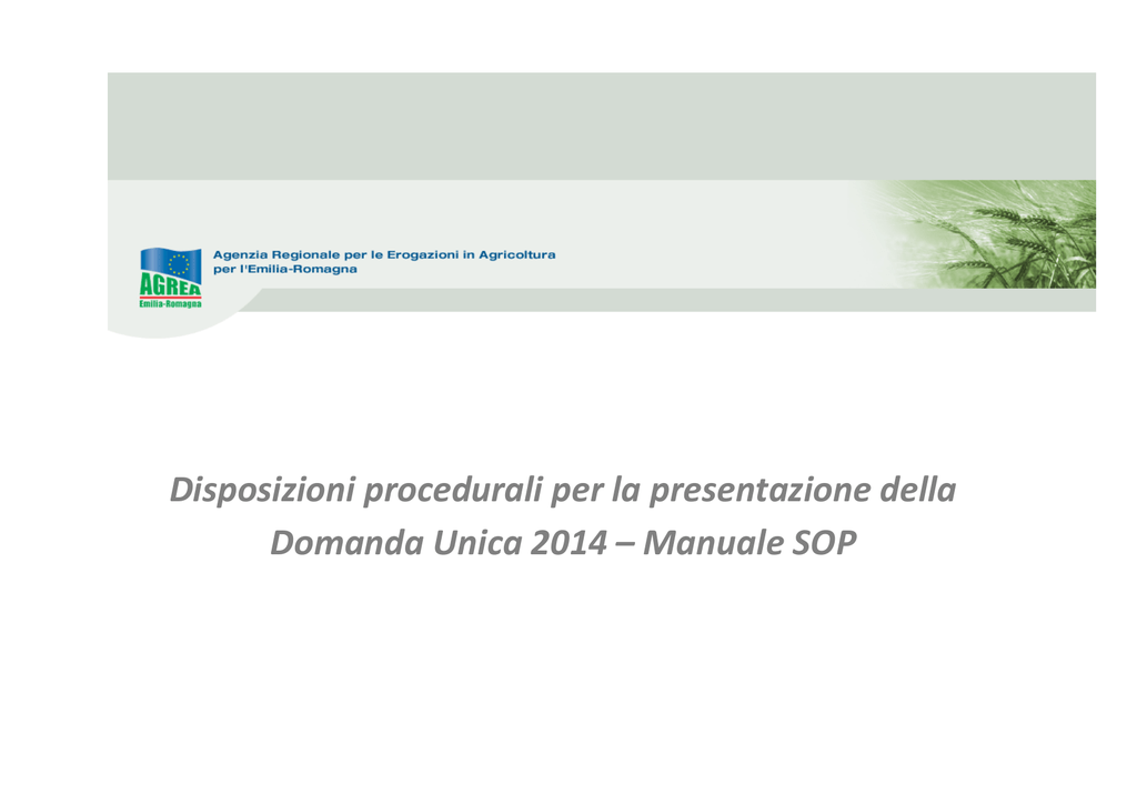 Disposizioni procedurali per la presentazione della Domanda Unica 2014 – Manuale SOP NOVITA’ DU 2014: SCHEDA DI VALIDAZIONE (quadro obbligatorio) Per adempiere agli obblighi previsti dall'art. 25 della Legge n. 35/2012, dal 2014 la Regione Emilia-Romagna ha introdotto l'obbligo della scheda di validazione per gli agricoltori il cui fascicolo è di competenza regionale. Si tratta di un documento che, a fronte di ogni modifica anagrafica e/o territoriale introdotta nell'Anagrafe delle Aziende Agricole, dovrà essere sottoscritto dall'agricoltore e dal CAA: il primo, per certificare di aver fornito dati veritieri e il secondo per certificare che i documenti forniti per l'implementazione delle informazioni a sistema sono conformi alla normativa vigente. La DU 2014 deve essere aggiornata con il recepimento delle informazioni contenute nella scheda di validazione al fine di: 1) avere certezza che la Domanda Unica presenti dati certificati 2) offrire all'agricoltore la possibilità, secondo quanto previsto dalla normativa vigente, di far utilizzare le informazioni contenute nella domanda di aiuto relative all'uso del suolo per l'aggiornamento delle qualità catastali. NOVITA’ DU 2014: PREMIO PATATA Premio Patata da trasformazione L’aiuto transitorio per le patate destinate alla trasformazione è disciplinato dal DM 2365 del 07 marzo 2014. Viene concesso un aiuto comunitario indicativo pari a 1000 euro/ettaro. L’importo definitivo dell’aiuto per ettaro è fissato sulla base della superficie determinata a seguito dei controlli di ammissibilità. L’aiuto è corrisposto ai produttori in possesso dei seguenti requisiti: a) siano associati ad una Organizzazione di Produttori (in seguito O.P.) riconosciuta ai sensi del decreto legislativo 27 maggio 2005 n. 102; b) si impegnino a consegnare al primo trasformatore con il quale è stato concluso il contratto o l’impegno di conferimento, una quantità di prodotto che non può essere inferiore a quanto stabilito nell’allegato 1 del DM 2365 del 07/03/2014; c) abbiano concluso,entro il 30/04/2014, per il tramite di una organizzazione di cui al punto a), un contratto o un impegno di conferimento con un primo trasformatore per la trasformazione delle patate da trasformazione, prodotte sulle superfici oggetto di contratto, ai sensi di quanto stabilito nel contratto quadro nazionale siglato in data 20/03/2014; d) richiedano in DU il premio per le patate da trasformazione utilizzando il codice intervento 180 Patate da trasformazione, evidenziando le superfici abbinate al premio e compilando i dati relativi alla quantità di semente certificata utilizzata (nella misura minima prevista dall’art. 9bis comma 1 lettera b) del sopracitato DM. L’agricoltore dovrà indicare in DU il vincolo associativo dell’OP prescelta. La presentazione dei contratti deve essere eseguita attraverso il SOP per le O.P. che hanno sede legale in Emilia-Romagna. I produttori aderenti ad OP con sede legale fuori dal territorio regionale, dovranno inviare ad Agrea, direttamente o per il tramite della OP, i contratti di coltivazione e i contratti con l’industria di trasformazione entro il termine del 30/04/2014. Nel caso il produttore abbia recentemente aderito all’OP, singolarmente o per il tramite di una Cooperativa, dovrà risultare che la sottoscrizione dell’impegno di coltivazione sia successivo alla delibera di ammissione a socio dell’OP. La disciplina di tali contratti è demandata ad un apposito provvedimento di AGREA. Premio Patate inserite in sistemi di qualità DOP/IGP Possono accedere al pagamento del sostegno i produttori di patate iscritte al sistema dei controlli per il rispetto di un disciplinare di produzione ai sensi del regolamento (UE) n. 1151/2012, comprese le produzioni in protezione nazionale transitoria di cui all’art. 9 del medesimo Regolamento. L’importo massimo unitario del sostegno è fissato a 40 euro/tonnellata di patate fresche ottenute da superficie inserite e risultanti nel piano dei controlli ai sensi del regolamento (UE) n. 1151/2012 per le quali l’organismo di certificazione rilascia apposita certificazione indicante la superficie e la quantità prodotta. L’agricoltore è tenuto ad effettuare la richiesta di ammissione al sostegno nella domanda unica di pagamento (Quadro Premi Regime Unico – art 68 - patata DOP/IGP - codice premi: 182: PATATA DOP di Bologna 183: PATATA DOP Alto Viterbese 184: PATATA IGP Novella di Galatina 189: PATATA IGP della Sila In domanda dovrà essere indicato: • l’Ente competente alla certificazione • la superficie destinata alla produzione di patata DOP/IGP NOVITA’ DU 2014: PREMIO AVVICENDAMENTO “ Dato che la continuazione del sostegno nell’anno civile 2014 è consentita secondo le disposizioni del regolamento 73/2009 che sono in vigore nel 2014, il sostegno deve essere attuato nella sua totalità e gli impegni relativi devono essere rispettati in pieno, anche se una parte dell’impegno deve essere soddisfatta nel corso dell’anno 2015. Pertanto, l’importo del sostegno da concedere agli agricoltori per l’anno civile 2014, che è stato calcolato sulla base dei costi aggiuntivi e del mancato reddito corrispondente ai due requisiti fissati per tale sostegno (rotazione biennale), è dovuto nella misura in cui il secondo impegno riguardante il supporto è rispettato dagli agricoltori nel 2015” (circolare Agea ACIU.2014.285 del 09/05/2014). TRASFERIMENTO TITOLI Ferme restando le disposizioni emanate nel corso degli anni passati da Agea Coordinamento, si precisa che, con l’applicazione della nuova riforma PAC di cui al Reg UE 1307/2013, i titoli cesseranno la loro validità al 31/12/2014. Per tale motivo, le aziende agricole che hanno nel loro portafoglio una disponibilità di titoli maggiore della superficie abbinabile a titolo potranno cedere i loro titoli, in quanto non più utilizzabili dal 31/12/2014. Nel caso il produttore abbia presentato una domanda di trasferimento tito