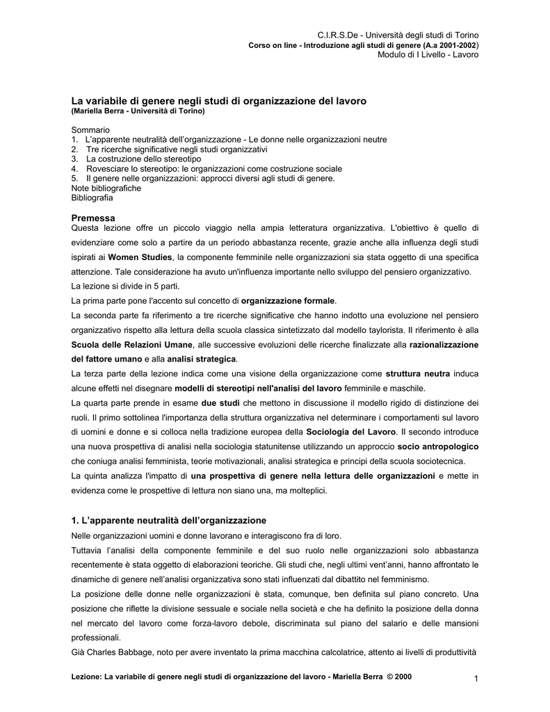 C.I.R.S.De - Università degli studi di Torino Corso on line - Introduzione agli studi di genere (A.a 2001-2002) Modulo di I Livello - Lavoro La variabile di genere negli studi di organizzazione del lavoro (Mariella Berra - Università di Torino) Sommario 1. L’apparente neutralità dell’organizzazione - Le donne nelle organizzazioni neutre 2. Tre ricerche significative negli studi organizzativi 3. La costruzione dello stereotipo 4. Rovesciare lo stereotipo: le organizzazioni come costruzione sociale 5. Il genere nelle organizzazioni: approcci diversi agli studi di genere. Note bibliografiche Bibliografia Premessa Questa lezione offre un piccolo viaggio nella ampia letteratura organizzativa. L'obiettivo è quello di evidenziare come solo a partire da un periodo abbastanza recente, grazie anche alla influenza degli studi ispirati ai Women Studies, la componente femminile nelle organizzazioni sia stata oggetto di una specifica attenzione. Tale considerazione ha avuto un'influenza importante nello sviluppo del pensiero organizzativo. La lezione si divide in 5 parti. La prima parte pone l'accento sul concetto di organizzazione formale. La seconda parte fa riferimento a tre ricerche significative che hanno indotto una evoluzione nel pensiero organizzativo rispetto alla lettura della scuola classica sintetizzato dal modello taylorista. Il riferimento è alla Scuola delle Relazioni Umane, alle successive evoluzioni delle ricerche finalizzate alla razionalizzazione del fattore umano e alla analisi strategica. La terza parte della lezione indica come una visione della organizzazione come struttura neutra induca alcune effetti nel disegnare modelli di stereotipi nell'analisi del lavoro femminile e maschile. La quarta parte prende in esame due studi che mettono in discussione il modello rigido di distinzione dei ruoli. Il primo sottolinea l'importanza della struttura organizzativa nel determinare i comportamenti sul lavoro di uomini e donne e si colloca nella tradizione europea della Sociologia del Lavoro. Il secondo introduce una nuova prospettiva di analisi nella sociologia statunitense utilizzando un approccio socio antropologico che coniuga analisi femminista, teorie motivazionali, analisi strategica e principi della scuola sociotecnica. La quinta analizza l'impatto di una prospettiva di genere nella lettura delle organizzazioni e mette in evidenza come le prospettive di lettura non siano una, ma molteplici. 1. L’apparente neutralità dell’organizzazione Nelle organizzazioni uomini e donne lavorano e interagiscono fra di loro. Tuttavia l’analisi della componente femminile e del suo ruolo nelle organizzazioni solo abbastanza recentemente è stata oggetto di elaborazioni teoriche. Gli studi che, negli ultimi vent’anni, hanno affrontato le dinamiche di genere nell’analisi organizzativa sono stati influenzati dal dibattito nel femminismo. La posizione delle donne nelle organizzazioni è stata, comunque, ben definita sul piano concreto. Una posizione che riflette la divisione sessuale e sociale nella società e che ha definito la posizione della donna nel mercato del lavoro come forza-lavoro debole, discriminata sul piano del salario e delle mansioni professionali. Già Charles Babbage, noto per avere inventato la prima macchina calcolatrice, attento ai livelli di produttività Lezione: La variabile di genere negli studi di organizzazione del lavoro - Mariella Berra © 2000 1 C.I.R.S.De - Università degli studi di Torino Corso on line - Introduzione agli studi di genere (A.a 2001-2002) Modulo di I Livello - Lavoro in una fabbrica di spilli e ai processi di scomposizione del processo lavorativo, alla durata dei tempi di addestramento, elabora nel 1832 (nota 1) una tabella in cui pone a confronto: singole operazioni, tipi di lavoratori e salari. Le operazioni sono rigidamente parcellizzate e i salari sono perfettamente ripartiti in ordine decrescente fra uomini donne, ragazzi e ragazze. Molte indagini empiriche che hanno portato a elaborazioni significative negli studi organizzativi sono state condotte in imprese (fabbriche e uffici) con una buona presenza di lavoratrici femminili, ma è mancata una riflessione specifica sulla composizione maschile e femminile dei membri della organizzazione. Quali sono le ragioni di questo? Esse vanno cercate in una concezione della organizzazione come sistema neutro. Infatti secondo la definizione più comune l'organizzazione è considerata come un costrutto sociale formalmente definito per il raggiungimento di determinati fini (Zan 1994). Una buona organizzazione rappresenta, cioè, un buon sistema di differenziazione e integrazione di ruoli. 2. Tre ricerche significative negli studi organizzativi Racconterò tre casi in cui l’analisi empirica condotte in organizzazioni con una forte presenza femminile ha messo in luce situazioni di disagio espresse da assenteismo, turnover, bassa soddisfazione, conflittualità interna, livelli di inefficienza complessiva che hanno imposto di ripensare un modello di organizzazione classica gerarchica e formale in quanto inadeguato proprio a raggiungere i fini di efficienza organizzativa. Questi tre casi segnano un punto di svolta negli studi organizzativi. A) La prima ricerca si riferisce al caso famoso della Western Electric di Hatworne dove dal 1924 al 1932 si svolgerà un’intensa attività di ricerca da parte di psicologi sociali e sociologi dell’Università di Chicago, guidati da F. Roetlisberger e successivamente da Elton Mayo. I risultati costituiranno il nucleo teorico delle Human Relation. In una situazione di piena occupazione, con benefici salariali e ambientali superiori alla media delle altre imprese c’erano forti indicatori di disagio rappresentati dall’alto tasso di turnover e di assenteismo, dalla bassa qualità di numerosi pezzi prodotti. L’analisi fu condotta su operaie attraverso diverse metodologie: l’esperimento, quello molto noto della variazione della illuminazione dell’ambiente s