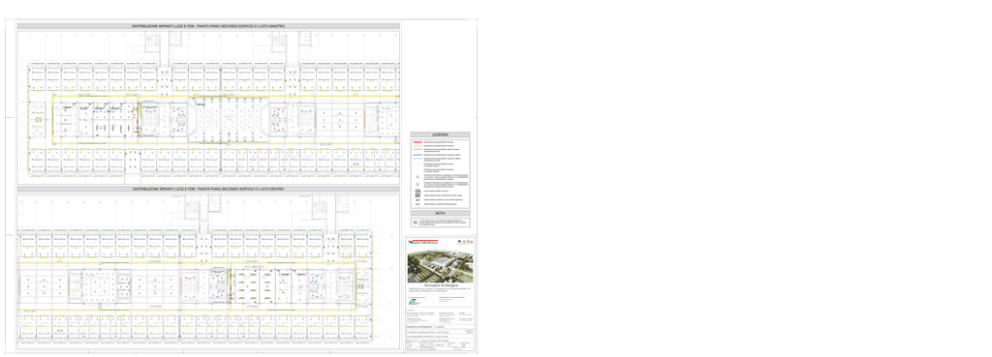 DISTRIBUZIONE IMPIANTI LUCE E FEM - PIANTA PIANO SECONDO EDIFICIO C1 LATO SINISTRO 1 2 3 4 5 6 7 8 9 10 11 12 CANALE METALLICO FORATO SENZA COPERCHIO - Dim. Int. 300x75mm 47W LED - 4640lm Q.E INFERMERIA-C QE-C1TI-AM1 15 16 17 18 19 20 21 22 23 24 Q.E AMBULATORIO-C QE-C1TI-CU1 CANALE METALLICO FORATO SENZA COPERCHIO - Dim. Int. 300x75mm Q.E BIBLIOTECA-C QE-C1L2-BIB QE-C1L2-Z1 47W LED - 4640lm 47W LED - 4640lm 47W LED - 4640lm 47W LED - 4640lm 47W LED - 4640lm 47W LED - 4640lm Q.E CUCINA-C QE-C1TI-CU1 14 CANALE METALLICO FORATO SENZA COPERCHIO - Dim. Int. 300x75mm CANALE METALLICO FORATO SENZA COPERCHIO - Dim. Int. 300x75mm CANALE METALLICO FORATO SENZA COPERCHIO - Dim. Int. 300x75mm Q.E RIUNIONI-C QE-C1TI-RI1 13 47W LED - 4640lm LEGENDA kg/mq CANALE METALLICO FORATO SENZA COPERCHIO - Dim. Int. 300x75mm Distribuzione principale Media Tensione CANALE METALLICO FORATO SENZA COPERCHIO - Dim. Int. 300x75mm CANALE METALLICO FORATO SENZA COPERCHIO - Dim. Int. 300x75mm Distribuzione principale Bassa Tensione Distribuzione principale Media / Bassa Tensione (realizziazione futura) Distribuzione principale Bassa Tensione in Blindo Distribuzione principale Bassa Tensione in Blindo (realizziazione futura) Distribuzione principale Media Tensione in cavidotto interrato Distribuzione principale Bassa Tensione in cavidotto interrato Pozzetto di derivazione e/o ispezione in cls vibrocompresso con chiusino in ghisa lamellare D400 dim. Int. 60x60xP60cm Distribuzione principale Bassa Tensione Pozzetto di derivazione e/o ispezione in cls vibrocompresso con chiusino in ghisa lamellare D400 dim. Int. 60x60xP60cm Distribuzione principale Media Tensione DISTRIBUZIONE IMPIANTI LUCE E FEM - PIANTA PIANO SECONDO EDIFICIO C1 LATO DESTRO Quadro elettrico Media Tensione Quadro elettrico Bassa Tensione tipo Power Center Quadro elettrico metallico di zona (simbolo generico) 21 22 23 24 25 26 27 28 29 30 31 32 33 34 35 36 37 38 39 40 41 Quadro elettrico a parete (simbolo generico) NOTA In colore grigio chiaro sono indicate le apparecchiature non previste nella fornitura attuale ma predisposte a livello di spazio per ampliamenti futuri A CANALE METALLICO FORATO SENZA COPERCHIO - Dim. Int. 300x75mm CANALE METALLICO FORATO SENZA COPERCHIO - Dim. Int. 300x75mm B 47W LED - 4640lm 47W LED - 4640lm 47W LED - 4640lm 47W LED - 4640lm 47W LED - 4640lm 47W LED - 4640lm 47W LED - 4640lm 47W LED - 4640lm 47W LED - 4640lm 47W LED - 4640lm 47W LED - 4640lm 47W LED - 4640lm Q.E RIUNIONI-C QE-C1TI-RI1 47W LED - 4640lm Q.E CUCINA-C QE-C1TI-CU1 CANALE METALLICO FORATO SENZA COPERCHIO - Dim. Int. 300x75mm CANALE METALLICO FORATO SENZA COPERCHIO - Dim. Int. 300x75mm QE-C1L2-Z2 47W LED - 4640lm 20 47W LED - 4640lm 19 C CANALE METALLICO FORATO SENZA COPERCHIO - Dim. Int. 300x75mm Progettisti: CANALE METALLICO FORATO SENZA COPERCHIO - Dim. Int. 300x75mm Resp. del progetto - Prog. arch. e coordinam. Von Gerkan, Marg und Partner - gmp GmbH Arch. Volkwin Marg Progettazione impianti Studio TI Soc. Cooperativa Ing. Ennio Menotti Geologo Dott. Aldo Antoniazzi Progettazione strutture Werner Sobek Stuttgart GmbH e Co. Ing. Michael Duder Progettazione del verde LAND Milano srl Arch. Andreas Kipar Coordinam. operativo Arch. Clemens Kusch ELABORATI IMPIANTISTICI - ELETTRICO D 700/05 DISTRIBUZIONE IMPIANTI LUCE E FEM EDIFICIO C1 - PIANTA PIANO SECONDO 1:100 2653 10.04.2015 E-4-C1-FEM-P2 E-4-C1-FEM-P2 GU EM C1_P2 -