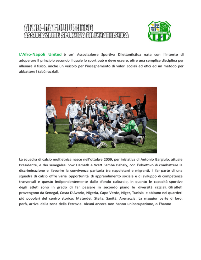 L’Afro-Napoli United è un’ Associazion e Sportva Diletantstica nata con l’intento di adoperare il principio secondo il quale lo sport può e deve essere, oltre una semplice disciplina per allenare il fisico, anche un veicolo per l'insegnamento di valori sociali ed etci ed un metodo per abbatere i tabù razziali. La squadra di calcio multetnica nasce nell’otobre 2009, per iniziativa di Antonio Gargiulo, atuale Presidente, e dei senegalesi Sow Hamath e Wat Samba Babaly, con l’obietvo di combatere la discriminazione e favorire la convivenza paritaria tra napoletani e migrant. Il far parte di una squadra di calcio ofre varie opportunità di apprendimento sociale e di sviluppo di competenze trasversali e questo indipendentemente dallo sfondo culturale, in quanto le capacità sportve degli atlet sono in grado di far passare in secondo piano le diversità razziali. Gli atlet provengono da Senegal, Costa D'Avorio, Nigeria, Capo Verde, Niger, Tunisia e abitano nei quarteri più popolari del centro storico: Materdei, Stella, Sanità, Arenaccia. La maggior parte di loro, però, arriva dalla zona della Ferrovia. Alcuni ancora non hanno un'occupazione, o l'hanno persa da poche setmane e c'è chi ancora fatca a parlare la nostra lingua. Altri invece sono perfetamente integrat nel tessuto sociale. Ad oggi l’associazione ha realizzato due squadre di calcio, che partecipano a tornei amatoriali, citadini e provinciali, raggruppando circa 40 atlet. Si sono aggregat alla squadra anche ragazzi provenient da altre nazioni europee e da altri contnent come il Sudamerica. I risultati raggiunt fnora possono ritenersi soddisfacent sia dal punto di vista della socializzazione che dal punto di vista sportvo. Il gruppo di atlet che si è formato è, infat, molto afatato ed è riuscito a vincere: La Coppa Partenope e la Super Coppa AICS (Associazione Italiana Cultura e Sport) nella stagione 2009/2010. E’ risultata poi la squadra imbatibile nella stagione 2011/2012, vincendo tuto ciò che c’era da vincere: La coppa Partenope AICS 2011/12; Il torneo Napoli d’Autore edizioni estva e invernale 2011/12; Il campionato Regionale AICS Campania 2011/12; La Super Coppa AICS 2011/12; Nella stagione 2013/2014: Si è classifcata Seconda nel campionato di Terza Categoria Figc Napoli ed è stata promossa in Seconda Categoria. Ha vinto il campionato Regionale AICS Campania 2013/2014. Il campionato AICS 2011/2012 si è concluso per l’Afro-Napoli United con 22 partite di cui 21 vitorie e 104 gol segnat. Secondi classifcat al campionato Regionale AICS Campania e Terzi classifcat alle Finali Nazionali di calcio a 11 AICS 2012/2013. Con 108 gol segnat nella stagione 2012/2013 hanno batuto il record della stagione precedente. Inoltre la squadra ha ricevuto nell’estate del 2012 il premio “Goccia d’Oro” per i valori di solidarietà e integrazion e che difonde atraverso lo sport a Rapolano Terme in provincia di Siena. L’Afro-Napoli United è divenuta, oggi, una realtà che realizza concrete opportunità di integrazione sociale dei migrant, riconosciuta e ben radicata nel territorio della provincia di Napoli. L’associazione ha otenuto il Patrocinio del Comune di Napoli e dell’AICS Nazionale, proprio per l’interessante progeto che realizza. Inoltre, è iscrita e riconosciuta dal Coni in quanto afliata AICS. I n occasione della Setimana Nazionale Contro il Razzismo ha partecipato all’iniziatva Soccer light ed ha otenuto anche un Atestato di Riconoscimento da parte della Presidenza del Consiglio dei Ministri – Dipartmento per le Pari Opportunità e UNAR. Quest’anno, per la prima volta, in seguito alla modifca di alcune norme che limitavano l’accesso dei migrant ai campionat federali diletantstci, la squadra multetnica si è iscrita al Campionato di Terza Categoria della FIGC ed ha otenuto buoni risultat sin dalle prima partte. Le 22 partte giocate si sono concluse con 15 vitorie, 5 pareggi e 2 sconfte. 91 sono stat i goal fat e 28 subit. Arrivata seconda a meno 3 punt dalla Kema Atletco Flegreo, prima classifcata, è stata promossa in seconda categoria dopo aver eccellentemente superato le fasi play of. L’Afro-Napoli United è sempre in primo piano ed è un punto di riferimento per qualsiasi evento o iniziatva in cui si promuove la lota al razzismo e collabora costantemente con ent ed associazioni del terzo settore che lavorano nel campo dell’integrazione sociale e della lota ad ogni forma di discriminazione. L’Afro-Napol i United vanta rapport consolidat con GESCO, Consorzio d i Cooperatve Sociali, DEDALUS, Cooperatva Sociale, l’Associazione Senegalesi di Napoli, Laboratorio Occupato Insurgencia, Caritas e CGIL. Afro-Napoli oltre il calcio Uno degli obietvi che l’Afro-Napoli United si è posta fn dal principio è stato favorire la socializzazione e lo scambio culturale, atraverso una serie di iniziatve che coinvolgono i ragazzi della squadra anche oltre il campo di calcio. Dall’organizzazione di un cineforum alle serate a tema dedicate alle varie culture, dalla scoperta delle bellezze della città di Napoli e della regione Campania fino ad una serie di eventi fnalizzat al supporto dell’associazione stessa. Media ed Event Anno dopo anno è cresciuto l’interesse mediatico nei confront della squadra che è stata oggetto di numerosi servizi video-giornalistci ed ospitate televisive, oltre ad essere stata invitata ad event di rilevanza nazionale. Sono da evidenziare: 2014 18 Maggio. All’interno del Tg Sport delle 20:30, su Rai 1, va in onda la cronaca della partta di Terza Categoria Napoli: Antares Afragola Vs Afro-Napoli United. 6 Maggio. La storia dell’apolide Rafaele Shassah e dell’Afro-Napoli viene raccontata ai microfoni del Tg1, in un servizio di Carlota Mannu su Rai 1. 27 Aprile. Il corto “Afronapoli United” prodoto da Arcopinto, in collaborazione con “Figli del bronx”, “Sky” e “Catleya” va in onda per la prima volta su Sky Cinema Cult. 27 Marzo. L’Afro-Napoli