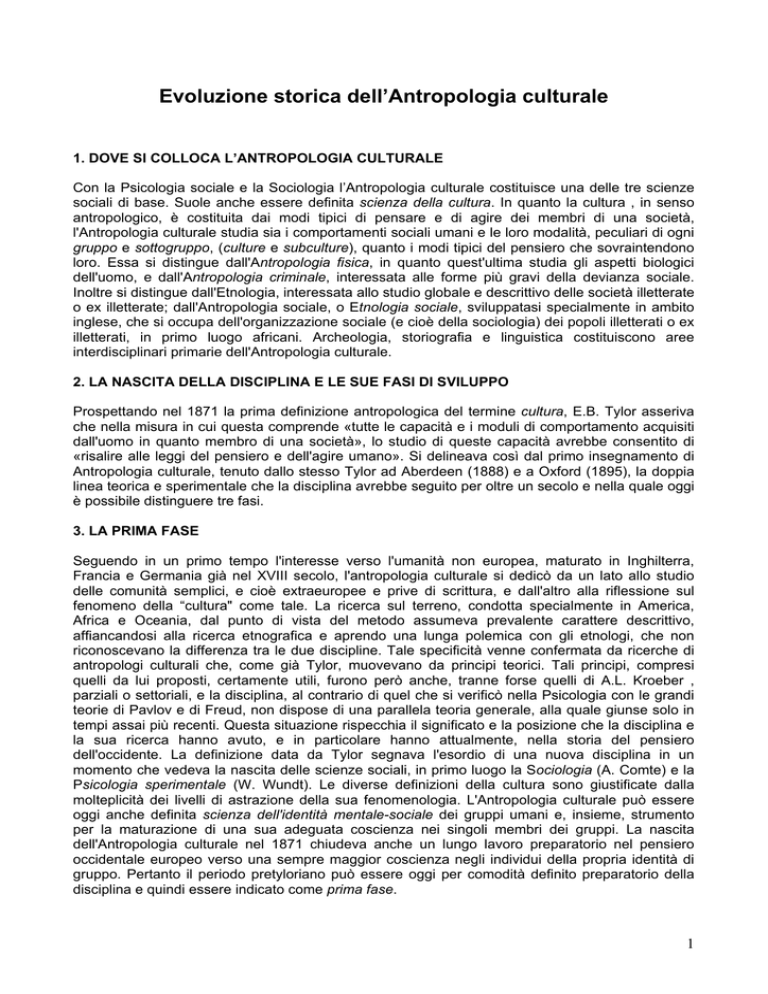 Evoluzione storica dell’Antropologia culturale 1. DOVE SI COLLOCA L’ANTROPOLOGIA CULTURALE Con la Psicologia sociale e la Sociologia l’Antropologia culturale costituisce una delle tre scienze sociali di base. Suole anche essere definita scienza della cultura. In quanto la cultura , in senso antropologico, è costituita dai modi tipici di pensare e di agire dei membri di una società, l'Antropologia culturale studia sia i comportamenti sociali umani e le loro modalità, peculiari di ogni gruppo e sottogruppo, (culture e subculture), quanto i modi tipici del pensiero che sovraintendono loro. Essa si distingue dall'Antropologia fisica, in quanto quest'ultima studia gli aspetti biologici dell'uomo, e dall'Antropologia criminale, interessata alle forme più gravi della devianza sociale. Inoltre si distingue dall'Etnologia, interessata allo studio globale e descrittivo delle società illetterate o ex illetterate; dall'Antropologia sociale, o Etnologia sociale, sviluppatasi specialmente in ambito inglese, che si occupa dell'organizzazione sociale (e cioè della sociologia) dei popoli illetterati o ex illetterati, in primo luogo africani. Archeologia, storiografia e linguistica costituiscono aree interdisciplinari primarie dell'Antropologia culturale. 2. LA NASCITA DELLA DISCIPLINA E LE SUE FASI DI SVILUPPO Prospettando nel 1871 la prima definizione antropologica del termine cultura, E.B. Tylor asseriva che nella misura in cui questa comprende «tutte le capacità e i moduli di comportamento acquisiti dall'uomo in quanto membro di una società», lo studio di queste capacità avrebbe consentito di «risalire alle leggi del pensiero e dell'agire umano». Si delineava così dal primo insegnamento di Antropologia culturale, tenuto dallo stesso Tylor ad Aberdeen (1888) e a Oxford (1895), la doppia linea teorica e sperimentale che la disciplina avrebbe seguito per oltre un secolo e nella quale oggi è possibile distinguere tre fasi. 3. LA PRIMA FASE Seguendo in un primo tempo l'interesse verso l'umanità non europea, maturato in Inghilterra, Francia e Germania già nel XVIII secolo, l'antropologia culturale si dedicò da un lato allo studio delle comunità semplici, e cioè extraeuropee e prive di scrittura, e dall'altro alla riflessione sul fenomeno della “cultura" come tale. La ricerca sul terreno, condotta specialmente in America, Africa e Oceania, dal punto di vista del metodo assumeva prevalente carattere descrittivo, affiancandosi alla ricerca etnografica e aprendo una lunga polemica con gli etnologi, che non riconoscevano la differenza tra le due discipline. Tale specificità venne confermata da ricerche di antropologi culturali che, come già Tylor, muovevano da principi teorici. Tali principi, compresi quelli da lui proposti, certamente utili, furono però anche, tranne forse quelli di A.L. Kroeber , parziali o settoriali, e la disciplina, al contrario di quel che si verificò nella Psicologia con le grandi teorie di Pavlov e di Freud, non dispose di una parallela teoria generale, alla quale giunse solo in tempi assai più recenti. Questa situazione rispecchia il significato e la posizione che la disciplina e la sua ricerca hanno avuto, e in particolare hanno attualmente, nella storia del pensiero dell'occidente. La definizione data da Tylor segnava l'esordio di una nuova disciplina in un momento che vedeva la nascita delle scienze sociali, in primo luogo la Sociologia (A. Comte) e la Psicologia sperimentale (W. Wundt). Le diverse definizioni della cultura sono giustificate dalla molteplicità dei livelli di astrazione della sua fenomenologia. L'Antropologia culturale può essere oggi anche definita scienza dell'identità mentale-sociale dei gruppi umani e, insieme, strumento per la maturazione di una sua adeguata coscienza nei singoli membri dei gruppi. La nascita dell'Antropologia culturale nel 1871 chiudeva anche un lungo lavoro preparatorio nel pensiero occidentale europeo verso una sempre maggior coscienza negli individui della propria identità di gruppo. Pertanto il periodo pretyloriano può essere oggi per comodità definito preparatorio della disciplina e quindi essere indicato come prima fase. 1 4. LA SECONDA FASE Il periodo da Tylor agli anni Quaranta del Novecento si può definire seconda fase; mentre una terza fase può individuarsi nel periodo successivo alla seconda guerra mondiale, con qualche anticipazione alla fine degli anni Trenta, dovuta all'interesse sempre più elaborato per le culture delle società occidentali (Antropologia delle società complesse). Questa prospettiva, oltre a chiarire il senso della scienza della cultura nel pensiero occidentale moderno, ne inquadra la futura funzione conoscitiva ed euristica, colmando il vuoto ancora largamente presente nella ricognizione storica sulle culture europee, come su qualunque cultura attuale o sullo stesso vissuto quotidiano degli individui e dei gruppi. Le matrici dell'Antropologia culturale nel periodo pretyloriano possono definirsi dirette, in quanto espressione di riflessioni in vario modo preantropologiche, alle quali si rifà in genere la letteratura scientifica sull'uomo, e indirette, in quanto non costituiscono un itinerario verso l'antropologia come scienza ma l'anticipano, esprimendo appunto quel maturarsi nell'attuale società occidentale dell'esigenza di autoidentificazione, individuale e di gruppo, definita identità culturale. Le fonti indirette o “implicite" partiranno in Italia da Leon Battista Alberti, come da Machiavelli e da Guicciardini, e in Europa da Montaigne e da Montesquieu, e potranno essere riconosciute anche in classiche sintesi umanistico-filosofiche quali la Storia della civiltà greca di J. Burckhardt (1898-1902, ed. it. 1955), La crisi della coscienza europea di P. Hazard (1935, ed. it. 1946) o Le origini dello storicismo di F. Meinecke (1936, ed. it. 1954). Come fu rilevato da A. Kroeber, che aveva riflettuto sul carattere collettivo della maturazione della cultura, sin dalla s