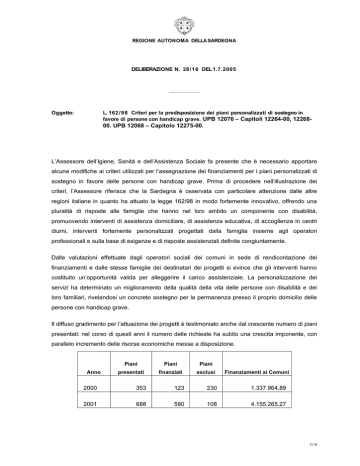 REGIONE AUTONOMA DELLA SARDEGNA DELIBERAZIONE N. 28 /1 6 DEL 1.7.2005 ————— Oggetto: L. 162 / 98 Criteri per la predisposizione dei piani personalizzati di sostegno in favore di persone con handicap grave. UPB 12076 – Capitoli 12264-00, 12268- 00. UPB 12068 – Capitolo 12275-00. L’Assessore dell’Igiene, Sanità e dell’Assistenza Sociale fa presente che è necessario apportare alcune modifiche ai criteri utilizzati per l’assegnazione dei finanziamenti per i piani personalizzati di sostegno in favore delle persone con handicap grave. Prima di procedere nell’illustrazione dei criteri, l’Assessore riferisce che la Sardegna è osservata con particolare attenzione dalle altre regioni italiane in quanto ha attuato la legge 162/98 in modo fortemente innovativo, offrendo una pluralità di risposte alle famiglie che hanno nel loro ambito un componente con disabilità, promuovendo interventi di assistenza domiciliare, di assistenza educativa, di accoglienza in centri diurni, interventi fortemente personalizzati progettati dalla famiglia insieme agli operatori professionali e sulla base di esigenze e di risposte assistenziali definite congiuntamente. Dalle valutazioni effettuate dagli operatori sociali dei comuni in sede di rendicontazione dei finanziamenti e dalle stesse famiglie dei destinatari dei progetti si evince che gli interventi hanno costituito un’opportunità valida per alleggerire il carico assistenziale. La personalizzazione dei servizi ha determinato un miglioramento della qualità della vita delle persone con disabilità e dei loro familiari, rivelandosi un concreto sostegno per la permanenza presso il proprio domicilio delle persone con handicap grave. Il diffuso gradimento per l’attuazione dei progetti è testimoniato anche dal crescente numero di piani presentati: nel corso di questi anni il numero delle richieste ha subito una crescita imponente, con parallelo incremento delle risorse economiche messe a disposizione. Anno Piani Piani Piani presentati finanziati esclusi Finanziamenti ai Comuni 2000 353 123 230 1.337.964,89 2001 688 580 108 4.155.265,27 1/ 4 REGIONE AUTONOMA DELLA SARDEGNA DELIBERAZIONE N. 28/16 DEL 1.7.2005 Anno Piani Piani Piani presentati finanziati esclusi Finanziamenti ai Comuni 2002 1.648 1.524 124 10.516.445,00 2003 2.618 2.344 274 13.463.000,00 2004 5.245 3.461 1.784 21.998.500,00 È da precisare che i piani personalizzati ex lege 162, per loro natura, possono rispondere efficacemente e in modo appropriato solo a determinate tipologie di domanda. La loro crescita se da una parte ne esprime compiutamente l’efficacia, allo stesso tempo richiama l’esigenza di procedere ad una profonda riqualificazione della rete dei servizi per le persone con disabilità e di assicurare una maggiore integrazione fra gli interventi promossi dalla legge 162/98 ed il complesso degli interventi sociali e sanitari. Le persone con disabilità possono oggi riferirsi ad una rete di interventi sociali sostanzialmente insoddisfacente e un sistema di interventi e servizi sanitari con una componente terapeutica-riabilitativa spesso molto ridotta e orientata a prestazioni di contenimento e di custodia. La prospettiva di riqualificazione della rete dei servizi che s’intende perseguire è puntualmente definita nella proposta di Piano regionale dei servizi sociali e sanitari, approvato con le deliberazioni regionali n. 4/21 del 10/2/05 e n. 24/25 del 1/6/2005. L’Assessore illustra, quindi, i criteri e le modalità che intende introdurre per la predisposizione dei piani personalizzati relativi alla programmazione 2005, contenuti negli allegati alla presente deliberazione e parte integrante di essa. Le modifiche sono state definite sulla base dell’esperienza maturata e anche con la collaborazione della Commissione Consultiva costituita con il decreto assessoriale n. 58 del 15.11.2004 e composta da rappresentanti dei comuni, degli operatori sociali e del volontariato. Inoltre, nel corso di una riunione a livello regionale, i criteri sono stati oggetto di confronto con gli operatori comunali interessati alla programmazione e gestione dei piani stessi. L’impianto generale è invariato rispetto agli anni precedenti, mentre è stata rivista l’incidenza dei diversi elementi che concorrono alla definizione del punteggio da attribuire a ciascun piano personalizzato. L’Assessore sottolinea che la legge 162/98 è finalizzata a garantire alle persone con gravi limitazioni dell’autonomia la permanenza nella propria famiglia e non è rivolta specificamente ad 2/ 4 REGIONE AUTONOMA DELLA SARDEGNA DELIBERAZIONE N. 28/16 DEL 1.7.2005 affrontare le problematiche degli anziani non autosufficienti. Per questa tipologia di utenza il presente provvedimento prevede, comunque, degli interventi integrativi dell’attuale rete di servizi sociali e sanitari. L’Assessore fa presente che, in considerazione del crescente numero di piani da redigere, i Comuni hanno più volte rappresentato l’esigenza di supportare con adeguate azioni di accompagnamento la predisposizione dei piani personalizzati. Valutata l’esigenza sottolineata dai Comuni, l’Assessore ritiene di poter mettere a disposizione di ogni ambito territoriale di scala almeno distrettuale risorse aggiuntive, da destinare ad attività di affiancamento e assistenza tecnica degli uffici comunali competenti, anche a sostegno di una migliore qualificazione della programmazione locale. L’Assessore sottolinea che questa iniziativa di affiancamento e assistenza tecnica agli uffici, di natura eccezionale, è possibile grazie ai fondi di bilancio provenienti da assegnazioni statali accertati e inscritti in bilancio recentemente ma riferiti all’anno 2001 per iniziative sperimentali d’informazione per le famiglie; non comporta quindi ulteriore aggravio a carico delle risorse regionali e va considerato del tutto straordinario. La Giunta regionale, condividendo la proposta dell’Assessore della Sanità e constatato che