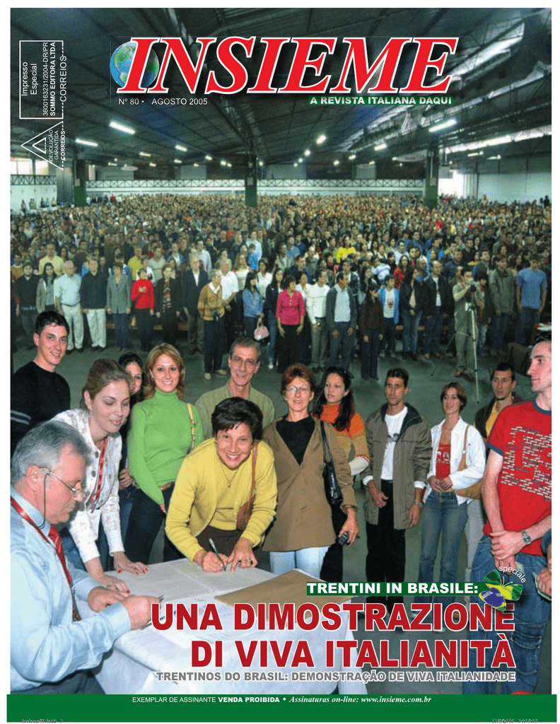 CORREIOS MR Nº 80 • AGOSTO 2005 A REVISTA ITALIANA DAQUI CORREIOS 3600163231/2004-DR/PR SOMMO EDITORA LTDA DEVOLUÇÃO GARANTIDA Impresso Especial INSIEME specia . le TRENTINI IN BRASILE: UNA DIMOSTRAZIONE DI VIVA ITALIANITÀ TRENTINOS DO BRASIL: DEMONSTRAÇÃO DE VIVA ITALIANIDADE EXEMPLAR DE ASSINANTE VENDA PROIBIDA insieme80.indd 1 • Assinaturas on-line: www.insieme.com.br 11/8/2005 14:08:10 PUBBLICITÀ INFORMAÇÃO INSTITUCIONAL Storia & Cultura I Greci: GLI DEI DELL’ OLIMPO (continuazione)* F ra gli dei olimpici ritenuti come i più importanti, c’erano anche. APOLLO – Una delle maggiori divinità dell’Olimpo greco, figlio di Zeus e Latona, fratello di Artemide, nacque nell’isola di Delo. Era il dio della salute, della musica, della poesia, dell’ordine e il difensore delle leggi. Trasmetteva agli uomini la volontà di Zeus, ma li puniva in casi di inadempienza con la sua ira terribile. Rappresentava la forza giovanile. La filosofia, la matematica e la scienza erano sotto la sua protezione. Legato alla pastorizia e ai raccolti, li proteggeva tenendo lontani i topi e i lupi. A lui erano dedicate le Targelie, feste agrarie. Si comunica- CECLISC EM AÇÃO : va con gli uomini attraverso la sacerdotessa del tempio di Delfi. I suoi attributi erano l’arco e la cetra. A Roma gli fu eretto il primo tempio nel 432 a.C. ARTEMIDE – Sorella di Apollo, era la dea della caccia e della natura selvaggia, armata di arco e frecce, amava aggirarsi fra boschi, fiumi e laghi. Divinità lunare, veni- CECLISC Centro de Cultura e Língua Italiana Sul Catarinense va rappresentata con arco e frecce e circondata da animali selvatici e seguita dalle ninfe. Vergine, era protettrice dei giovani e soprattutto delle giovinette, tutelava le spose e il parto. Fu identificata con la Diana dei romani. * ricerca / lavoro di E. Lolli. (cont. nell’ edizione prossima) PROTESTO Há alguns anos são realizados em Curitiba/PR semanas de Formação para todos os professores de língua italiana que atuam (trabalham) nas quatro entidades escolásticas subordinadas à Circunscrição Consular PR/SC, ministrando Cursos de Italiano. Estes cursos de Formação são subvencionados pelo Governo Italiano que repassa a referida verba ao Consulado (Italiano) que por sua vez dá a UM dos quatro Entes, o delegado pelos outros três, através de documentação, o poder de administrá-la devidamente. Porém o Presidente executivo da referida Entidade “delegada”, outorgou-se o poder de excluir os professores do CECLISC de tal benefício, prejudicando o aperfeiçoamento e a Formação dos mesmos Somos conhecedores e possuímos documentação legal para isto, que existem dois tipos de projetos que cada uma das quatro Entidades apresenta, anualmente, ao Ministério Italiano, através do Consulado Geral da Itália: • 1°) - Projeto de Formação Continuada para todos os professores dos quatro Entes, juntos ; • 2°) - Projeto Interno de Formação Continuada (reforço) que cada Ente faz com os seus respectivos docentes. O mérito da questão, no momento, se atém aos Cursos de Formação do 1° projeto. Nós, os professores do CECLISC, embora tivéssemos feito e enviado as inscrições para o Curso de Formação a realizar-se de 19 a 23 de julho p.p., em Curitiba, fomos surpreendidos com a já mencionada exclusão, boicotando nossa participação ao referido curso, com justificativas não condizentes com a verdadeira realidade. É para esta retaliação feita pelo Presidente Executivo do C.C.I. – PR/SC que vai o nosso veemente protesto de repúdio. Repudiamos, também, o tratamento grosseiro e mal-educado que o referido “Cavalheiro” dispensou à nossa Diretora, servindo-se de um microfone, quando a mesma adentrava no local onde estava um grupo de professores, participantes, do já referido Curso. Eficiência e qualidade Nossos endereços Para você que quer buscar na bela Itália uma especialização para sua profissão, ou quer procurar oportunidades de trabalho, ou ainda, quer estudar ou se diplomar em uma Universidade Italiana, lembre-se que é muito importante um curso básico de italiano, antes de partir. Se desejar ter um curso eficiente e de qualidade, procure o CECLISC, que está com matrículas abertas para novos cursos. Em Criciúma, Fone: (048)-433-9174; ou em sua cidade, com a Diretoria da Associação ou Círculos Italianos. CECLISC - CENTRO DE CULTURA E LÍNGUA ITALIANA SUL CATARINENSE a) Corpo Docente do Ceclisc Rua Cons. João Zanette, 99 Caixa Postal 3508 CEP 88801-060 - CRICIÚMA-SC-Brasil Tel./Fax.: (048) 433 9174 E-mail: [email protected] Agosto 2005 - INSIEME - 2 insieme80.indd 2 11/8/2005 14:09:20 DO EDITOR DALL’EDITORE www .insiem e.com .br I Insieme é uma publicação mensal bilingüe, de difusão e promoção da cultura italiana e ítalo-brasileira, sucessora de Il Trevisano. O registro que atende às exigências da Lei de Imprensa está arquivado no 2º Ofício de Reg. de Títulos e Documentos de Curitiba, microfilme nº 721.565, desde 22.03.1995. PROPRIEDADE SOMMO EDITORA LTDA CNPJ 02.533.359/0001-50 Rua Professor Nivaldo Braga, 573 CEP 82900-090 - Curitiba - PR Fone/Fax (041) 3366-1469 www.insieme.com.br E-mail: [email protected] ENDEREÇO PARA CORRESPONDÊNCIA Caixa Postal: 4717 CEP: 82800-980 - CURITIBA - PR EDITOR E DIRETOR RESPONSÁVEL JORNALISTA DESIDERIO PERON Reg. 552/04/76v-PR e-mail: [email protected] TRADUÇÃO P/ ITALIANO E REVISÃO CLAUDIO PIACENTINI - Roma VERSÃO P/ PORTUGUÊS: DePeron DEPARTAMENTO COMERCIAL LELIO ALMADA VICENTE e-mail: [email protected] Fone/Fax (41) 3257-7776 Cel. 8402-4646 rua Holanda, 719 - loja 9, Holanda Center (Boa Vista) 82540-040 - Curitiba - PR CIRCULAÇÃO Exclusivamente através de assinaturas Atendimento ao assinante: de segunda a sexta-feira, das 13h30min às 17hs, com Natali Marques Organo Ufficiale dell’Associazione Stampa Italiana in Brasile - ASIB R Silva 185 - Bela Vista CEP 01331-010 - São Paulo - SP COMPOSIÇÃO, EDITORAÇÃO E 