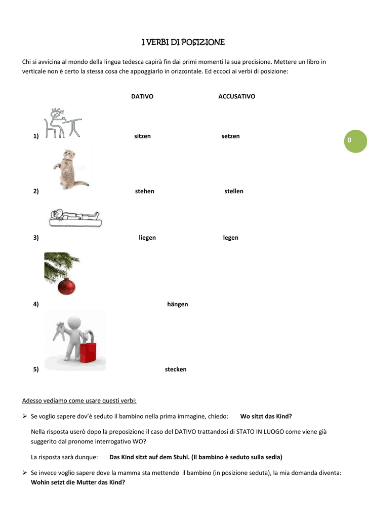 I VERBI DI POSIZIONE Chi si avvicina al mondo della lingua tedesca capirà fin dai primi momenti la sua precisione. Mettere un libro in verticale non è certo la stessa cosa che appoggiarlo in orizzontale. Ed eccoci ai verbi di posizione: DATIVO 1) sitzen 2) stehen 3) liegen ACCUSATIVO setzen 0 stellen legen 4) hängen 5) stecken Adesso vediamo come usare questi verbi: Se voglio sapere dov’è seduto il bambino nella prima immagine, chiedo: Wo sitzt das Kind? Nella risposta userò dopo la preposizione il caso del DATIVO trattandosi di STATO IN LUOGO come viene già suggerito dal pronome interrogativo WO? La risposta sarà dunque: Das Kind sitzt auf dem Stuhl. (Il bambino è seduto sulla sedia) Se invece voglio sapere dove la mamma sta mettendo il bambino (in posizione seduta), la mia domanda diventa: Wohin setzt die Mutter das Kind? Già l’uso del pronome interrogativo WOHIN? suggerisce che si tratta di MOTO A LUOGO; la preposizione sarà di conseguenza seguita dal caso ACCUSATIVO. La risposta sarà: Die Mutter setzt das Kind auf den Stuhl. (La mamma „siede“ il bambinio sulla sedia) Guardiamo adesso l’immagine numero 3 e chiediamo: La risposta è: Wo liegt der Mann? Der Mann liegt in dem Bett. Qui arriviamo ad un altro dettaglio. Alcune preposizioni possono essere contratte, cioè diventano preposizioni articolate. Nel nostro esempio la frase diventa così: Der Mann liegt im Bett. 1 A differenza dell’italiano non è obbligatorio usare la preposizione articolata anche se viene quasi naturale. Di fianco all’immagine numero 4 c’è solo un verbo, “hängen”, che può assumere il significato di “essere appeso” seguito da una preposizione con il dativo oppure “appendere” seguito da una preposizione con l’accusativo. Prima di tuffarci negli esercizi, vediamo le più importanti preposizioni di luogo che possono reggere sia il dativo che l’accusativo, a seconda che il predicato verbale della frase sia un verbo di moto al luogo o stato in luogo: auf vor an über unter hinter neben zwischen in Esercizio 1 Descrivi l’immagine usando il verbo di posizione corretto e la preposizione adatta legen • liegen • setzen • sitzen • stehen • stellen • hängen an • auf • hinter • in • neben • über • unter • vor • zwischen 1. Das Schwein ____________ _____________ dem Tisch. 2 2. Das Mädchen _________________ die Uhr _____________ das Regal 3. Der Regenschirm _______ _____________ der Ecke. 4. Das Buch _________________ _____________ dem Sofa. 5. Der Mantel _________________ _____________ der Tür. 6. Der Schüler _________________ den Papierkorb _____________ die Tafel. 7. Der Hund _________________ _____________ der Tür. 8. Die Hausfrau_________________ den Besen _____________ den Schrank. 9. Die Tasse _________________ _____________ dem Tisch. 10. 11. Das Bild _________________ _____________ den Fenstern. Der Mann _________________ die Zigaretten _____________ den Tisch. 3 12. Sie _________________ den Teddybär _____________ den Stuhl. 13. Das Kind_________________ den Teddybär _____________ das Bett. 14. Eine Socke _________________ _____________ dem Bett. 15. Die Mutter _________________ den Kuchen _____________ den Tisch. Wie heißen diese Möbelstücke? Abfalleimer – Bett - Kommode – Lampe – Regal – Schrank – Schublade – Sessel – Sofa – Spiegel – Stuhl Teppich Tisch – Vorhang - Wanduhr der____________ das ____________ der_____________ der_______________ der_________ die_______________ der___________ der_____________ die____________ die________________ die ____________ der____________ 4 das___________ das_____________ der______________ Esercizio 2 Beschreibe Petras Wohnung 5 1. ____________________________________________________________________________ 2. ____________________________________________________________________________ 3. ____________________________________________________________________________ 4. ____________________________________________________________________________ 5. ____________________________________________________________________________ 6. ____________________________________________________________________________ 7. ____________________________________________________________________________ 8. ____________________________________________________________________________ Esercizio 3 1. 2. 3. 4. 5. 6. 7. Stefanie hat eine neue Wohnung, aber sie ist unsicher, wohin sie ihre Sachen stellen soll. Ihr Freund hilft ihr. Stell das Bücherregal doch_______________ Wohnzimmer _______________ Wand. Häng doch das Bild _______________ Bett. Leg den Teppich doch _______________ Boden ____________ Sofa. Warum stellst du das kleine Regal nicht _____________ Badezimmer ______________ Badewanne? Stell das Bett doch __________ Ecke __________ Kleiderschrank. Häng doch die grosse Lampe ____________ Flur ___________ Decke. Und die kleine Lampe stellst du am besten _____________ Tisch im Wohnzimmer. Ordne die folgenden Wörter den Bildern zu: Balkon - Briefkasten – Dach – Fenster – Garten – Heizung – Schornstein – Mauer – Steckdose – Tür – Türschloss – Tor - Treppe - Zaun - Zimmer der ___________ die __________ der ___________ der _____________ der ____________ das _________ 6 das ____________ der _____________ das __________ das ____________ die ___________ die ______________ die ____________ das ____________ die_____________ Wie heißen diese Küchengeräte? Bügeleisen –Spülmaschine – Glühbirne – Kühlschrank – Kaffeemaschine – Herd – Mikrowelle – Mixer Rasenmäher Staubsauger – Toaster - Waschmaschine der _________ die _____________ der _________ die ________________ der ________________ der _____________ das ___________ der __________ die ___________ die ____________ die ____________ der _____________ 7