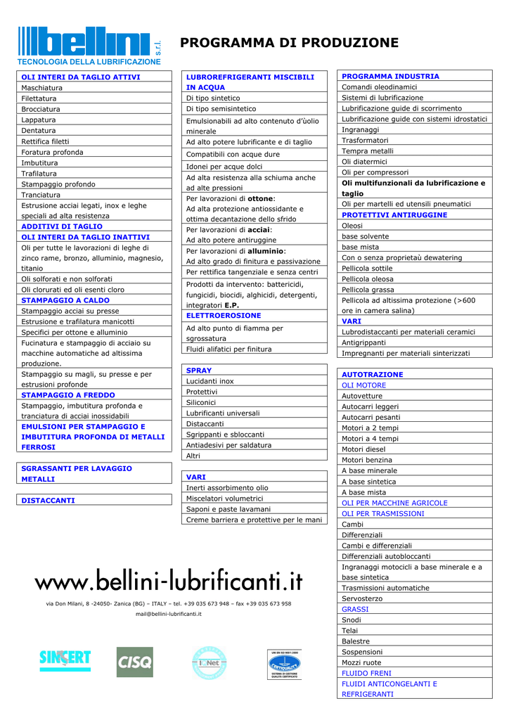 PROGRAMMA DI PRODUZIONE TECNOLOGIA DELLA LUBRIFICAZIONE OLI INTERI DA TAGLIO ATTIVI LUBROREFRIGERANTI MISCIBILI PROGRAMMA INDUSTRIA Maschiatura IN ACQUA Comandi oleodinamici Filettatura Di tipo sintetico Sistemi di lubrificazione Brocciatura Di tipo semisintetico Lubrificazione guide di scorrimento Lappatura Emulsionabili ad alto contenuto dāùolio Lubrificazione guide con sistemi idrostatici Dentatura minerale Ingranaggi Rettifica filetti Ad alto potere lubrificante e di taglio Trasformatori Foratura profonda Compatibili con acque dure Tempra metalli Imbutitura Idonei per acque dolci Trafilatura Ad alta resistenza alla schiuma anche Stampaggio profondo ad alte pressioni Tranciatura Estrusione acciai legati, inox e leghe speciali ad alta resistenza Ad alta protezione antiossidante e ottima decantazione dello sfrido ADDITIVI DI TAGLIO OLI INTERI DA TAGLIO INATTIVI Oli per tutte le lavorazioni di leghe di zinco rame, bronzo, alluminio, magnesio, titanio Per lavorazioni di acciai: Ad alto potere antiruggine Per lavorazioni di alluminio: Ad alto grado di finitura e passivazione Per rettifica tangenziale e senza centri Oli solforati e non solforati Prodotti da intervento: battericidi, Oli clorurati ed oli esenti cloro fungicidi, biocidi, alghicidi, detergenti, STAMPAGGIO A CALDO integratori E.P. Stampaggio acciai su presse ELETTROEROSIONE Estrusione e trafilatura manicotti Ad alto punto di fiamma per Specifici per ottone e alluminio Fucinatura e stampaggio di acciaio su macchine automatiche ad altissima produzione. Stampaggio su magli, su presse e per estrusioni profonde sgrossatura Fluidi alifatici per finitura SPRAY Lucidanti inox Protettivi STAMPAGGIO A FREDDO Stampaggio, imbutitura profonda e tranciatura di acciai inossidabili EMULSIONI PER STAMPAGGIO E IMBUTITURA PROFONDA DI METALLI FERROSI Per lavorazioni di ottone: Siliconici Lubrificanti universali Distaccanti Sgrippanti e sbloccanti Antiadesivi per saldatura Altri SGRASSANTI PER LAVAGGIO METALLI VARI Inerti assorbimento olio DISTACCANTI Miscelatori volumetrici Saponi e paste lavamani Creme barriera e protettive per le mani Oli diatermici Oli per compressori Oli multifunzionali da lubrificazione e taglio Oli per martelli ed utensili pneumatici PROTETTIVI ANTIRUGGINE Oleosi base solvente base mista Con o senza proprietaù dewatering Pellicola sottile Pellicola oleosa Pellicola grassa Pellicola ad altissima protezione (>600 ore in camera salina) VARI Lubrodistaccanti per materiali ceramici Antigrippanti Impregnanti per materiali sinterizzati AUTOTRAZIONE OLI MOTORE Autovetture Autocarri leggeri Autocarri pesanti Motori a 2 tempi Motori a 4 tempi Motori diesel Motori benzina A base minerale A base sintetica A base mista OLI PER MACCHINE AGRICOLE OLI PER TRASMISSIONI Cambi Differenziali Cambi e differenziali Differenziali autobloccanti www.bellini-lubrificanti.it via Don Milani, 8 -24050- Zanica (BG) ā ITALY ā tel. +39 035 673 948 ā fax +39 035 673 958 [email protected] Ingranaggi motocicli a base minerale e a base sintetica Trasmissioni automatiche Servosterzo GRASSI Snodi Telai Balestre Sospensioni Mozzi ruote FLUIDO FRENI FLUIDI ANTICONGELANTI E REFRIGERANTI