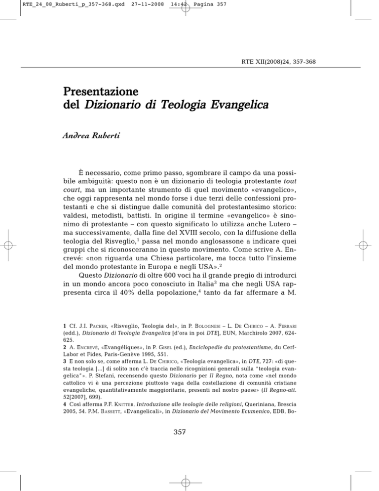 RTE_24_08_Ruberti_p_357-368.qxd 27-11-2008 14:42 Pagina 357 RTE XII(2008)24, 357-368 Presentazione del Dizionario di Teologia Evangelica Andrea Ruberti È necessario, come primo passo, sgombrare il campo da una possibile ambiguità: questo non è un dizionario di teologia protestante tout court, ma un importante strumento di quel movimento «evangelico», che oggi rappresenta nel mondo forse i due terzi delle confessioni protestanti e che si distingue dalle comunità del protestantesimo storico: valdesi, metodisti, battisti. In origine il termine «evangelico» è sinonimo di protestante – con questo significato lo utilizza anche Lutero – ma successivamente, dalla fine del XVIII secolo, con la diffusione della teologia del Risveglio,1 passa nel mondo anglosassone a indicare quei gruppi che si riconosceranno in questo movimento. Come scrive A. Encrevé: «non riguarda una Chiesa particolare, ma tocca tutto l’insieme del mondo protestante in Europa e negli USA».2 Questo Dizionario di oltre 600 voci ha il grande pregio di introdurci in un mondo ancora poco conosciuto in Italia3 ma che negli USA rappresenta circa il 40% della popolazione,4 tanto da far affermare a M. 1 Cf. J.I. PACKER, «Risveglio, Teologia del», in P. B OLOGNESI – L. DE CHIRICO – A. FERRARI (edd.), Dizionario di Teologia Evangelica [d’ora in poi DTE], EUN, Marchirolo 2007, 624625. 2 A. ENCREVÉ, «Evangéliques», in P. GISEL (ed.), Enciclopedie du protestantisme, du CerfLabor et Fides, Paris-Genève 1995, 551. 3 E non solo se, come afferma L. DE CHIRICO, «Teologia evangelica», in DTE, 727: «di questa teologia [...] di solito non c’è traccia nelle ricognizioni generali sulla “teologia evangelica”». P. Stefani, recensendo questo Dizionario per Il Regno, nota come «nel mondo cattolico vi è una percezione piuttosto vaga della costellazione di comunità cristiane evangeliche, quantitativamente maggioritarie, presenti nel nostro paese» (Il Regno-att. 52[2007], 699). 4 Così afferma P.F. KNITTER , Introduzione alle teologie delle religioni, Queriniana, Brescia 2005, 54. P.M. BASSETT, «Evangelicali», in Dizionario del Movimento Ecumenico, EDB, Bo- 357 RTE_24_08_Ruberti_p_357-368.qxd 27-11-2008 14:42 Pagina 358 RTE XII(2008)24 Matry: «considerare la religione americana e trascurare l’evangelicalismo e il fondamentalismo sarebbe paragonabile a scrutare il panorama fisico americano e ignorare le montagne rocciose».5 Una realtà la cui riflessione teologica è ancora meno conosciuta e considerata, perché ritenuta eccessivamente legata alla lettera della Bibbia e poco affinata speculativamente. 1. La teologia evangelica Evangelico, così come è definito da Leon Morris nel sito www.alleanzaevangelica.org, è «qualcuno che crede nell’autorità della Bibbia e nella salvezza attraverso l’accoglimento personale di Gesù Cristo». In questa stringata definizione possiamo facilmente riconoscere le colonne sulle quali si costruisce la teologia evangelica – che ha come riferimento la confessione di fede dell’Alleanza evangelica nata nel 1846 e in Italia nel 1974 –.6 a) La rigorosa importanza riconosciuta alla Scrittura. L’accoglienza dei metodi esegetici storico-critici non può annullare la divinità della Rivelazione e andare a detrimento della presenza del soprannaturale nella Bibbia la cui autorità rimane primaria e insostituibile: «ciò che conta è il diritto di Dio, non quello della ragione, della natura o di altro, per questo la sensibilità logna 1994, 524: «Sulla scena internazionale, i cristiani che si definiscono evangelicali sono tra i gruppi a più rapida crescita tra quelli che compongono la famiglia cristiana, soprattutto in America Latina». 5 M. MARTY, A Nation of Believers, University of Chicago Press, Chicago 1976, 80. 6 L’interesse alle questioni unitarie nell’alveo riformato in Italia ha dovuto fare i conti, per Antonino Ramirez (cf. voce «Alleanza Evangelica Italiana», in DTE, 17-18), con un generale disinteresse. Il tentativo più interessante fu quello del pastore valdese Paolo Geymonat (1864) che trovò però una forte opposizione. Solo un secolo dopo, nel 1965 al II Congresso delle Chiese evangeliche italiane rinacquero speranze unioniste segnando però la separazione tra i protestanti storici – che due anni dopo diedero vita alla Federazione delle Chiese evangeliche in Italia – e gli evangelici conservatori che si federarono nel 1974 dando vita al ramo italiano dell’Alleanza evangelica. Ramirez termina l’articolo continuando a denunciare lo «scarso ideale unitario che continua ad essere posposto agli interessi denominazionali» (Ivi, 18). 358 RTE_24_08_Ruberti_p_357-368.qxd 27-11-2008 14:42 Pagina 359 A. Ruberti, Presentazione del Dizionario di Teologia Evangelica moderna non può essere assunta come parametro interpretativo della Scrittura».7 b) Il riconoscimento della totale depravità dell’uomo, effetto devastante della corruzione del peccato, che esclude ogni capacità naturale umana di conoscere Dio. Questa radicalità è giustificata «a posteriori» dalla grandezza del rimedio necessario: la morte vicaria del Signore Gesù. c) Il valore della persona e dell’opera di Gesù Cristo che, in quanto vero Dio e vero uomo ha espiato il peccato in maniera totale e definitiva. d) La necessità dell’esperienza personale della conversione8 e quindi dell’evangelizzazione. Oltre che da queste colonne, la teologia evangelica – che non è monolitica, ma plurale, potendosi riconoscere in essa i filoni anglicano, arminiano, battista, dispensazionalista, luterano, riformato, carismatico/pentecostale – è segnata dalla ricerca di una profonda aderenza alle convinzioni del cristianesimo storico, del quale si considera erede e custode, senza cedimento alle tentazioni liberali e agli attacchi della modernità. Da questo confronto nasce la tendenza a un conservatorismo dottrinale che salvaguardi e rispetti i connotati tradizionali della fede. Inoltre si r