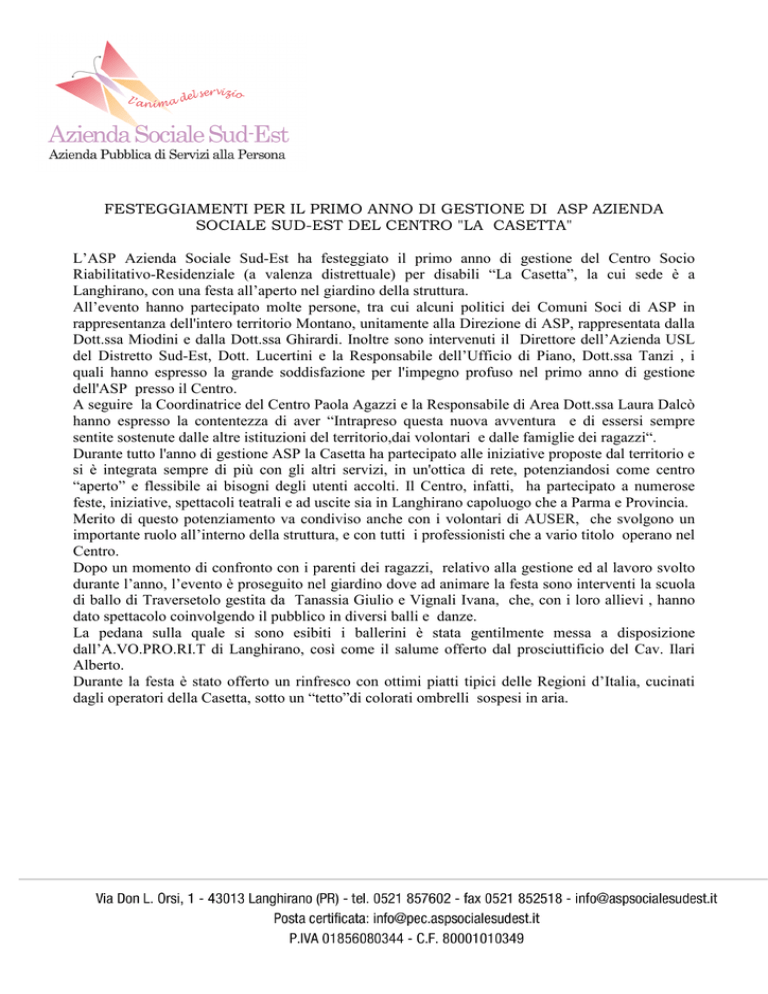 FESTEGGIAMENTI PER IL PRIMO ANNO DI GESTIONE DI ASP AZIENDA SOCIALE SUD-EST DEL CENTRO "LA CASETTA" L’ASP Azienda Sociale Sud-Est ha festeggiato il primo anno di gestione del Centro Socio Riabilitativo-Residenziale (a valenza distrettuale) per disabili “La Casetta”, la cui sede è a Langhirano, con una festa all’aperto nel giardino della struttura. All’evento hanno partecipato molte persone, tra cui alcuni politici dei Comuni Soci di ASP in rappresentanza dell'intero territorio Montano, unitamente alla Direzione di ASP, rappresentata dalla Dott.ssa Miodini e dalla Dott.ssa Ghirardi. Inoltre sono intervenuti il Direttore dell’Azienda USL del Distretto Sud-Est, Dott. Lucertini e la Responsabile dell’Ufficio di Piano, Dott.ssa Tanzi , i quali hanno espresso la grande soddisfazione per l'impegno profuso nel primo anno di gestione dell'ASP presso il Centro. A seguire la Coordinatrice del Centro Paola Agazzi e la Responsabile di Area Dott.ssa Laura Dalcò hanno espresso la contentezza di aver “Intrapreso questa nuova avventura e di essersi sempre sentite sostenute dalle altre istituzioni del territorio,dai volontari e dalle famiglie dei ragazzi“. Durante tutto l'anno di gestione ASP la Casetta ha partecipato alle iniziative proposte dal territorio e si è integrata sempre di più con gli altri servizi, in un'ottica di rete, potenziandosi come centro “aperto” e flessibile ai bisogni degli utenti accolti. Il Centro, infatti, ha partecipato a numerose feste, iniziative, spettacoli teatrali e ad uscite sia in Langhirano capoluogo che a Parma e Provincia. Merito di questo potenziamento va condiviso anche con i volontari di AUSER, che svolgono un importante ruolo all’interno della struttura, e con tutti i professionisti che a vario titolo operano nel Centro. Dopo un momento di confronto con i parenti dei ragazzi, relativo alla gestione ed al lavoro svolto durante l’anno, l’evento è proseguito nel giardino dove ad animare la festa sono interventi la scuola di ballo di Traversetolo gestita da Tanassia Giulio e Vignali Ivana, che, con i loro allievi , hanno dato spettacolo coinvolgendo il pubblico in diversi balli e danze. La pedana sulla quale si sono esibiti i ballerini è stata gentilmente messa a disposizione dall’A.VO.PRO.RI.T di Langhirano, così come il salume offerto dal prosciuttificio del Cav. Ilari Alberto. Durante la festa è stato offerto un rinfresco con ottimi piatti tipici delle Regioni d’Italia, cucinati dagli operatori della Casetta, sotto un “tetto”di colorati ombrelli sospesi in aria. Il gruppo dei ragazzi e degli operatori in occasione della festa