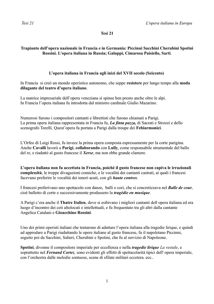 Tesi 21 L'opera italiana in Europa Tesi 21 Trapianto dell’opera nazionale in Francia e in Germania: Piccinni Sacchini Cherubini Spotini Rossini. L’opera italiana in Russia; Galuppi, Cimarosa Paisiello, Sarti. L’opera italiana in Francia agli inizi del XVII secolo (Seicento) In Francia si creò un mondo operistico autonomo, che seppe resistere per lungo tempo alla moda dilagante del teatro d’opera italiano. La matrice impresariale dell’opera veneziana si spinse ben presto anche oltre le alpi. In Francia l’opera italiana fu introdotta dal ministro cardinale Giulio Mazarino. Numerosi furono i compositori cantanti e librettisti che furono chiamati a Parigi. La prima opera italiana rappresentata in Francia fu, La finta pazza, di Sacrati e Strozzi e dello scenografo Torelli. Quest’opera fu portata a Parigi dalla troupe dei Febiarmonici. L’Orfeo di Luigi Rossi, fu invece la prima opera composta espressamente per la corte parigina. Anche Cavalli lavorò a Parigi, collaborando con Lully, come responsabile strumentale del ballo del re, e riadattò al gusto francese il Xerse, ma non ebbe grande clamore. L’opera italiana non fu accettata in Francia, poiché il gusto francese non capiva le irrazionali complessità, le troppe divagazioni comiche, e le vocalità dei cantanti castrati, ai quali i francesi facevano preferire le vocalità dei tenori acuti, con gli haute contres. I francesi preferivano uno spettacolo con danze, balli e cori, che si concretizzava nel Balle de cour, cioè balletto di corte e successivamente produssero la tragèdie en musique. A Parigi c’era anche il Thatre Italien, dove si esibivano i migliori cantanti dell opera italiana ed era luogo d’incontro dei ceti altolocati e intellettuali, e fu frequentato tra gli altri dalla cantante Angelica Catalani e Gioacchino Rossini. Uno dei primi operisti italiani che tentarono di adattare l’opera italiana alla tragedie lirique, e quindi ad approdare a Parigi riadattando le opere italiane al gusto francese, fu il napoletano Piccinni, seguito poi da Sacchini, Salieri, Cherubini e Spotini, che fu al servizio di Napoleone. Spotini, divenne il compositore imperiale per eccellenza e nella tragedie lirique La vestale, e soprattutto nel Fernand Cortez, sono evidenti gli effetti di spettacolarità tipici dell' opera imperiale, con l’orchestra dalle melodie sontuose, scene di sfilate militari eccetera. ecc.. 1 Tesi 21 L'opera italiana in Europa Cherubini Luigi Cherubini, (1760-1842) dopo la formazione italiana avvenuta sotto la guida di Sarti, divenne anche direttore del conservatorio di Parigi. Scrisse quattro opere comiques, tra cui si ricorda la Lodoiska del 1781, dove si denota una accresciuta importanza musicale e drammatica dell’orchestra e una forza espressiva dei numerosi pezzi d’insieme, come il lungo quintetto finale del atto III. La vicenda è ambientata in Polonia nel Seicento dove una fanciulla Lodoiska è tenuta prigioniera in un cupo castello ed è liberata dopo lunghe peripezie dal suo eroico innamorato Floreski. Ma è soprattutto in Medea, che Cherubini, diede un’impressionate immediatezza tutta incentrata sulla figura della protagonista. Tra le numerose altre composizioni di Cherubini , che tra il 1773 e il 1835 scrisse la musica per oltre trenta opere teatrali, si ricorda anche l' opera, Les deux journées del 1800, oltre a mottetti, cantate e quartetti per archi. Spotini Gaspare Spotini, (1774-1851)compositore di formazione napoletana, nel 1803 si trasferì in Francia: fu l'inizio di una carriera di grandi successi. Compose opere che diventeranno famose: il Milton nel 1804, La Vestale nel 1807, Fernando Cortez nel 1809 e l'Olimpia nel 1819, che lo proietteranno ai più alti onori presso la corte di Napoleone prima e di Luigi XVIII poi. In particolare, trionfale fu l'accoglienza de La Vestale, tragédie lyrique neoclassica esemplare, degna di rappresentare un'intera epoca, replicata ben 200 volte. Nel 1819 Spontini si trasferi in Germania, dove ebbe la carica di Generalmusckdirektor di Berlino. Piccinni Niccolò Piccinni,(1720-1800) compositore napoletano, si formò alla scuola di Durante. La sua prima opera, fu Le donne dispettose, e risale al 1755, e nel 1760 compose, a Roma, il suo capolavoro giovanile, La Cecchina ossia La buona figliuola, un'opera buffa che ebbe molto successo in Europa. Sei anni dopo, Piccinni fu invitato dalla regina Maria Antonietta a Parigi. Tutti i suoi lavori successivi furono un successo; ma i direttori della Grand Opera gli opposero deliberatamente Christoph Willibald Gluck, persuadendo i due compositori a trattare lo stesso soggetto ossia Iphigenie en Tauride, contemporaneamente. Il pubblico parigino si divise in due, Gluckisti e Piccinniani. L' Iphigenie di Gluck apparse prima, il 18 maggio 1779. L' Iphigenie di Piccinni giunse il 23 gennaio 1781, e, sebbene ripetuta per diciassette volte, scomparve nell'oblio. L'antagonismo tra il pubblico continuò, anche dopo che Gluck lasciò Parigi nel 1780.Successivamente si accese anche una certa rivalità con Sacchini. 2 Tesi 21 L'opera italiana in Europa Sacchini Antonio Sacchini,(1730-1786) fu un compositore appartenente alla scuola napoletana, e quando nel 1782 arrivò a Parigi, destò poca sensazione, poiché si era ancora occupati con le contese tra gluckisti e piccinnisti; Il principe Giuseppe II, lo raccomandò a sua sorella cioè Maria Antonietta regina di Francia, la cui protezione gli permise di rappresentazione le sue opere. Riadattò quindi il suo Rinaldo per il pubblico francese. Nuove scene vi erano state aggiunte, oltre alle danze e diverse arie vennero eliminate. Gioacchino Rossini in Francia : il Guglielmo Tell Il Guglielmo Tell è un lavoro di proporzioni imponenti. Nell'edizione, senza tagli, la sua durata si estendeva a quasi sei ore. L'opera è divisa in quattro atti, con azioni coreografiche, momenti di danza e scene spettacolari, e rappresenta di fatto l'atto di nascita di quello che verrà definito il ge