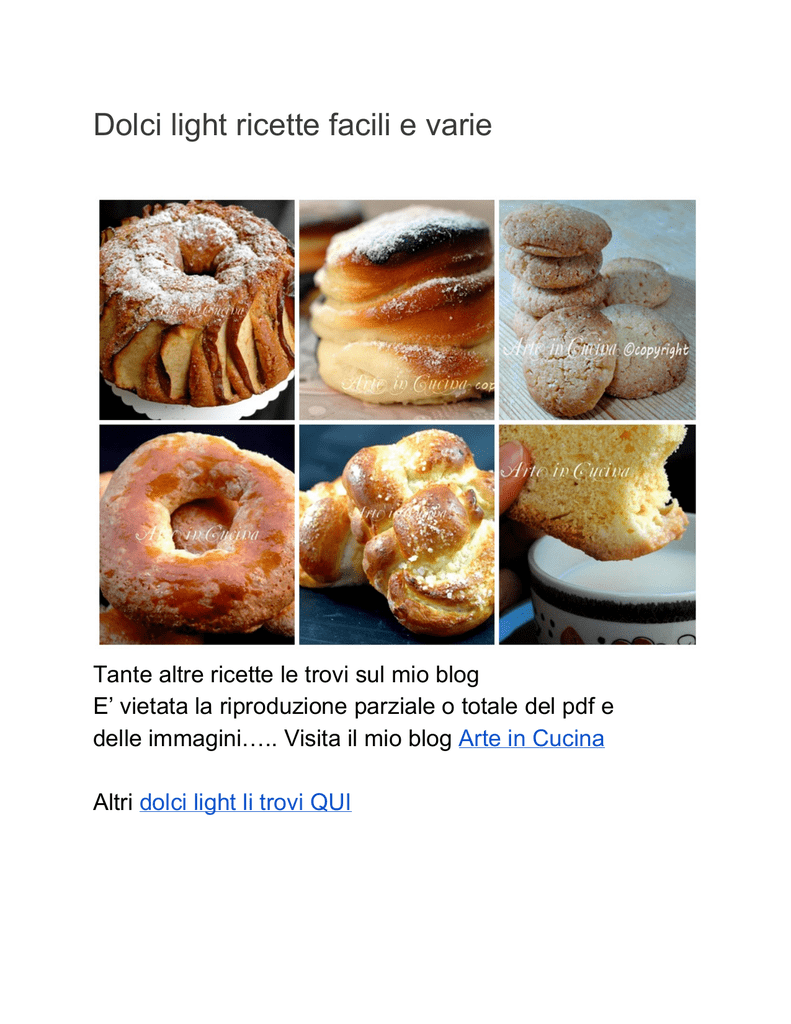 Dolci light ricette facili e varie Tante altre ricette le trovi sul mio blog E’ vietata la riproduzione parziale o totale del pdf e delle immagini….. Visita il mio blog Arte in Cucina Altri dolci light li trovi QUI Brioche senza burro latte e uova La ricetta di queste brioche senza burro latte e uova è davvero semplice, contrariamente a quanto si possa pensare sono sofficissime, profumate e leggere! Brioche senza burro QUI altre brioche Ricetta: Brioche senza burro latte e uova Ingredienti ● ● ● ● ● ● ● ● ● ● 500 gr di farina 00 1/2 cubetto di lievito 80 gr di zucchero di canna buccia di un limone 200 ml di latte di acqua o latte di soia o di riso 50 gr di banana 50 ml di succo di limone 30 ml di olio di semi di mais nutella fatta in casa o marmellata Spennellare con una miscela di acqua o latte e zucchero di canna Procedimento 1. 2. 3. 4. 5. Sciogliere il lievito nell’acqua o latte Schiacciate per bene la banana. Grattugiare la buccia di limone. Versate nella ciotola, aggiungere metà della farina e avviate la macchina. Aggiungete il resto degli ingredienti, lasciate lavorare 1 minuto e aggiungete la restante farina. 6. Impastate per bene l’impasto che deve risultare sodo e non appiccicoso. 7. Mettete a lievitare fino al raddoppio circa 3 ore. 8. Stendete l’impasto e ritagliatelo con un coppapasta, ogni brioche deve essere formata da 3 dischi, spennellate con una miscela di latte o acqua e zucchero, farcite e mettete a lievitare nel forno tiepido 20 minuti. 9. Con il bimby: 10. Sciogliere il lievito nell’acqua o latte 30 sec vel 1 11. Tritare la buccia di limone con banana e zucchero 30 sec vel turbo. 12. Inserire gli ingredienti nella ciotola e impastare tasto spiga 3 minuti. 13. Cuocete in forno caldo a 200° circa 15 minuti. 14. Bon appétit.. Biscotti light al limone con farina di mais Una ricetta facile e veloce, questi biscotti light al limone vanno a ruba! la farina di mais li rende croccanti, rustici, anche grazie allo zucchero di canna Ricetta: Biscotti al limone con farina di mais Ingredienti ● ● ● ● ● ● 150 grammi di farina di mais bianca 100 grammi di farina 00 o di riso 125 gr di margarina fatta in casa o burro 80 grammi di zucchero di canna 1 tuorlo buccia di un limone Procedimento 1. Tritare la buccia con lo zucchero. 2. Aggiungere la farina, il tuorlo e la margarina, impastare per bene, formate un panetto e mettete in frigo per 30 minuti. 3. Accendete il forno a 180° 4. Prelevate l’impasto e formate tante palline infarinandovi un po’ le mani con la farina di mais, schiacciatele e sistematele su carta forno. 5. Infornate per circa 20 minuti, devono dorare. 6. Lasciateli raffreddare su una gratella. 7. Bon appétit Altre ricette di biscotti light QUI Ciambella al cacao e mele senza burro soffice per colazione La ricetta è semplice, un dolce che si realizza in poco tempo, è molto soffice, senza burro, all’olio, leggera, buona davvero, si scioglie in bocca. Ricetta: Ciambella al cacao e mele senza burro soffice per colazione Ingredienti ● 500 gr di farina 00 ● 4 uova ● 130 gr di olio ● 150 ml di latte (anche senza lattosio) ● 200 gr di zucchero ● 1 bustina di lievito per dolci ● 2 cucchiai di cacao amaro ● 1 mela Procedimento 1. Lavorate le uova con lo zucchero finchè non saranno belle spumose. 2. Accendete il forno a 180° 3. Aggiungete la farina setacciata alternando con olio e latte, infine cacao e lievito. 4. Rivestite uno stampo a ciambella versate il composto. 5. Tagliate a fette una mela e disponetele sulla torta accavallandole un po’ cospargete di zucchero di canna e infornate per circa 4550 minuti. 6. Fate la prova stecchino dopo i 40 minuti. 7. Sfornate lasciate raffreddare prima di servire.. 8. Bon appétit.. Ricette colazione anche QUI Ti potrebbero interessare: ● Ricette pizze e focacce ● Ricette feste di compleanno Ciambelline all’arancia e miele Deliziose e profumate le ciambelline alla arancia e mandorle veloci senza latte e uova! una ricetta semplice, dolci sardi alle mandorle tostate, con buccia d’arancia una semplicità unica! Ti può interessare: ● Ricette della Sardegna ● Dolci Ricetta: Ciambelline alla arancia e mandorle veloci senza latte e uova Ingredienti ● ● ● ● ● ● ● ● ● ● ● ● 1 kg di farina 800 grammi di mandorle tostate 800 grammi di zucchero 2 mandarini (sostituito con arancia) 2 arance 1 lievito per dolci 1 buccia limone grattugiato 2 bucce d’arancia grattugiate 1 fiala di fior d’arancio cannella 2 vanillina 1 uovo per spennellare (da omettere in caso di intolleranze) Procedimento 1. Spremere arance e mandarini in modo da ottenere 250 cl di liquido, aggiungere la farina, aggiungere metà delle mandorle tritate, l’altra metà intere. 2. Aggiungere tutti gli ingredienti, formare un panetto e tagliare a pezzetti; formare dei filoncini e chiudere a ciambelle, spennellarle con uovo, sistemare sulla leccarda e cuocere a 180° 1520 minuti Torta al limone con farina di riso Adoro le torte agli agrumi, le torte semplici, leggere, sono quelle che puoi mangiare a colazione, o con il the. Ti può interessare: ● ● ● Ricette senza glutine Dolci Tutte le mie ricette Ricetta: Torta al limone con farina di riso senza glutine Ingredienti ● ● ● ● ● ● ● ● ● 35 grammi di farina di riso 25 grammi di maizena 25 grammi di zucchero di canna 25 grammi di zucchero a velo 2 uova 1 limone 1/2 bustina di lievito per dolci 2 cucchiai di panna o yogurt 2 cucchiai semi di papavero Procedimento 1. Lavorare zucchero e uova insieme se avete un buon frullatore, per 20 minuti. 2. Oppure montate separatemente gli albumi dai rossi con lo zucchero. 3. Unite lentamente il succo del limone con la macchina in movimento, aggiungete la buccia, i semini di papavero, la panna o yogurt e successivamente le farine setacciate con il lievito. 4. Se montate i rossi e albumi separatamente unite la le farine, limone e panna ai rossi e poi aggiungete gli albumi. 