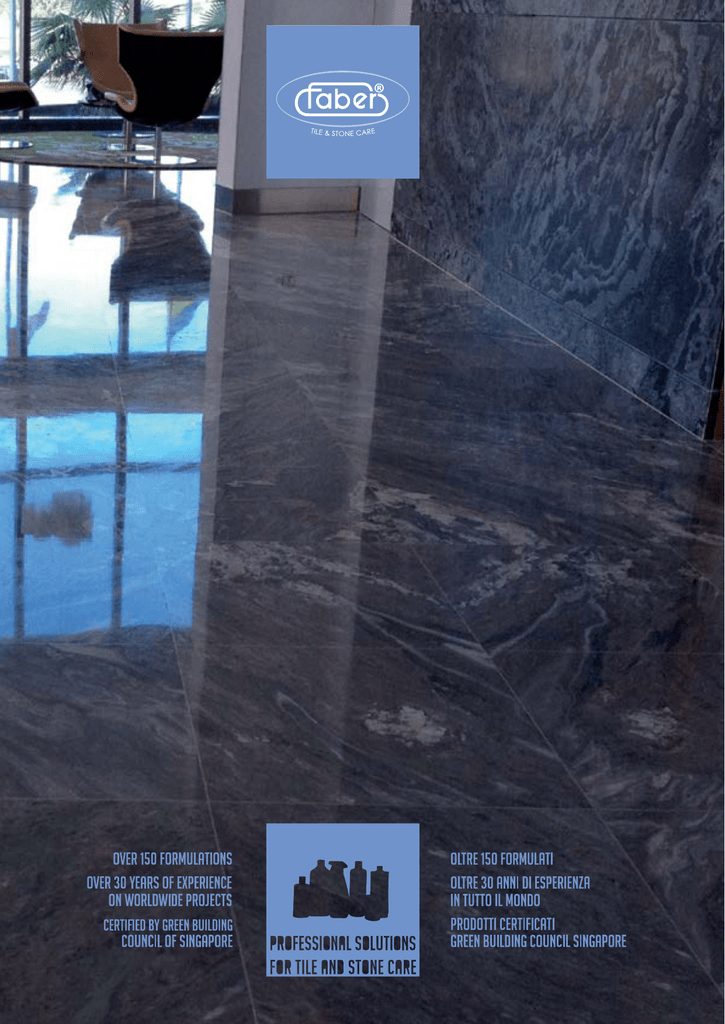 1 2 over 150 formulations OLTRE 150 FORMULATI over 30 years of experience on worldwide projects OLTRE 30 ANNI DI ESPERIENZA IN TUTTO IL MONDO certified by green building council of Singapore PRODOTTI CERTIFICATI GREEN BUILDING council SINGAPORE 3 FABER CHIMICA s.r.l. was founded in 1986 in Fabriano (Ancona), in the heart of Italy. The company operates in the specialized field of professional chemicals for the treatment, maintenance and restoration of all masonry surfaces such as gres and porcelain, ceramic, terracotta, klinker, craquelè, stone, marble, granite, agglomerate and wood surfaces. Right from the beginning FABER CHIMICA s.r.l. has focused its core business on major Italian and overseas stone and ceramic manufacturers, developing over time important technical partnerships which have allowed us to develop up to today, “easy to use”, professional products which are currently used on various projects. Thanks to the company initiative and tenacity, FABER CHIMICA s.r.l. has increased its market presence within the Italian and International markets, Europe and the Middle East, as well as in the Asian countries such as Hong Kong, China, Taiwan and Japan where Faber Chimica has been operating for years. Innovation, development and ability in facing new challenges make the company from Fabriano a everyday reality for its technical know-how and respect within the market, an un-disputed leader in the field of professional chemicals for its reliability and quality. Faber Chimica srl. nasce nel 1986 a Fabriano, in provincia di Ancona nel cuore dell’Italia. Opera nel settore specifico dei prodotti chimici professionali, per il trattamento, la manutenzione di pareti e pavimenti ed il ripristino di tutte le superfici edili, come gres porcellanato, ceramica, cotto e terrecotte, clinker, craquelet, pietre, marmo, granito, agglomerati, legno ecc. Sin dall’inizio Faber Chimica si è rivolta direttamente alle aziende produttrici di materiali lapidei e ceramici sia in Italia che all’estero, sviluppando nel tempo importanti collaborazioni che hanno permesso ad oggi di sviluppare prodotti professionali per trattamenti di superfici di facile utilizzo, che vengono impiegati in moltissimi progetti. Grazie all’intraprendenza ed alla tenacia dell’azienda, Faber Chimica negli anni ha ampliato sia la propria realtà in Italia, nei mercati esteri, quali Europa e medio oriente, e la propria presenza nei paesi Asiatici come Hong Kong, China, Taiwan, Giappone, dove è presente da anni. Innovazione, sviluppo, capacità di affrontare nuove sfide, fanno dell’azienda di Fabriano oggi giorno una realtà per competenza tecnica e rispetto nel mercato, leader indiscussa nel settore prodotti chimici professionali anche in termini di affidabilità e qualità. 4 YAS HOTEL ABU DHABI 80.000 sq.mt treated with our Protex indice PRODUCTS NOT IN CATALOGUE PRODOTTI NON A CATALOGO SEALERS IMPREGNANTI HIDRO PROTECTOR MM HIDRO SST HIDRO 500 ECO LIMESTONE DENSIFIER PROTEX WB SOL 170 CONCRETE HARDNER DEEP ENHANCER P147 PROTEX PRO TW LUX SAFE MARBLE HIDRO 150 YS ONE 7 7 7 7 7 10 10 10 10 10 10 11 11 11 AC300 B1 700 BSH20 DEEP EHNANCER BLACK HIDRO 300 HIDRO 500 HIDROFAB HIDROFAB A/R MA 90 P147 BLACK P211/B PAVING LUX PAVING MAT WS 800 STAIN REMOVERS - SMACCHIATORI MARGEL PLUS NO MAC GEL NO OIL NO RUG OXIDANT ANTIOX POULTICE DEC 31 POOLGRESS 14 14 14 14 14 14 15 GRAFFGEL A1 YELLOW PLUS CRISTALFAB C130 NEW K 400 LIQUID WAX TRANSPARENT SOLID WAX TRANSPARENT TILE POWDER MANU POLISHING - LUCIDATURA A1 GREY A1 YELLOW A3 YELLOW A4 YELLOW K 100 K 400 NEW K 500 STAR SHINE TILE CREAM 18 18 18 18 18 18 19 19 19 GL 88 SOLID TRANSPARENT GL 88 SEMI SOLID WHITE GL 88 FLUID CRYSTAL GL 88 SOLID CRYSTAL GL 34 EPOXY A+B GL 80 EPOXY A+B GL 88 SEMI SOLID BLACK GL 88 SEMI SOLID LIGHT GREY MAINTENANCE - MANUTENZIONE ALGAFLOOR COTTOSOLV DEC 21 DECERA P DISYCOTT NEUGEL DETERFUG FLOOR MACHINE WARRIOR 2,5 HP DAIITI-METAL BOND DIAMOND DISC #100 DAIITI-FLOOR DISC #50 DAIITI-FLOOR DISC #100 DAIITI-FLOOR DISC #200 DAIITI-FLOOR DISC #400 DAIITI-FLOOR DISC #800 DAIITI-FLOOR DISC #1500 DAIITI-FLOOR DISC #3000 CRYSTAL STONE POLISHING #1500 CRYSTAL STONE POLISHING #3000 LAMBS WOOL STICK FOR LAMBS WOOL COMPLETE LAMBS WOOL WAXER KIT OTHERS 22 22 22 22 22 22 23 5 6 LA FILOSOFIA GREEN DI FABER FABER GREEN PHILOSOPHY Faber Chimica si è sempre concentrata nello sviluppo di formulati a minor impatto ambientale ed a tutela della salute umana. Questo percorso, che nasce dall’attenta ricerca di materie prime biodegradabili, di origine vegetale, VOC FREE, ed utilizzabili anche in cosmetica, ha portato alla nascita di due nuove linee di prodotti. Faber Chimica has always been focused in developing formulates with lowest environmental impact and in safeguarding human health. This path, born from the careful research of biodegradable raw materials of vegetable origin, VOC FREE, and also suitable for the cosmetic domain, has brought to life two new lines of products. 7 ecosealer, philosophy The Ecofriendly philosophy in 3 concepts.. voc free biodegradabile ecofriendly I prodotti VOC FREE sono ESENTI da COMPOSTI ORGANICI VOLATILI, responsabili del rilascio nell’aria di sostanza dannose per l’uomo e per l’ambiente. i prodotti BIODEGRADABILI si decompongono nell’ambiente in tempi ridotti senza generare sostanze dannose per l’uomo e per l’ambiente. Per Faber ECOFRIENDLY significa; materie prime di origine vegetale utilizzate anche nella cosmetica, VOC FREE e biodegradabili. VOC FREE products are EXEMPT FROM VOLATILE ORGANIC COMPOUNDS, responsible for releasing in the air harmful substances both for human health and for the environment. BIODEGRADABLE products decompose in the environment in a short time without producing any harmful substance for the human health and for the environment. To Faber ECOFRIENDLY means: raw materials of vegetable origin, VOC FREE, for the cosmetics and biodegradable. E 1 0 1 4 0 E S I O C IFI I S RT RT IFI E O 0 9 0 D E D C Certifi