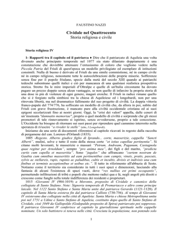 FAUSTINO NAZZI Cividale nel Quattrocento Storia religiosa e civile Storia religiosa IV 1- Rapporti tra il capitolo ed il patriarca ♦ Dire che il patriarcato di Aquileia una volta divenuto anche principato temporale nel 1077 sia stato dilaniato doppiamente è una constatazione che dovrebbe attenuare l’entusiasmo di coloro che vogliono vedere nella Piccola Patria del Friuli di quest'epoca un modello privilegiato ed esemplare di istituzioni consimili. Nulla di buono è derivato al Friuli da una simile commistione, né in campo civile né in campo religioso, nonostante tutte le autocelebrazioni delle proprie miserie. Sofferenze senza fine per il popolo friulano, specie dalla metà del secolo XIII quando ai patriarchi tedeschi subentrano quelli italici e ciò per mancanza di una qualsiasi realistica prospettiva storica. Stretto fra le mire imperiali d’Oltralpe e quelle di un'Italia circostante ha dovuto pagare un prezzo doppio senza alcun vantaggio, se non quello di infarcire la propria storia di una dose in più di violenze di ogni genere, magari eroiche. Il Friuli in radice rimane quello che si è forgiato nella simbiosi tra la chiesa di Aquileiese ed i longobardi, non per una ritrovata libertà, ma nel drammatico fallimento del suo progetto di civiltà. La doppia vittoria franco-papale del 774/776, ha soffocato un modello di civiltà che, da allora in poi, subìto dal Friuli con grave frustrazione, è mancato pure alla civiltà occidentale cristiana ed ai suoi epigoni secolarizzati fino ai nostri giorni. Oggi, la “crisi dei valori" appella, dalle ceneri di un’insensata "damnatio memoriae", proprio a quel modello di civiltà e sorprende che gli stessi promotori di tale rinnovamento si ispirino, senza avvedersene, proprio a tale concezione. L'Occidente ha bisogno di ritornare sui suoi passi per riprendere quel cammino interrotto nella speranza di ri/uscire “a riveder le stelle” (sito, I Longobardi). Iniziamo da una serie di documenti riferentesi al capitolo ricavati in regesto dalla raccolta di pergamene del can. Lorenzo d'Orlandi (1835). 1005 -Regesto. Alberto giudice figlio di Iprando... corte, masserizie, cappella “Sancti Alberti”, mulini, selve e tutto il resto della stessa corte “et istius capellae pertinentia”. Si citano molti lavoranti, le masserizie o massari “Petrum, Andream, Paganum, Castagnola quae regitur per Arnoldum”, sempre “pro anima mea”, dei figli e del marito, “predicta curtis cum capella et masseritia”. Sono “jugales” che affrancano “curtem nostram de Gaubia cum omnibus masseritiis ad eam pertinentibus cum campis, vineis, pratis, pascuis, sylvis ac stellareis, rupis, rupinis ac paludibus, cultis et incultis, divisis et indivisis una cum finibus et terminis acceptionibus et usibus etc.”. Il tutto in riferimento all'abbazia di Sesto. Notiamo come il territorio sia considerato in tutti i suoi spazi e dimensioni, lasciando alla fantasia di alcuni l'esistenza di spazi vuoti, dove “res nullius est primi occupantis”, permettendo infiltrazioni di tribù e popoli che mettono radici qua e là, negli angoli più dissiti e crescono come funghi nella totale indifferenza dei residenti e proprietari. 1015 -Giovanni IV (984-1019) a Moronto, preposito di Cividale e canonico della collegiata di Santo Stefano. Note: Signoria temporale di Premariacco e altro come principe laicale. Nel 1122 Santo Stefano e Santa Maria unite dal patriarca Gerardo (1121-1128). Il capitolo di Santa Maria esisteva fin dal patriarca Callisto (730-756). Al tempo di Giovanni IV esistevano due collegiate nella città di Aquileia: Santa Maria e chiesa Metropolitana unita poi nel 1751 a Udine e Santo Stefano di Aquileia, costituito dopo quello di Santo Stefano di Cividale, cioè 1049 da Gallopoldo (Godepaldo preposito di Spira) patriarcato poi soppresso. Il patriarca Giovanni IV conferisce al capitolo la giurisdizione spirituale nelle cappelle nominate. Un solo battistero si teneva nelle città. Cresciuta la popolazione, non potendo solo 1 il vescovo ecc. anche i capitoli amministravano i sacramenti, dirigevano cappelle ossia parrocchie. (Cita dall'abate Fumagalli). Nasce da questo diploma di Giovanni IV l’autorità del capitolo di Cividale che prima non esercitava che il vescovo stesso. Tutte le successive bolle e diplomi scaturiscono da questo primo. Giovanni IV amico e consigliere di Enrico II imperatore (973-1024) che convinse i papi a concedere autorità anche laicali: fodero, copulatico, cattedratico ecc.-. La struttura temporale del patriarcato di Aquileia stava nei fatti più che nelle intenzioni degli imperatori. La vicenda aquileiese rientra nell'ordinaria temporalizzazione della chiesa che è uno dei tanti esiti inevitabili dell'evanescenza parusiaca. I papi, patriarchi, vescovi, abati ecc. rientrano nella gestione media di qualsiasi altro potere temporale, perché ciò che fa il potere è il possesso non la santità. 1122 -Placito sinodale “cum integra justitia” del patriarca Gerardo (1121-1128), concesso al capitolo di Cividale (DELLA TORRE 1836). Il placito veniva amministrato dall'arcidiacono del capitolo e comportava l'amministrazione della giustizia “unitaria”, cioè civile e religiosa. Col tempo le due giustizie si divideranno riservando alla istituzione ecclesiastica gli aspetti religiosi. 1161 -Il patriarca Pellegrino I (1132-1161) conferma donazione al capitolo di Cividale fatta dal sacerdote Volrico di alcuni masi in Albana, Prepotto e Pradelle. Pellegrino è figlio di Enrico II duca di Carinzia-. Le conferme intervenivano per togliere abusi e soprusi da parte di concorrenti laicali ed istituzionali. 1165 -Donazione al preposito Tommaso e capitolo di Cividale di un maso in Grupignano, fatta dal patriarca Wolrico II (figlio di Wolfrido conte di Trewen in Carinzia)-. Prepositura e capitolo erano ancora distinti e l'azione pastorale delle vicarie dipendenti era gestita dalla prepositura. 1167 -Wolrico patriarca dona alla chiesa di Santa Maria di