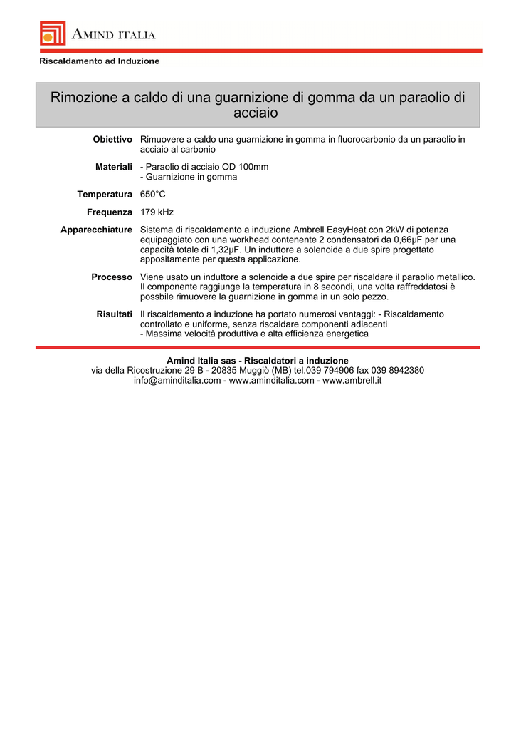 Rimozione a caldo di una guarnizione di gomma da un paraolio di acciaio Obiettivo Rimuovere a caldo una guarnizione in gomma in fluorocarbonio da un paraolio in acciaio al carbonio Materiali - Paraolio di acciaio OD 100mm - Guarnizione in gomma Temperatura 650°C Frequenza 179 kHz Apparecchiature Sistema di riscaldamento a induzione Ambrell EasyHeat con 2kW di potenza equipaggiato con una workhead contenente 2 condensatori da 0,66µF per una capacità totale di 1,32µF. Un induttore a solenoide a due spire progettato appositamente per questa applicazione. Processo Viene usato un induttore a solenoide a due spire per riscaldare il paraolio metallico. Il componente raggiunge la temperatura in 8 secondi, una volta raffreddatosi è possbile rimuovere la guarnizione in gomma in un solo pezzo. Risultati Il riscaldamento a induzione ha portato numerosi vantaggi: - Riscaldamento controllato e uniforme, senza riscaldare componenti adiacenti - Massima velocità produttiva e alta efficienza energetica Amind Italia sas - Riscaldatori a induzione via della Ricostruzione 29 B - 20835 Muggiò (MB) tel.039 794906 fax 039 8942380 [email protected] - www.aminditalia.com - www.ambrell.it